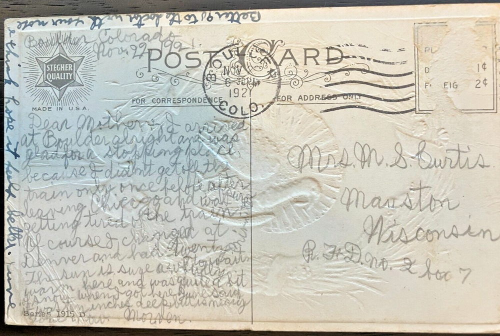 Antique postcard: Thanksgiving Greetings with a turkey posed in a wreath of hay wrapped in gold ribbon and a bow. Posted