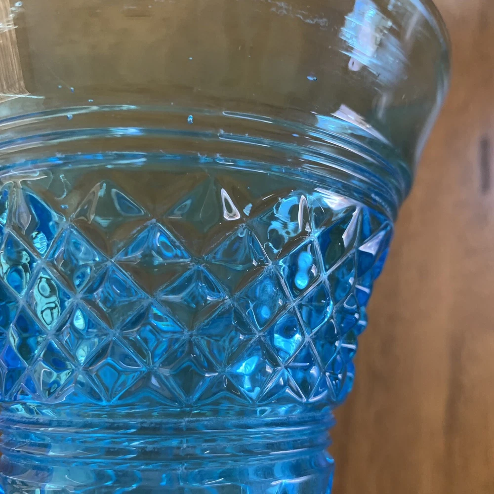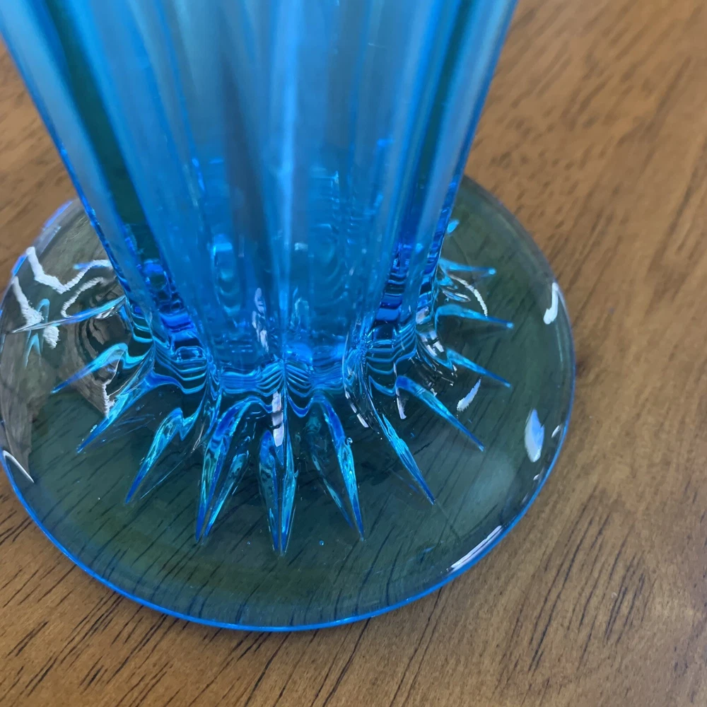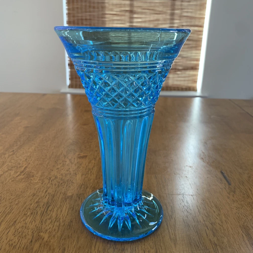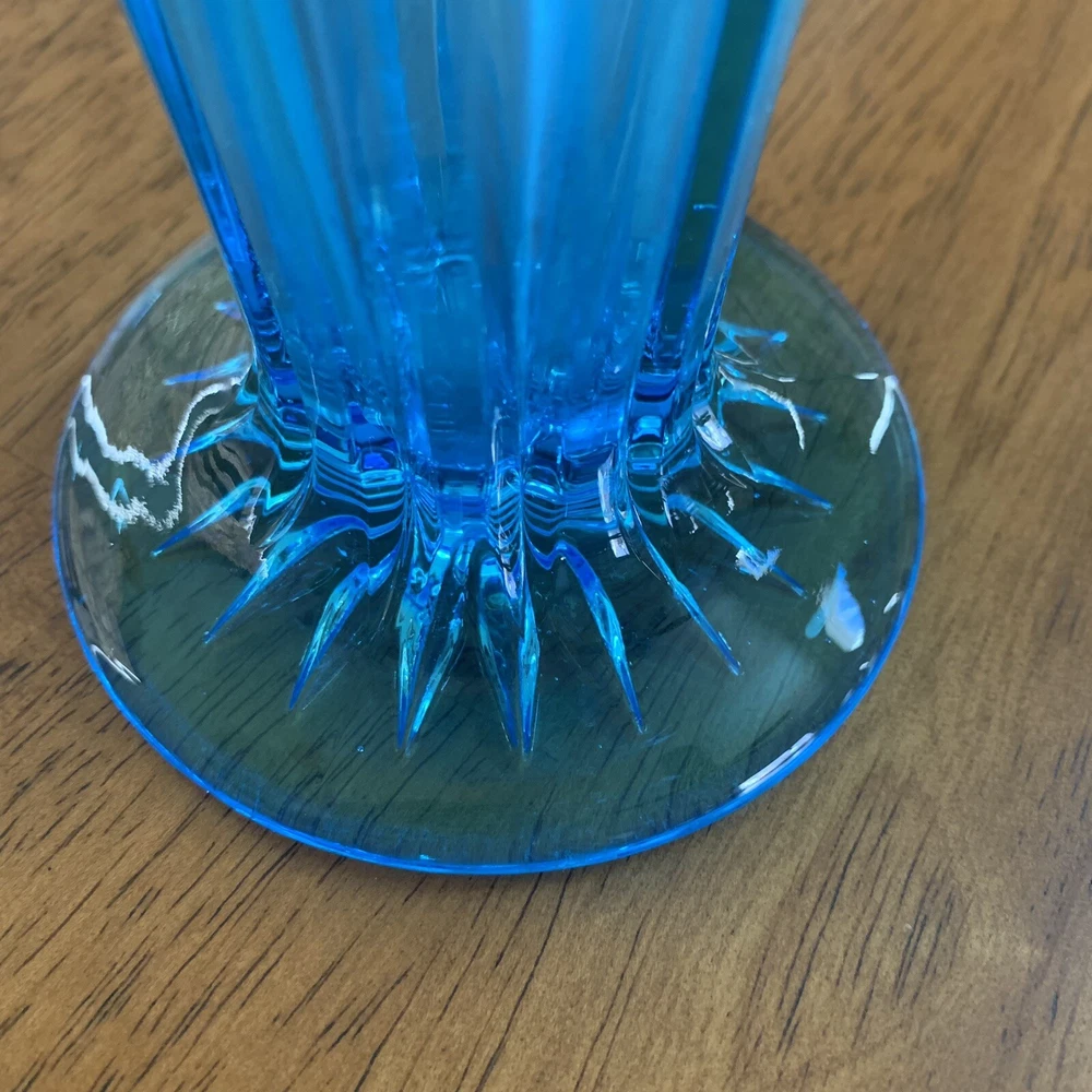 Gorgeous Tiffin-Francisan Baronial Blue Vase Rare Find 1920s. This is a really pretty blue color. Very small chip on upper outside rim as pointed out in picture number 7. Size of chip is approximately the diameter of tip of pointer. Small amount of wear on inside of upper rim most likely consistent with age. No other chips cracks. Please see photos.