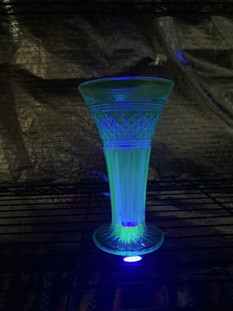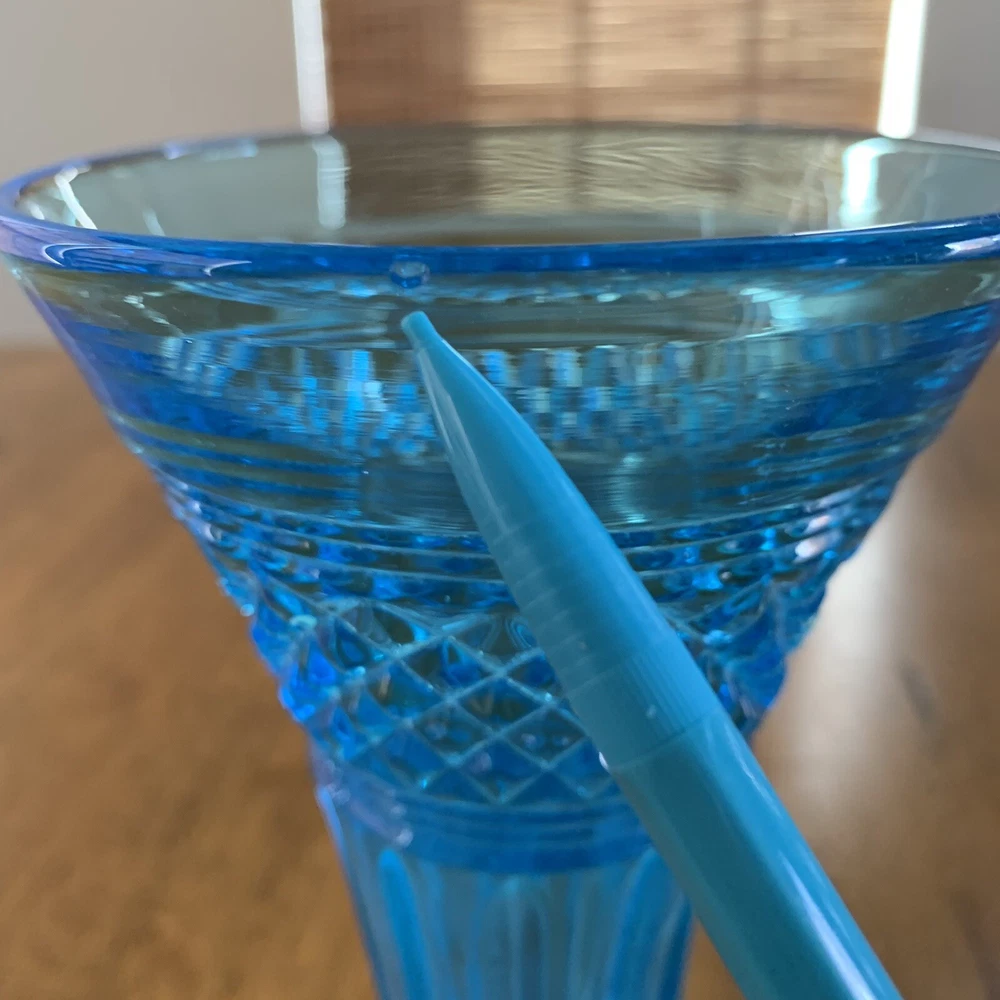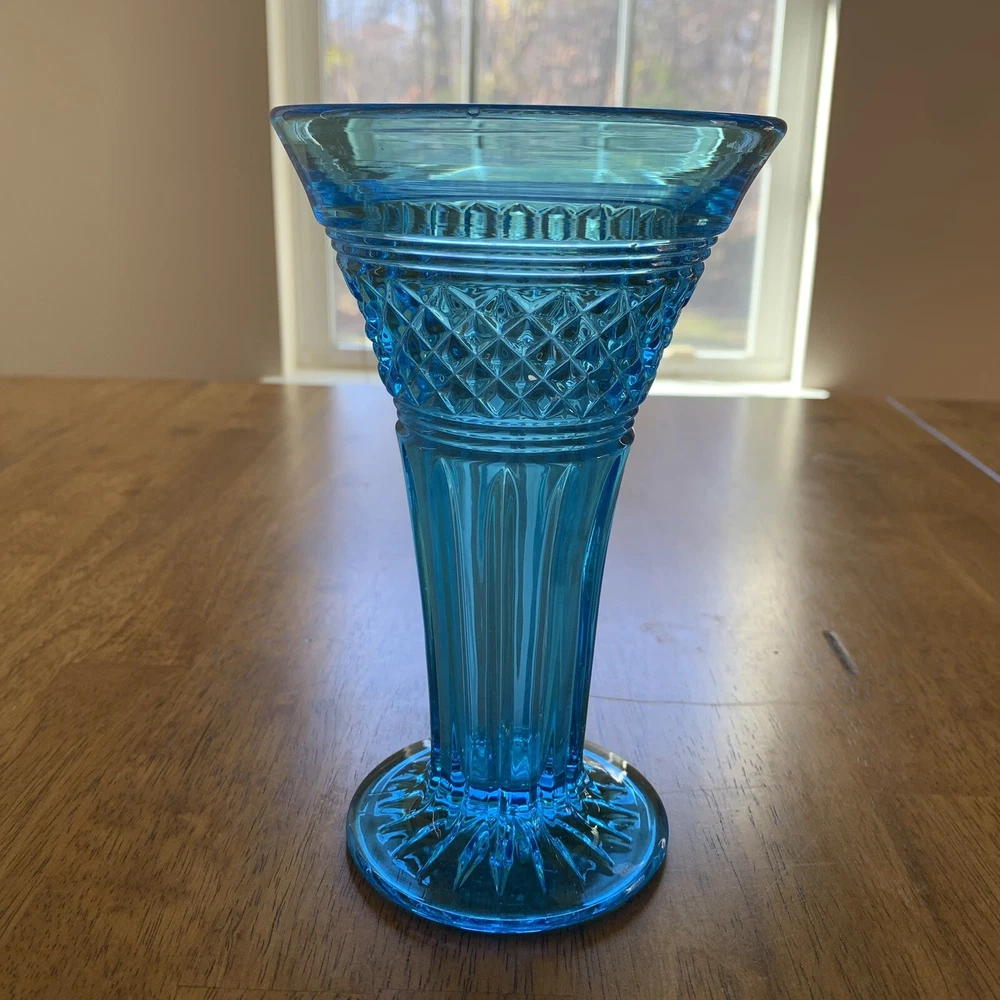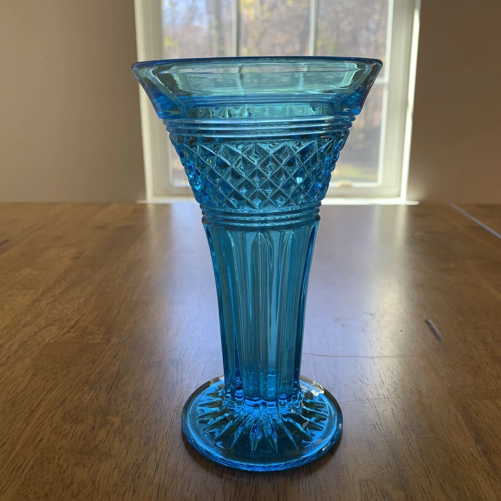 Gorgeous Tiffin-Francisan Baronial Blue Vase Rare Find 1920s. This is a really pretty blue color. Very small chip on upper outside rim as pointed out in picture number 7. Size of chip is approximately the diameter of tip of pointer. Small amount of wear on inside of upper rim most likely consistent with age. No other chips cracks. Please see photos.