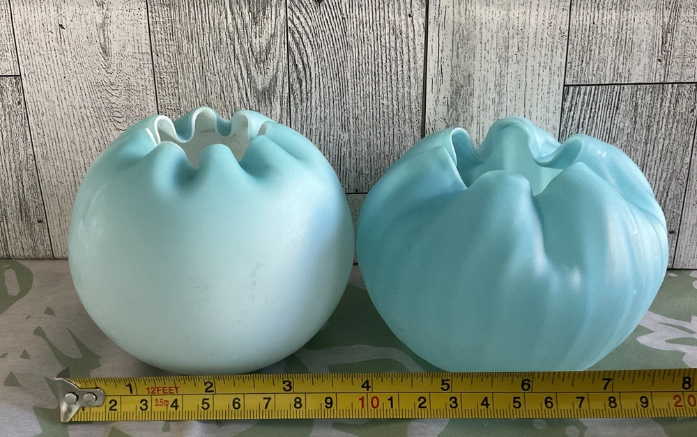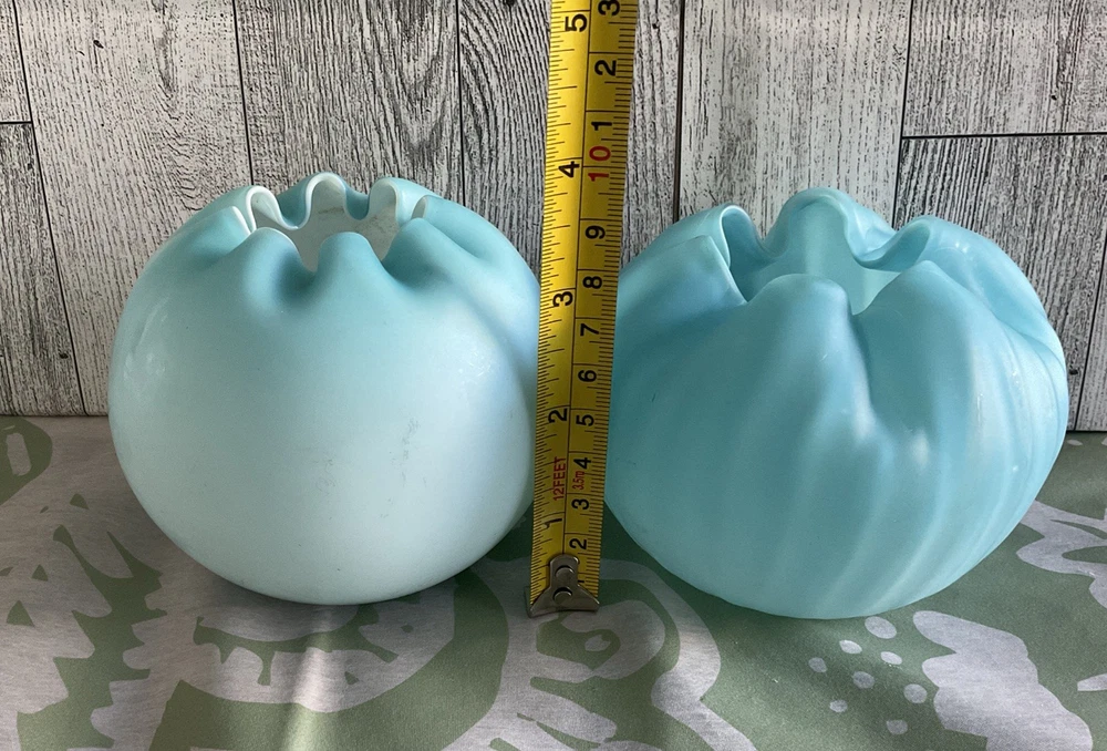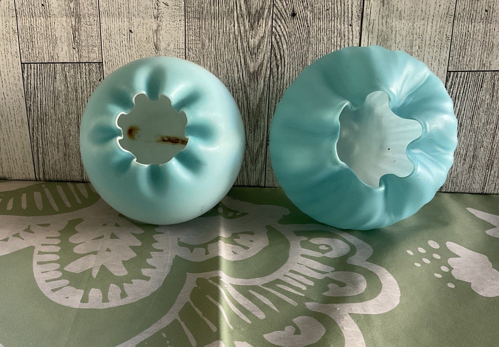 These antique Victorian era satin blue ribbed and ombre blue rose bowls with a crimped rim are a beautiful addition to any home decor. Made of glass with a delicate all-over rose pattern, they exude a colorful and retro vibe, perfect for those who appreciate art and novelty items. Standing at 3.25 inches tall and 3.5 inches wide, these hand-blown glass vases are unmarked, adding to their charm of being unique and one-of-a-kind pieces from the Victorian era. Review photos for additional description and condition details, they so show signs of wear due to the age. Vintage Glass Disclaimer Thank you for your interest in this vintage glass item! Please read the following details carefully to ensure you are fully informed before making your purchase: Condition: This is a genuine vintage/antique piece and is sold as-is. It may display signs of age and wear, such as minor scratches, discoloration, or manufacturing imperfections, which are typical for items of this era. I strive to describe all notable flaws accurately and include detailed photos as part of the description. Please review the images carefully, as they are considered part of the listing. Authenticity: To the best of my knowledge, this item is an authentic vintage glass piece from the [specific era, if known]. Use Disclaimer: Due to the items age, this piece is not recommended for food or drink use. It is intended for decorative purposes only. The buyer assumes all responsibility for use or misuse of this item. Packaging and Shipping: I take great care to package each item securely with protective materials to ensure safe delivery. However, I cannot be held responsible for damage that may occur during shipping. If any issues arise, please contact me, and I will assist in filing an insurance claim. Shipping insurance is included with your purchase for added peace of mind. Returns: All sales are final unless the item is significantly not as described in the listing. Please contact me within 3 days of receiving the item if you believe there is a discrepancy. Questions: I encourage buyers to ask questions or request additional photos before purchasing. I?m happy to provide any additional information to ensure your confident in your purchase. By purchasing this item, you acknowledge and accept the terms of this disclaimer.