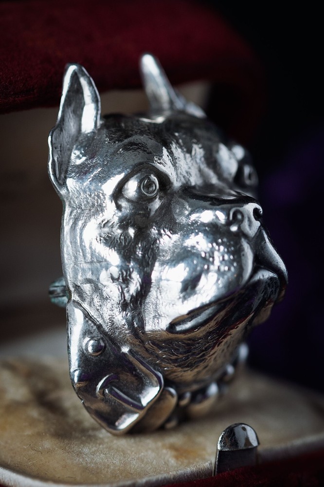 Is it a Boston? Is it a Frenchie? Is it a pitbull or possibly a mutt? While we believe this brooch was most likely modeled after a Staffordshire terrier, we really just think it's a sweet little pup! This highly expressive, 3-dimensional pin is crafted in sterling silver with loads of details that bring this piece to life! A true dog owner's delight! Date: 1890s-1900s Materials: Sterling silver Measurements: 1.5" x 1" Markings: Sterling Condition: Very Good. This piece was completely black with tarnish when we found it. We have cleaned, scrubbed and polished it to the best of our ability. There is still a small bit of verdigris on the hinge of the clasp. It has been improved upon more since this photo was taken. The pin back is slightly bent from years of wear. Cleaning and Care: Clean gently with warm soap and water and a soft bristled brush. Dry thoroughly. Polish with a silver cloth if needed.