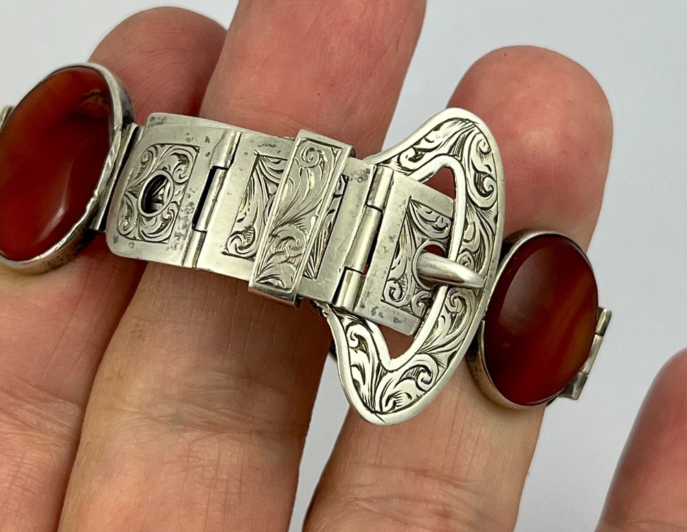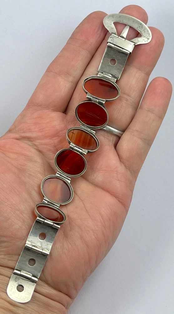 This is an stunning antique Victorian circa 1890, sterling silver Scottish agate belt buckle design bracelet. The stones are classic graduated banded carnelian agates from near Cupar in Fife. The bracelet has no hallmarks which is fairly normal for pieces from this period but has been fully tested and is sterling silver. The bracelet length is adjustable from approx. 15 cm ( six inches ) to 18 cm ( seven inches ) and the weight is 29.8 grams If when you receive your winning item and for any reason are not happy with the purchase please get in touch before leaving feedback and I will endeavour to resolve any issue you may have amicably. I have a returns policy which allows you to send any item back within 7 days of receipt. I always show high magnification pictures of my items to show as much detail as possible as it is not always possible to list every point in a description. As with all my auctions the bidding starts LOW and there is NO reserve! Please check out my other Jewellery auctions and remember that savings on shipping will be made for multiple purchases! I offer two shipping services to the UK and one worldwide. The special delivery (UK) and Airsure (worldwide) provides full insurance for any item.