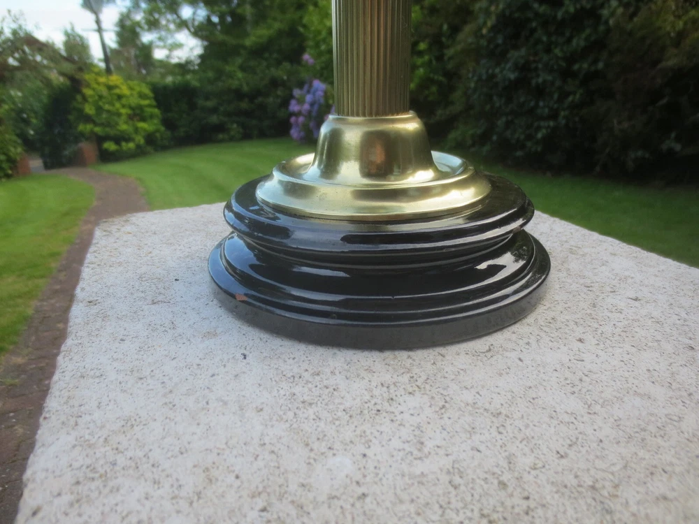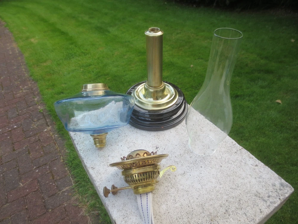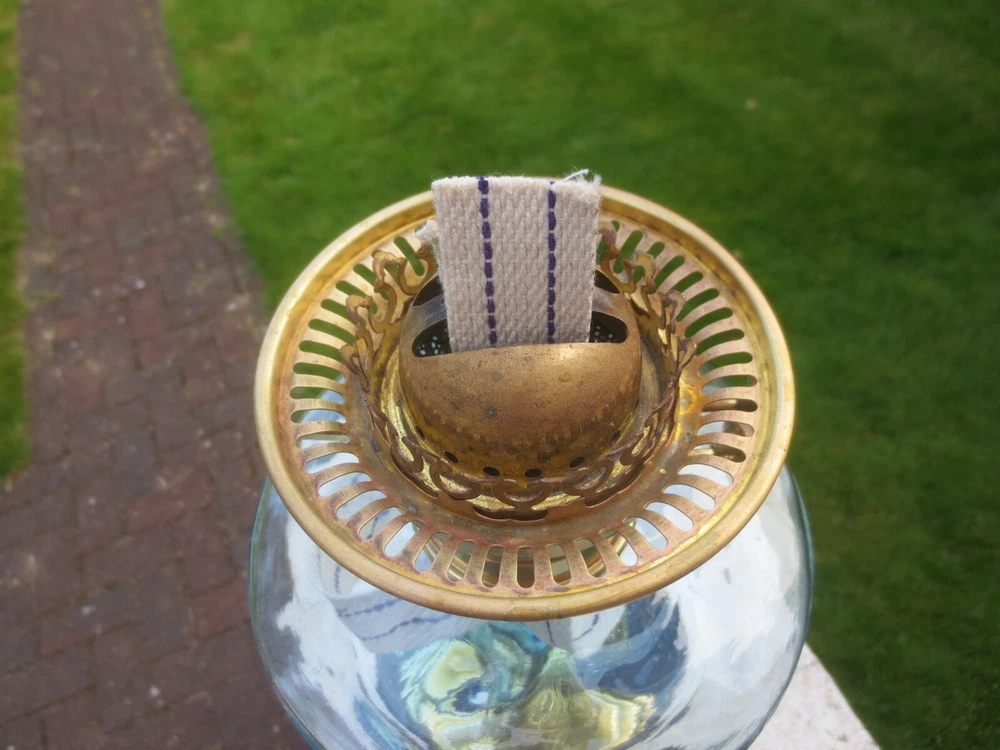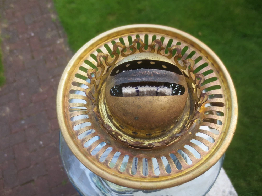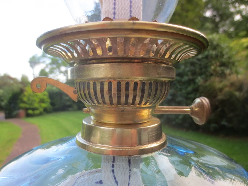 Total height of lamp is approx 25 1/2" UP FOR AUCTION IS THIS OLD BRASS TABLE OIL LAMP, COMPLETE WITH CHIMNEY. THE LAMP IS COMLETE AND FULLY WORKING. THE CHIMNEY HAS A LINE MANUFACTURING FLAW NEAR THE TOP AS SHOWN BRASS AND GLAZED TERRACOTTA BASE- THERE ARE SOME CHIPS AS SHOWN BLUE GLASS FONT ENGLISH MAKE TWIN DUPLEX BURNER, COMPLETE WITH FLAME EXTINGUSHER. IT HAS FULLY WORKING WICK WINDERS AND HAS BEEN FITTED WITH A NEW LENGTH OF COTTON WICK OVAL BULGE CHIMNEY THE LAMP WILL BE WELL PACKED AND EASCH PART BUBBLE WRAPPED SEPERATLY. International Buyers – Please Note: Import duties, taxes, and charges are not included in the item price or shipping cost. These charges are the buyer's responsibility. Please check with your country's customs office to determine what these additional costs will be prior to bidding or buying. FOR CORRECT OVERESEAS POSTAGE PLEASE CONTACT ME. FOR MORE PHOTO'S OR INFORMATION PLEASE EMAIL THERE ARE AGE RELATED MARKS, DENTS, SPLITS AND IMPERFECTIONS ASSOCIATED WITH ANTIQUE PARTS. PLEASE NOTE, ANTIQUES WHICH ARE MANY YEARS OLD WILL NOT BE IN BRAND NEW AND UNTOUCHED CONDITION. ANY MAJOR DAMAGE OR FAULTS I WILL TRY AND POINT OUT. EVEN WHEN THEY ARE IN GREAT CONDITION, THEY WILL HAVE SOME WEAR COMMENSURATE WITH THEIR AGE AND USE. PLEASE TAKE THIS INTO ACCOUNT. . FOR THE CORRECT OVERSEAS POSTAGE PLEASE CONTACT ME AS ALL DESTINATION PRICES VARY THERE IS WICK WITH THE LAMP.