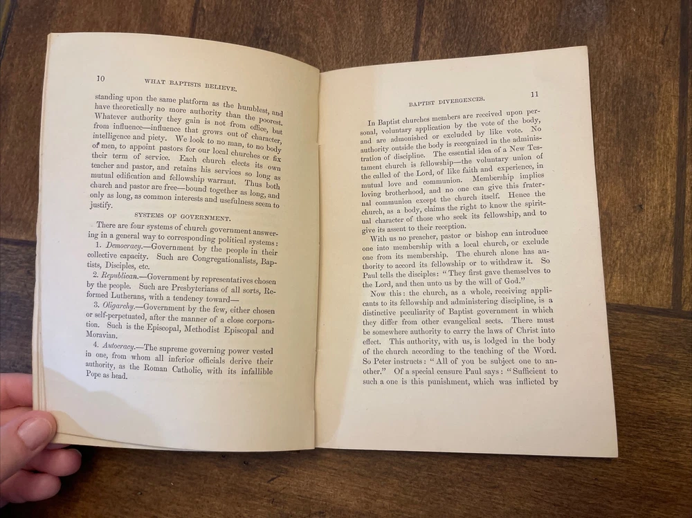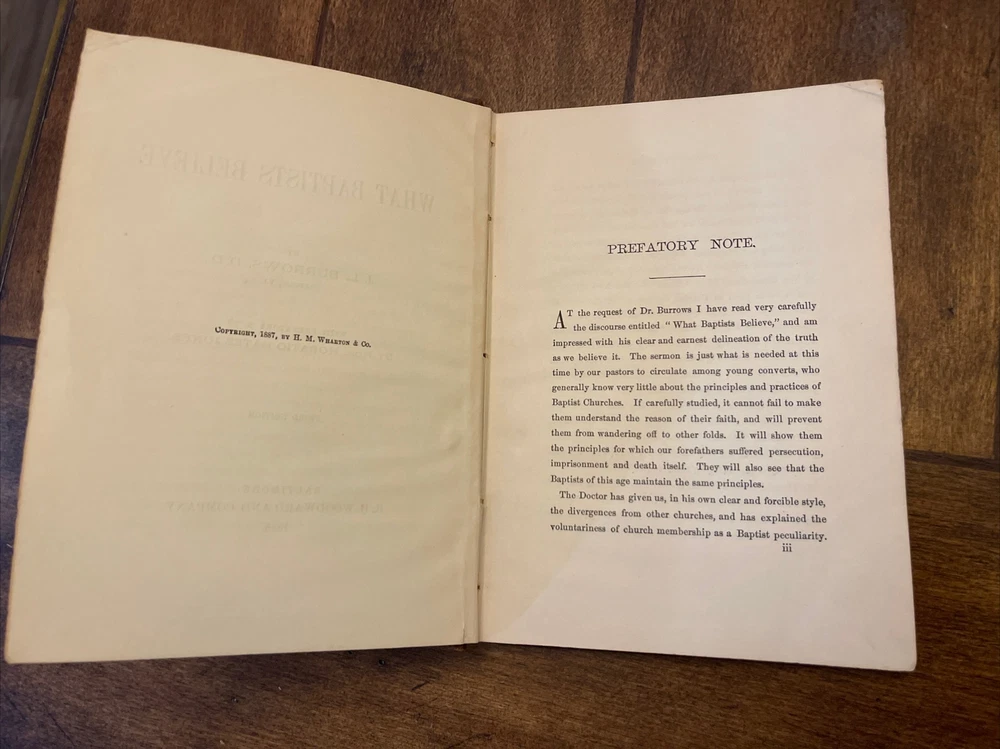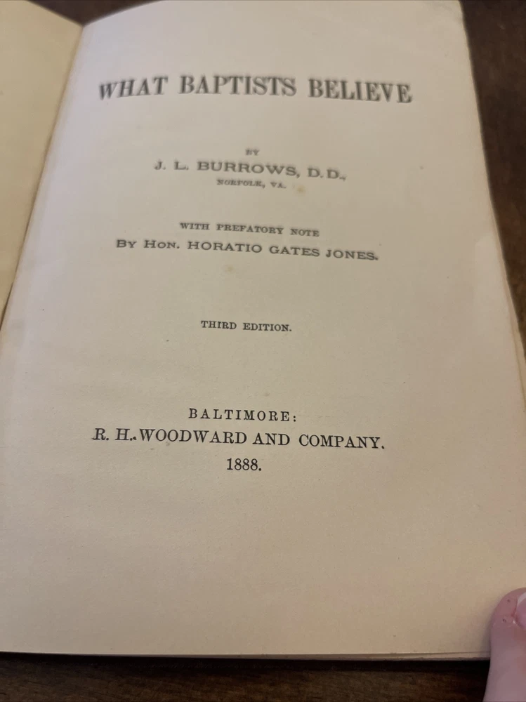 There is writing on the first page. The book is in really good condition considering its age. This rare antique hardcover book titled "What Baptists Believe" by JL Burrows is a true gem from 1888. This third edition book is written in English and published by RH Woodward and Company in the United States. The book covers topics related to Baptists and religion, making it a great addition to any religious and spiritual collection. The book is in good condition and has been well-preserved over the years. Its pages are still intact and the cover is in good shape. This book will make a great addition to any collection or can be used as a valuable resource for anyone interested in learning about Baptist beliefs and religion in general.