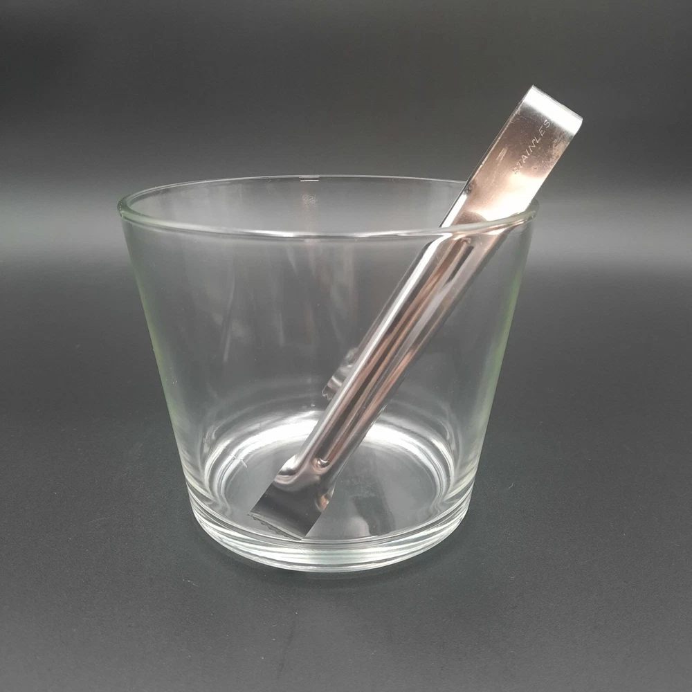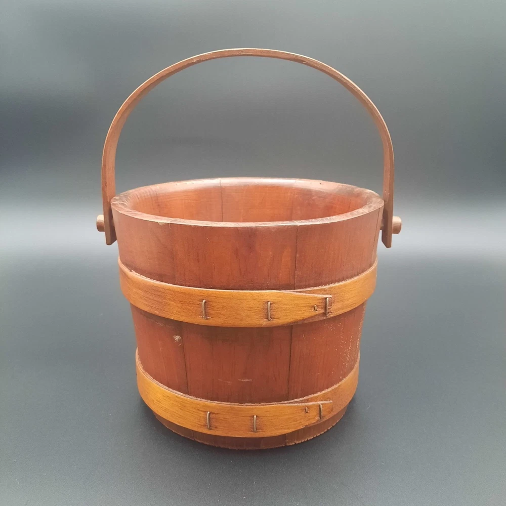 This vintage wood and glass ice bucket offers both functionality and classic design. The glass insert ensures easy cleaning, and the wooden exterior adds a touch of rustic charm. Ideal for entertaining, this bucket includes a pair of tongs for convenient ice serving. • Glass insert for easy cleaning • Includes metal tongs • Sturdy wood handle • Rustic wooden exterior • Compact design Approx. Top to bottom = 6 inches Approx. Diameter = 7.5 inches