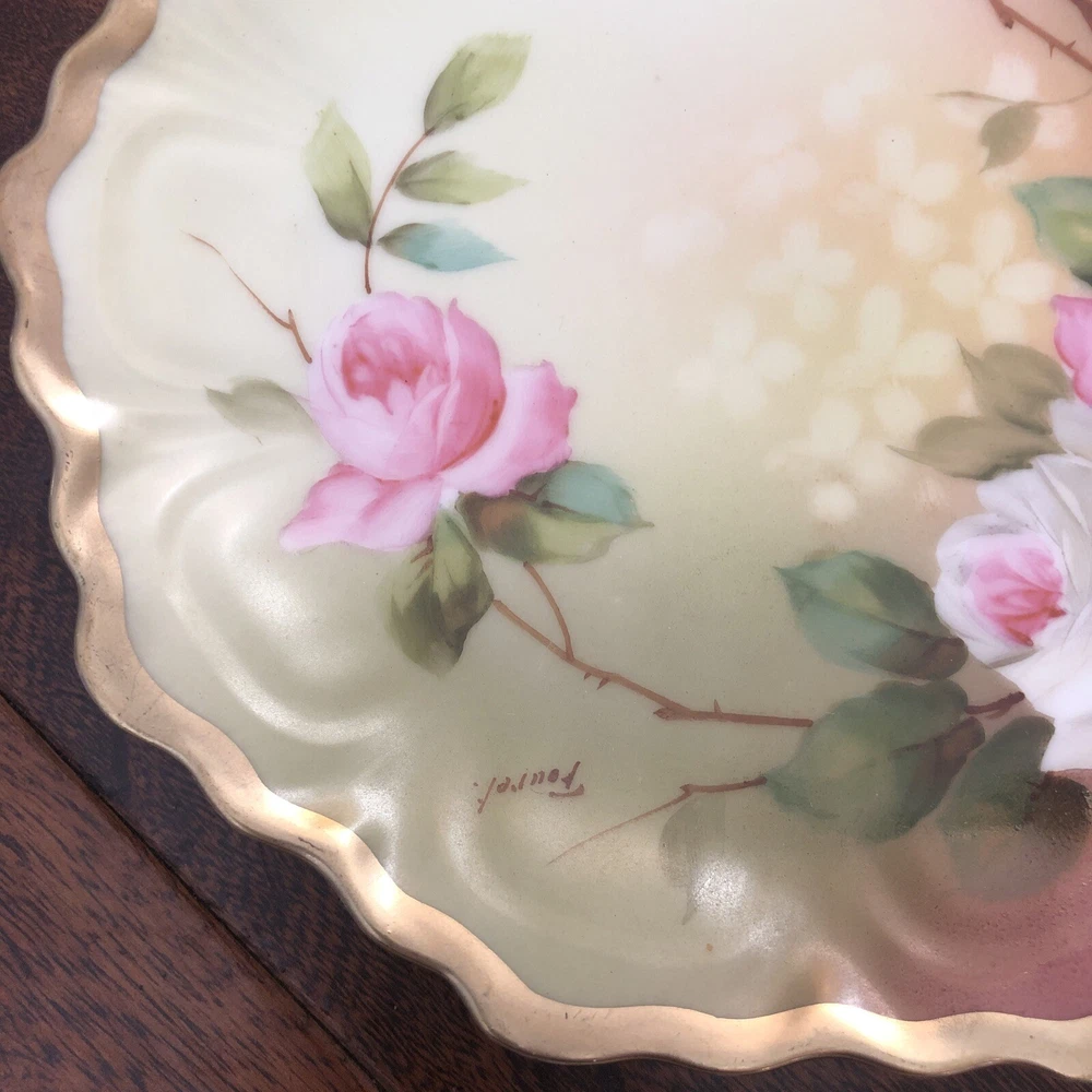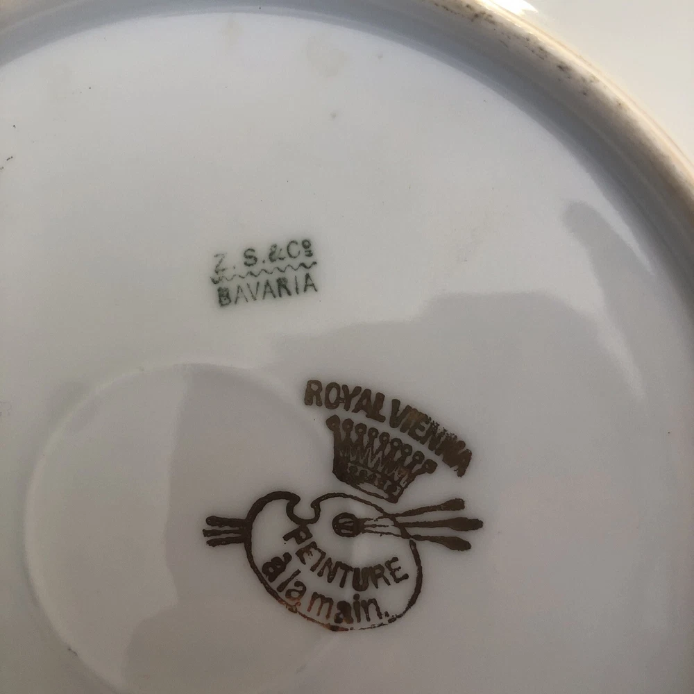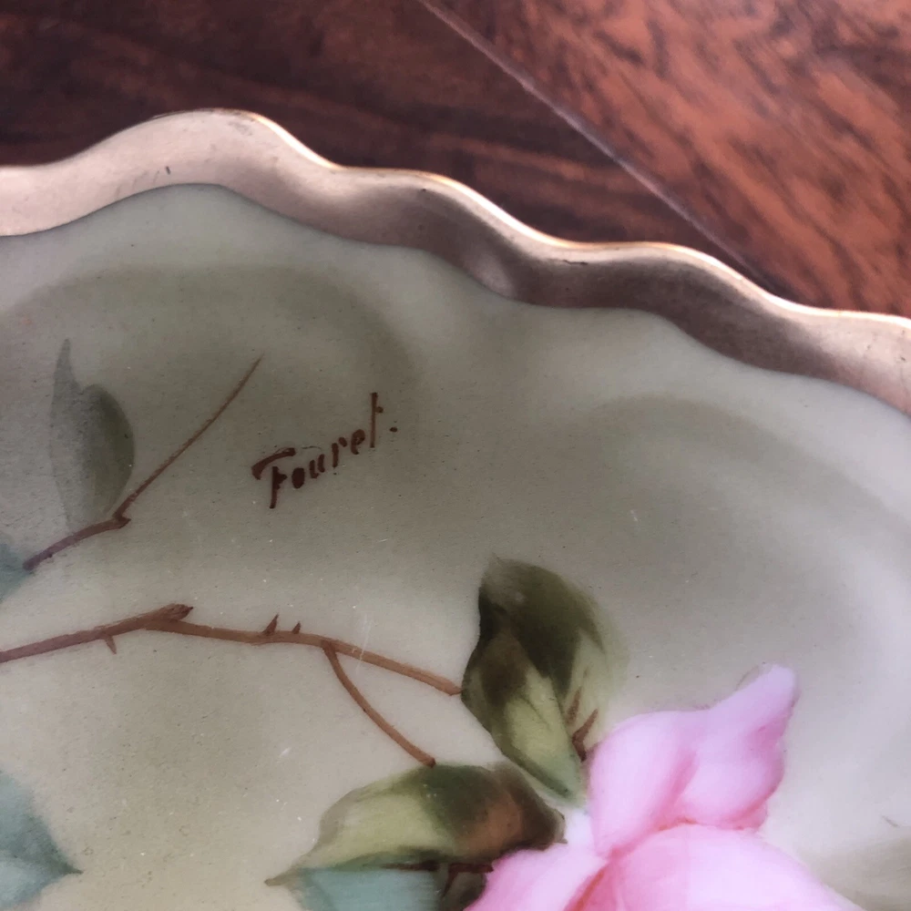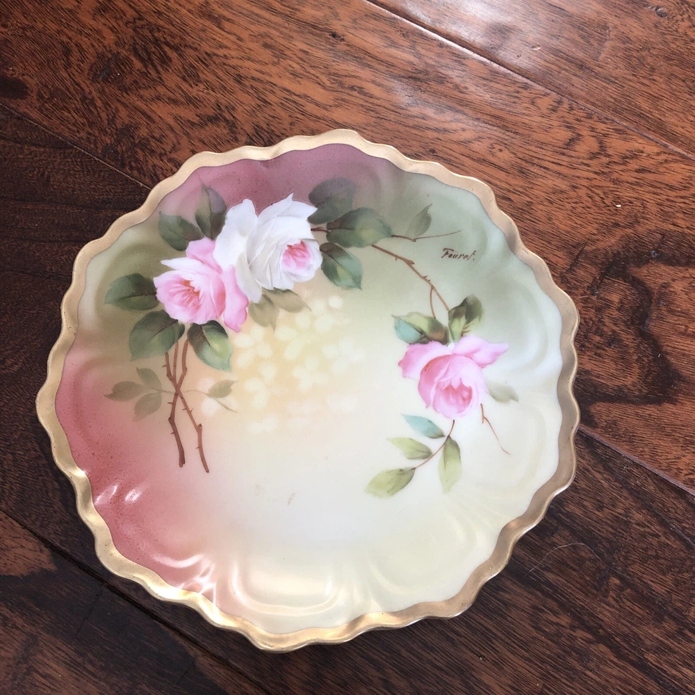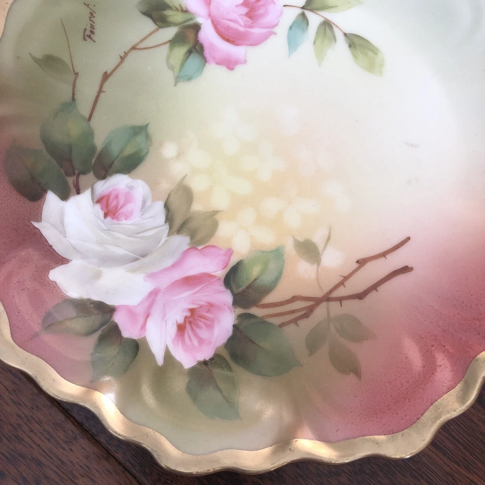 This is an antique Z S & Co collector plate from Royal Vienna, featuring hand-painted roses on a round porcelain plate measuring 6.5 inches in diameter. The plate is signed by the artist Fourel and is of Edwardian era vintage, produced in Germany using art pottery techniques. This decorative piece reflects German culture and is a handmade item with intricate detailing. Plate is no chips, no cracks. 6.5” diameter. Thanks