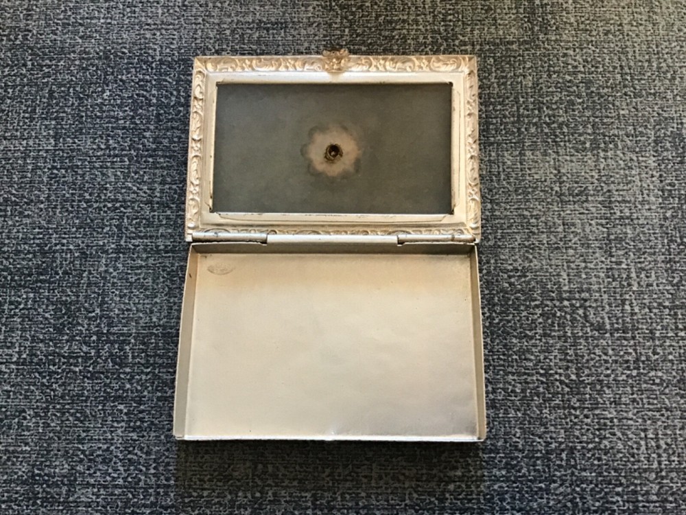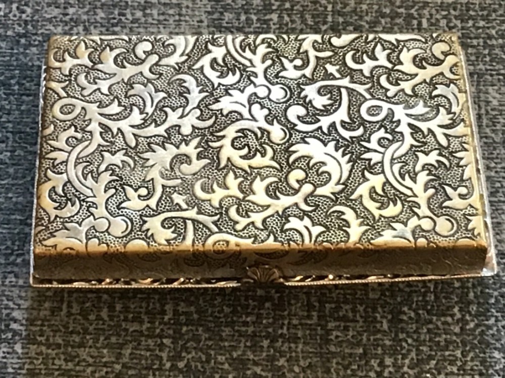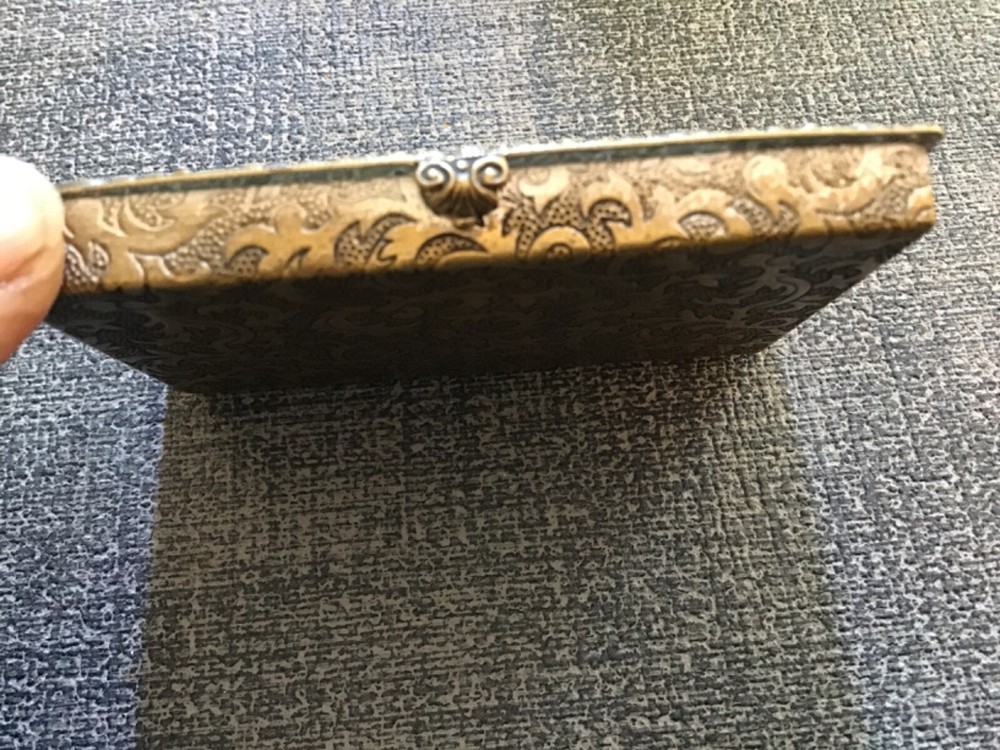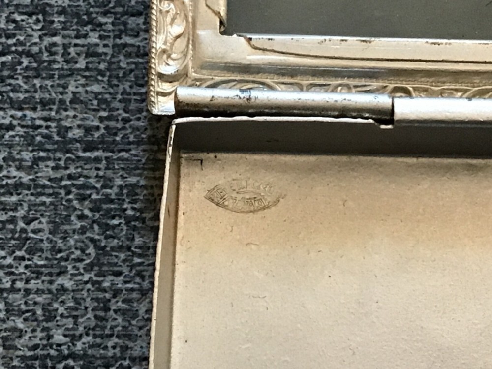 I have been unable to read the hallmarks. They are enlarged in the third photo. As you can see, there is a decorative piece set into the cover that is missing stones. Otherwise the condition is very good.