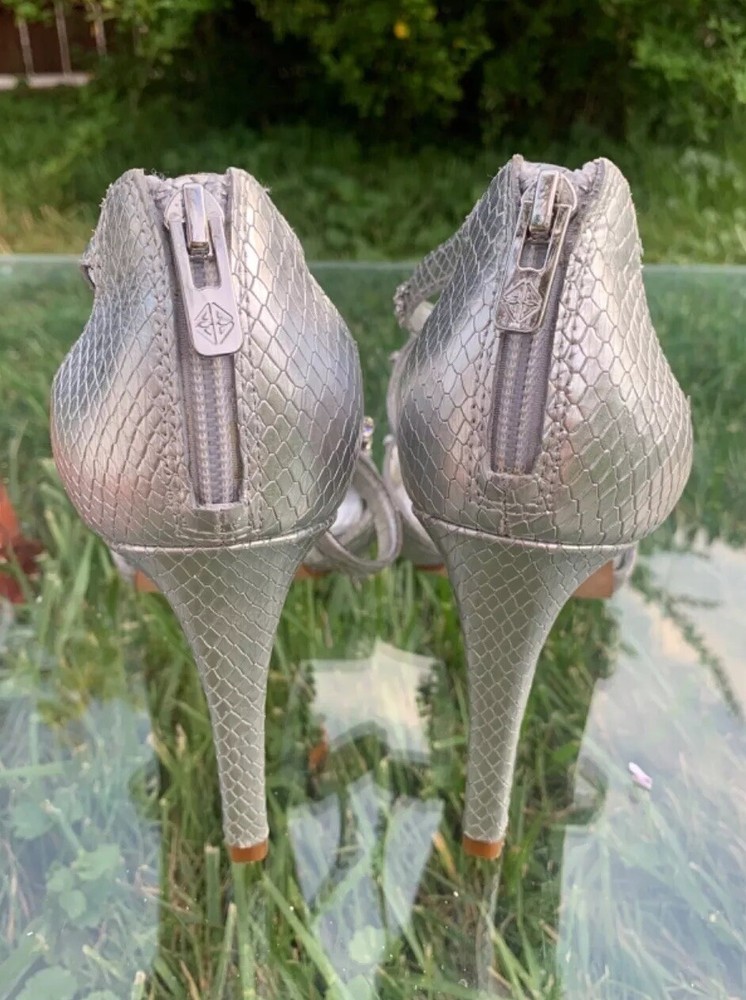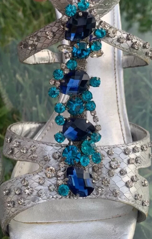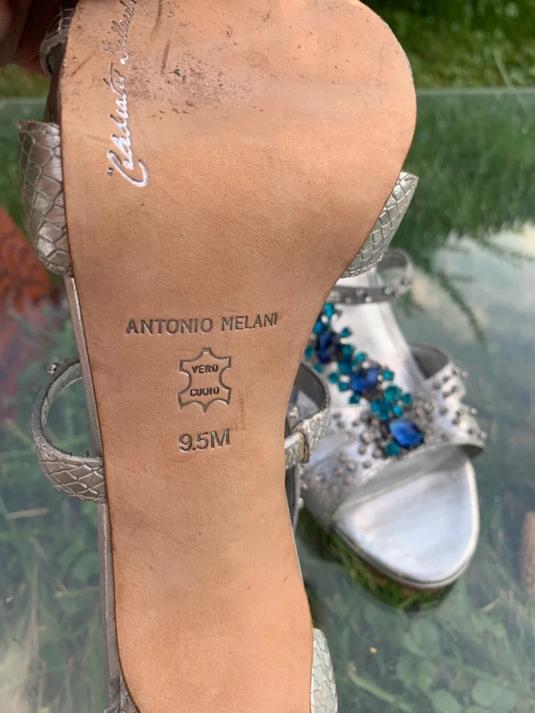 Elevate your look with these stunning Antonio Melani strappy high heels. The silver and blue color combination, glitter pattern, and rhinestone accents make them perfect for any occasion - from weddings and formal events to parties and cocktails. The ultra-high stiletto heel adds extra height and glamour, while the open toe and zip closure provide comfort and ease of wear. Crafted with leather outsole and lining, these heels ensure durability and long-lasting wear. The 1-inch platform height gives a lift to your silhouette, while the standard shoe width provides a comfortable fit. Whether it's summer, fall or spring, these shoes are perfect for any season. Add a touch of metal theme to your outfit with these stylish heels.