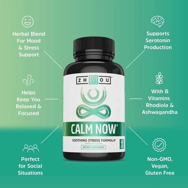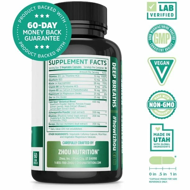 About This Item We aim to show you accurate product information. Manufacturers, suppliers and others provide what you see here, and we have not verified it. Feeling overwhelmed and stressed? We hear ya. Thats why we created Calm Now, the perfect supplement for soothing stress while staying centered and focused. Weve combined the best of Eastern herbal tradition and modern research to deliver a potent formula featuring ashwagandha, bacopa monnieri, rhodiola rosea, passion flower, and more! When youre feeling bogged down on a busy day, grab a serving of Calm Now to support serotonin production, chill your mood, and own your day. KEEP CALM & FOCUSED. Calm Now was formulated with the modern busy person in mind, supporting serotonin production while easing you into a calm and centered headspace. Tackle your responsibilities in the right mindset and own your day. STAY POSITIVE & SOCIAL. Other so-called 'chill pills' and supplements can make you sleepy, but we know you need to keep calm and stay focused to win the day. Heres your chance to be the best version of yourself relaxed, focused, and positive. EXPERTLY CRAFTED. We combine the best of Eastern herbal tradition and modern research to deliver a supplement that contains the right amounts of ashwagandha, rhodiola rosea, passion flower, bacopa monnieri, hawthorn berry, and more for optimal results. WHAT SETS US APART? At Zhou, we use only the highest-quality ingredients in a facility following GMP (good manufacturing practices). Plus, we test everything at our lab in Utah, so you can be confident that you're fueling your body with the very best. Indications: Health Concern: Stress Mood Support Anxiety Support Ingredients: Inactive Ingredients: Use only as directed. Take two (2) capsules with food and water once daily or as directed by your healthcare professional. Ingredients: Calm Now Botanical Blend [Hawthorn Powder (berry), Lemon Balm Extract (whole plant), Passion Flower Extract (whole plant), Hops Extract (flower)] Ashwagandha Powder (root), Rhodiola Rosea Extract (root), Bacopa Monnieri Extract (whole plant), Other Ingredients: Rice Flour, Cellulose (vegetable capsule), Vegetable Magnesium Stearate Directions: Dosage: As Needed Instructions: Use only as directed. Take two (2) capsules with food and water once daily or as directed by your healthcare professional. Specifications Brand Zhou Nutrition Manufacturer Zhou Nutrition Assembled Product Dimensions (L x W x H) 2.30 x 2.30 x 4.50 Inches ~ Will be wrapped with care. ~ ~FREE SHIPPING~ Any questions, please feel free to contact us. Buy with confidence! Thanks for looking!
