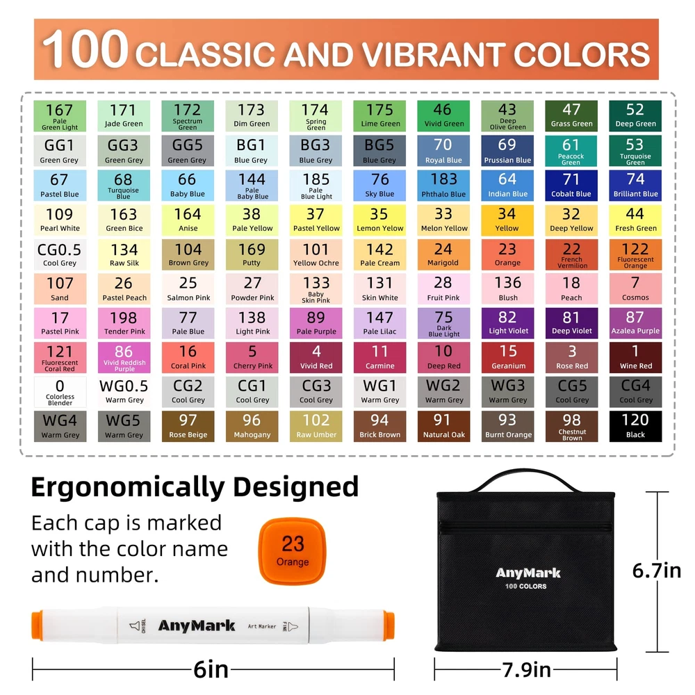 Rich Vibrant Colors: Dive into 100 vibrant alcohol markers tailored for artists at any stage. Effortlessly blend using our colorless blender for boundless creative expression. Unleash your inner artist with our premium markers today! Chisel & Fine Dual Tips: AnyMark art markers are designed with a unique dual-tip that offer versatility and precision in one marker.The broad chisel tip (1-6mm) is perfect for quick coverage, while the fine bullet tip (1-2mm) allows for details. You can effortlessly switch between broad strokes and fine details, making your creative process smoother and more enjoyable! Easy to Organize: AnyMark alcohol markers set comes with a base tray at the bottom of the case that allows each marker to be stored independently.Equipped with a high-quality black carrying case perfect for traveling and storing.Say goodbye to messy workspaces and hello to a more efficient creative process! Alcohol-Based Ink: The alcohol markers feature high-quality ink that is quick-drying, smooth, allowing you to achieve beautiful coloring effects with ease. Each marker comes with a color-coded cap, making it easy to identify colors. Plus, the caps keep the tips from drying out, ensuring your markers are ready to use when inspiration strikes. Give the gift of endless possibilities for kids,students,friends with AnyMark alcohol markers! Perfect Gift : AnyMark alcohol markers set is the perfect gift, fusing creativity and versatility for artistic expression. Perfect for kids, students, adults, families, and friends on occasions like Christmas,Thanksgiving and birthdays. These markers offer vibrant colors, durability, and easy blendability, unlocking artistic potential. Ideal for painting, illustration, or crafting personalized cards, they infuse inspiration into creative pursuits.