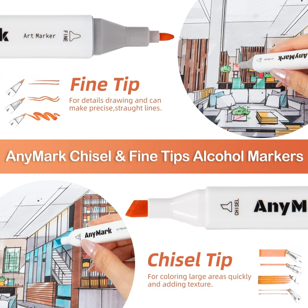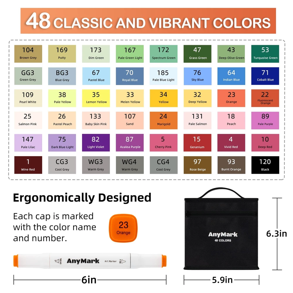 Rich Vibrant Colors: Dive into 48 vibrant alcohol markers tailored for artists at any stage. Effortlessly blend using our colorless blender for boundless creative expression. Unleash your inner artist with our premium markers today! Chisel & Fine Dual Tips: AnyMark art markers are designed with a unique dual-tip that offer versatility and precision in one marker.The broad chisel tip (1-6mm) is perfect for quick coverage, while the fine bullet tip (1-2mm) allows for details. You can effortlessly switch between broad strokes and fine details, making your creative process smoother and more enjoyable! Easy to Organize: AnyMark alcohol markers set comes with a base tray at the bottom of the case that allows each marker to be stored independently.Equipped with a high-quality black carrying case perfect for traveling and storing.Say goodbye to messy workspaces and hello to a more efficient creative process! Alcohol-Based Ink: The high-quality ink is quick-drying,smooth and evenly,blends seamlessly to achieve beautiful coloring effects.Each marker has a color recognition code,so you can easily identify and choose colors by color-coded caps.The caps also keep tips from drying out,please cover it in time when you finish.It is a ideal gift for kids,students,friends,Christmas,Thanksgiving Day and other festivals. Using Tips: As AnyMark drawing markers are alcohol-based ink like all other brand alcohol markers,they will bleed through regular paper.When you paint,please put a piece of paper under the work or use special thick marker paper to avoid leakage.We attach great importance to your opinions,please feel free to contact us at any time if you are not satisfied with our products or have any questions