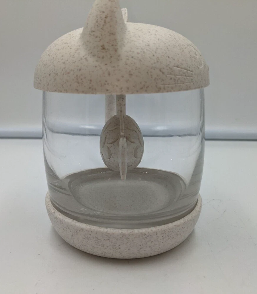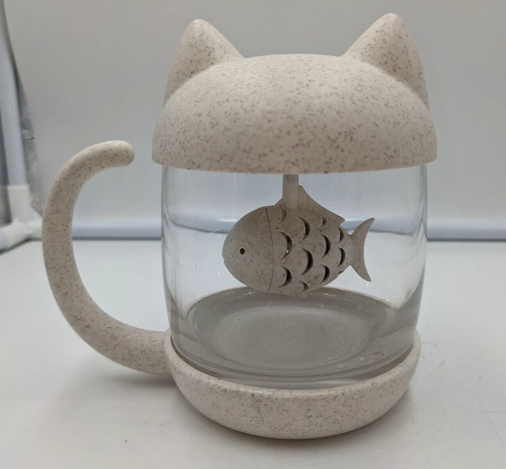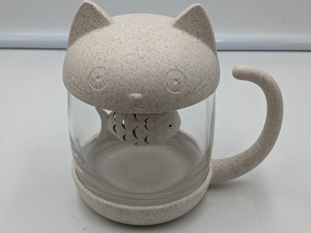 This is a cute glass cat mug (his head is the lid to the cup and the tail is the handle) with an infuser for tea in the shape of a fish. It is a beige color and clear glass and will hold about 8 ounces. I am a careful and thorough packer, but for some of the items I sell, I’m not able to use combined shipping because of their size or propensity to break if put into a box with other items. If you purchase more than one item from my store and ask for combined shipping, I will do my best to accommodate your request. I will accept any reasonable offer so please feel free to send your offer. T hank you for visiting my store. I hope to see you again soon!