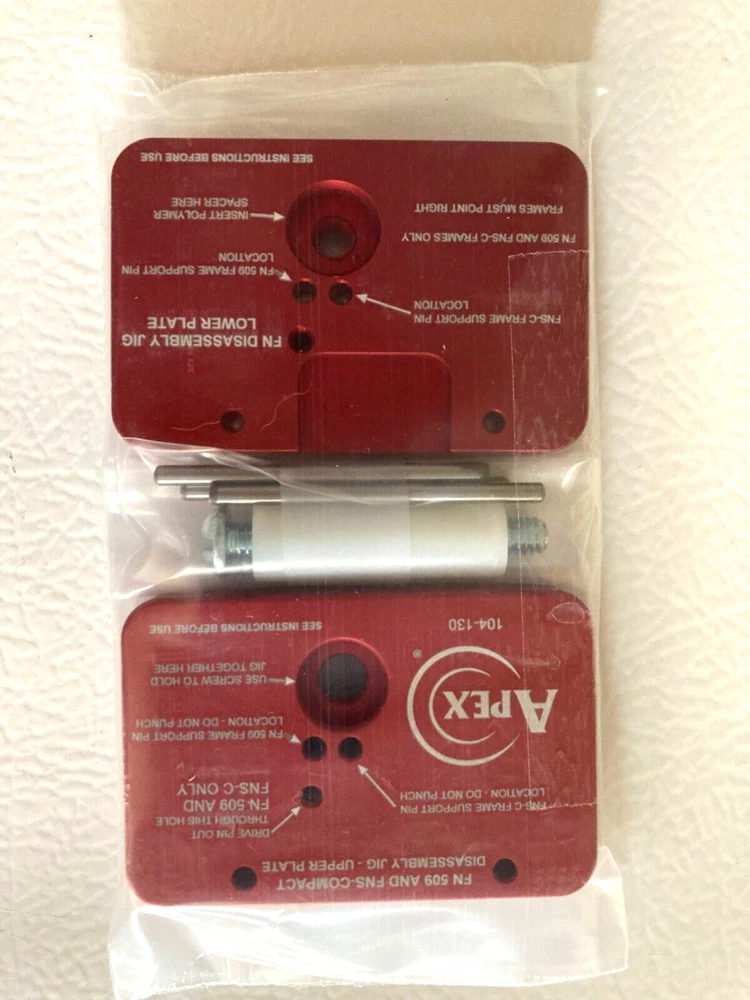 Details Working on an FN 509? Then this is the likely the most valuable tool you could add to your work bench. The Apex FN Disassembly Fixture is designed to properly hold the FN 509, or FNS Compact, pistol frame to locate a pin punch for removal of the unlocking block pin, which is the most difficult part of the disassembly process. Why you need this indispensable tool: – This tool will make life easy when working on the FN 509, or FNS-C Cautions: – Must be used on a solid surface (i.e. vise anvil, concrete floor or extremely solid work bench over a table leg) – DO NOT USE ON YOUR KITCHEN TABLE OR COUNTER TOP, THESE SURFACES ARE NOT STABLE ENOUGH For Use In These Guns For use with all current FN 509 and FNS Compact models. Does Not Fit These Guns Not for use with the FNS or FNS Longslide models. Not intended for use on the FN X-Series pistols. What's Included 1 ea. Disassembly Lower Jig Plate 1 ea. FN 509 & FNS-C Upper Jig Plate 1 ea. 2” Alignment Screw 1 ea. Polymer Spacer 3 ea. 1/8” Fixture Pin Installation Resources – Small Hammer – between 6 to 10 oz is recommended – Common (Flat Blade) Screw Driver – 3/32” Pin Punch – recommend no longer than 1” of 3/32” to prevent deflection MSP Sports is an authorized retailer for Apex Tactical products. All of our Apex items are obtained directly from Apex Tactical. This item is brand new and has never been used. Fast Shipping and 100% Satisfaction Guaranteed! Backed by the MSP Sports Guarantee. If your item is lost or damaged in transit we will replace your item or refund you 100% including any shipping charges. Please note this item will have a return fee of $20 if it is used. We had to implement this policy for this item because we have had customers use this item with the intent to return it after use.