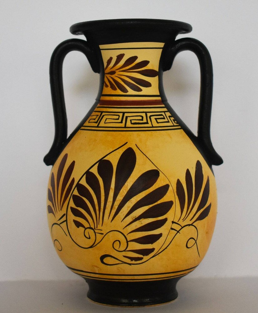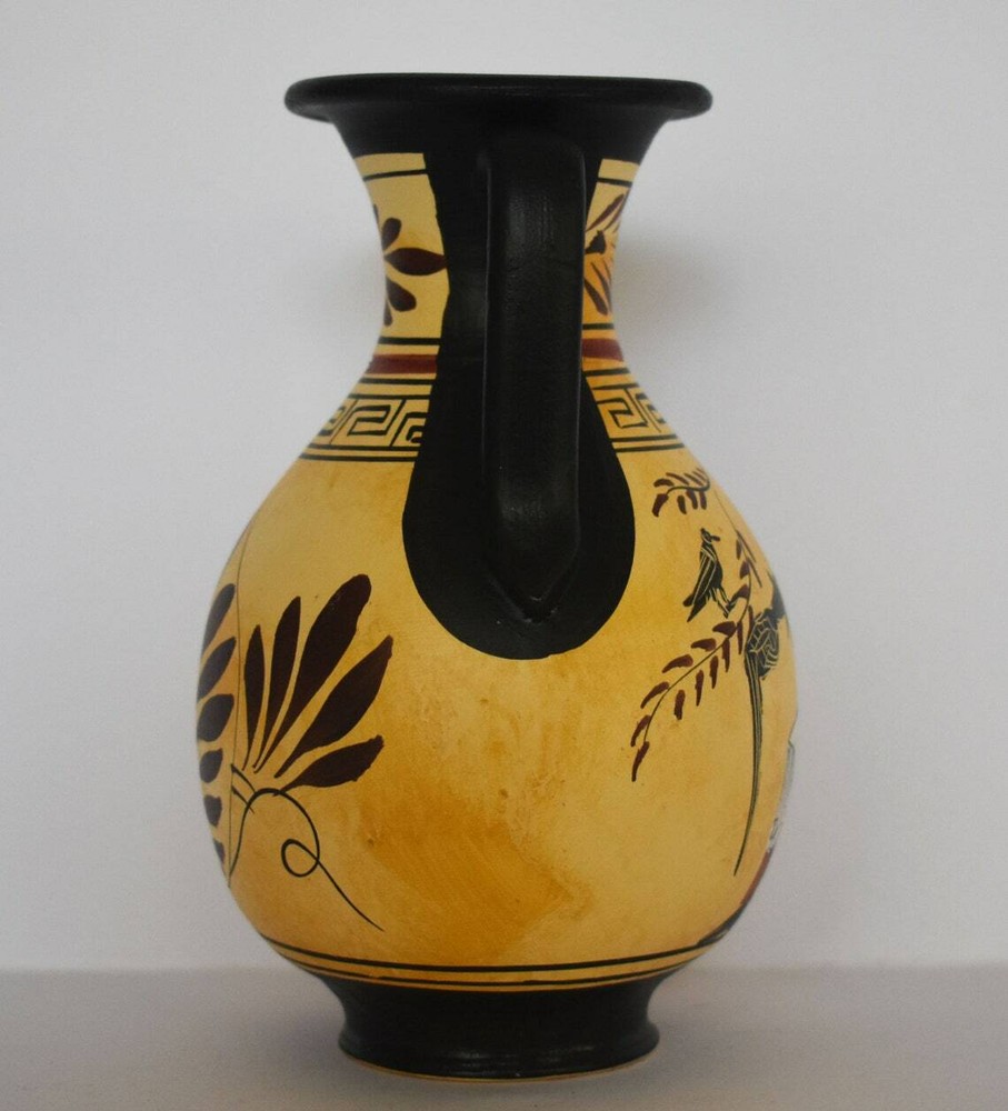 Apollo - Greek Roman God of music, poetry, art, prophecy, truth,healing, sun and light - Floral and Meander design - Ceramic Vase Condition: New, Handmade in Greece. Material: Clay Height Size: 15 cm - 5.9 inches Width: 9 cm - 3,55 inches Weight: 300 g The most distinctive depiction of the Apollo. The god wears a white sleeveless chiton, which is fastened with pins at the shoulders, and a red himation wrapped around the lower part of his body. He sits on a cross-legged stool. A myrtle wreath garnishes his carelessly bound hair. He performs a libation by pouring wine out of a bowl with his right hand, while holding a seven-stringed lyre, whose sound-box is made of a turtle-shell, in his left hand. A raven looks on. This scene could allude to the myth of King Phlegyas's daughter Koronida, who was in love with Apollo, although some scholars believe it is simply a bird with prophetic powers. ΜΑΚΗΣ 1Ε ΑΠΟΛΛΩΝ ΒΑΖΟ *********************