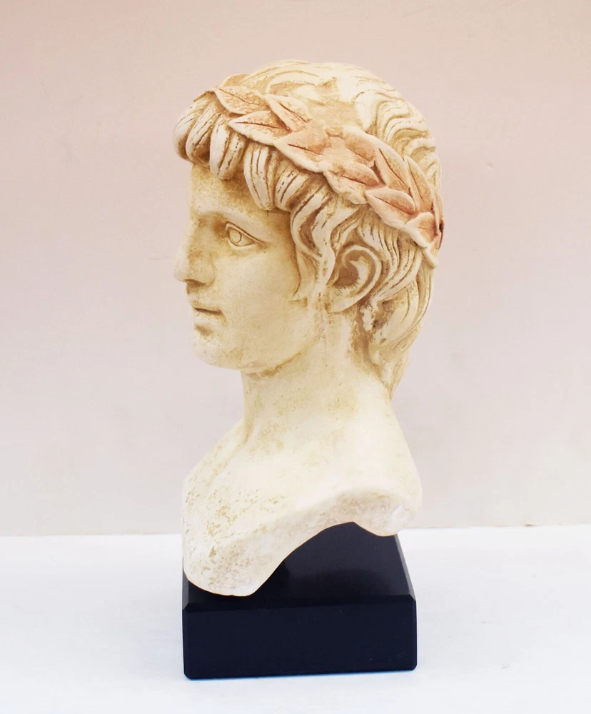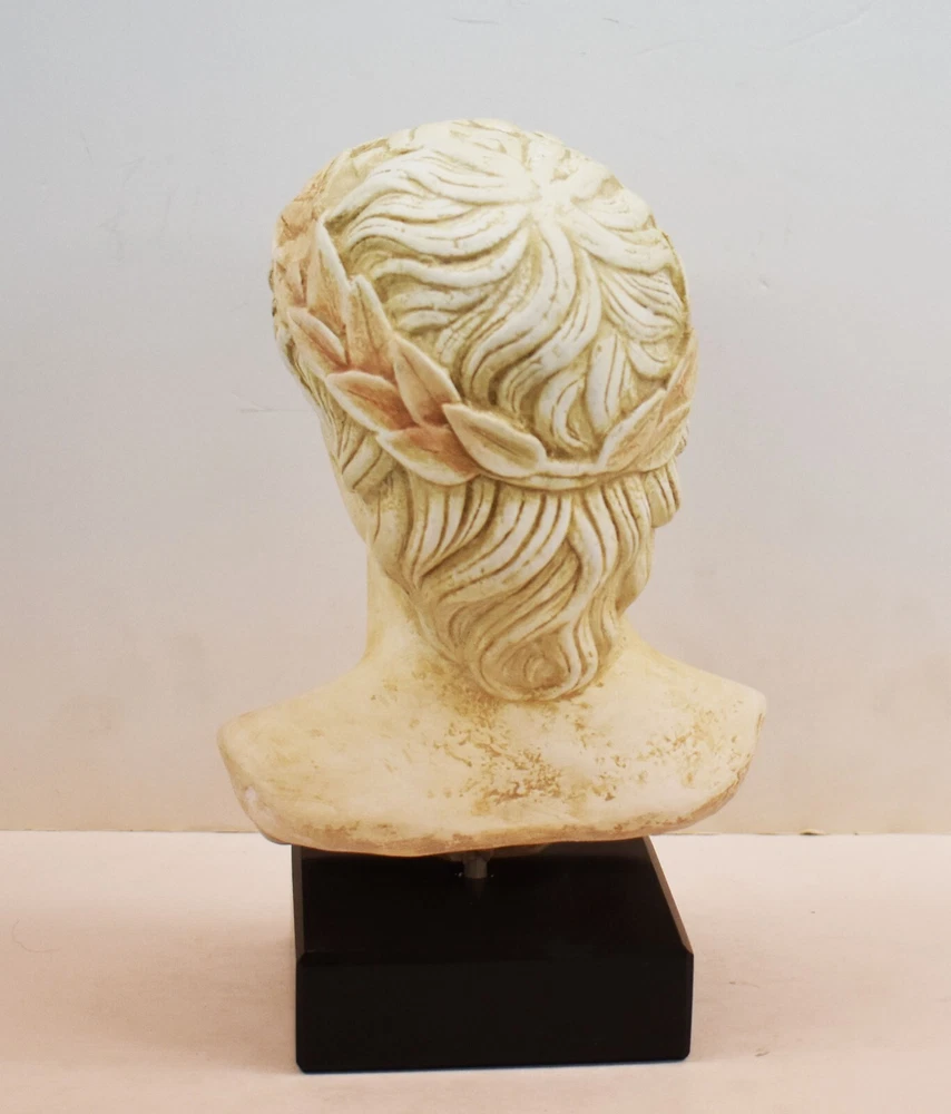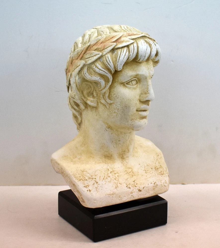 APOLLO BUST Apollo is one of the most important and complex of the Olympian deities in classical Greek and Roman religion and Greek and Roman mythology. Apollo has been variously recognized as a god of music, truth and prophecy, healing, the sun and light, plague, poetry, and more. (01-190-A) Details: Condition: New, Handmade in Greece Material: Casting stone Height: 23 cm - 9 inches Width: 15 cm - 5.9 inches Length: 10 cm - 3.9 inches Weight: 2.4 kg ********