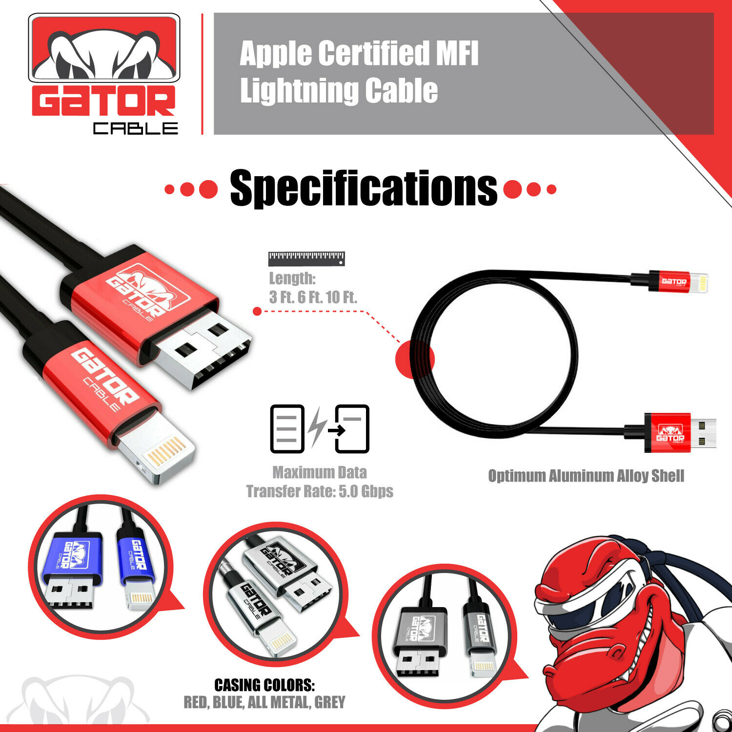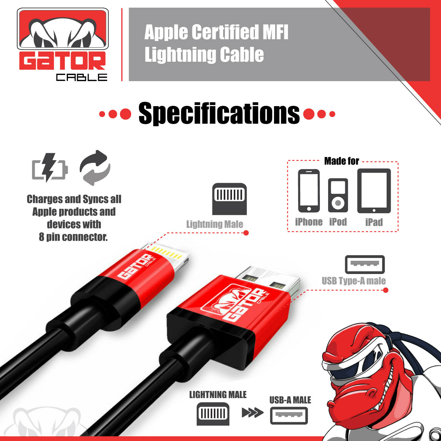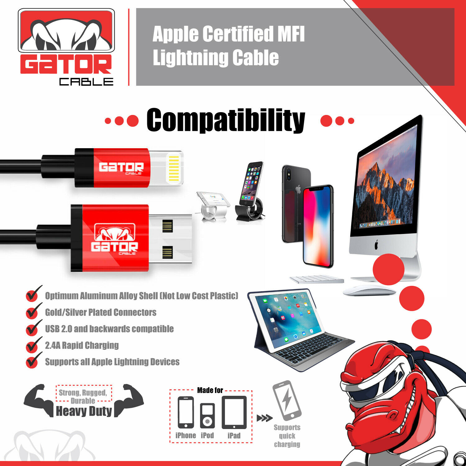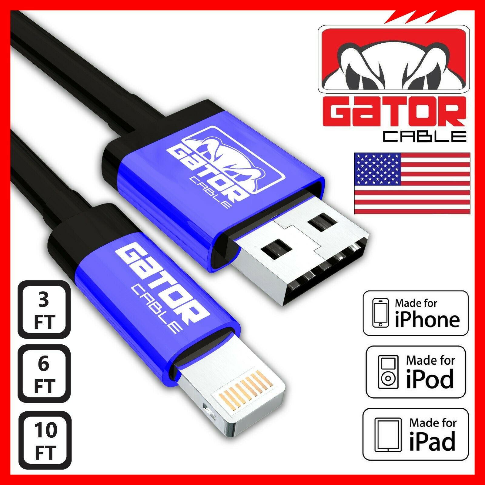 Gator Cable: Apple Certified MFI Lightning Cable Lengths: 3FT 6FT 10FT Charges and Syncs all Apple products and devices with 8-pin connector. Applications and Compatibility: iPhone 5 5S 5C iPhone 6 6S 6+ 6S Plus iPhone 7 7+ Plus iPhone 8 8+ Plus iPhone X iPhone XR iPhone XS iPhone XS Max iPhone 11 iPhone 11 Pro iPhone 11 Pro Max iPhone 12 iPhone 12 Pro iPhone 12 Pro Max iPhone 12 Mini iPhone SE (2021 new version) iPad 1 2 3 4 iPad Mini 1 2 3 4 iPad Air Air 2 iPad Pro iPod Apple Certified MFI Lightning Cable Specifications: 3FT 6FT 10FT Length (Your Choice) 8 Pin Connector Maximum Data Transfer Rate: 5.0 Gbps Black Color PVC Molding Type Optimum Aluminum Alloy Shell (Not Low Cost Plastic) Data Line 28 AWG, Power Line 24 AWG Gold/Silver Plated Connectors USB 2.0 and backwards compatible 2.4A Rapid Charging Supports all Apple Lightning Devices We Offer The Lowest Prices On eBay for OPTIMUM Quality Cables + Free Shipping On All USA Orders! BUY 4 OR MORE GATOR CABLES GET FREE U.S. PRIORITY MAIL SHIPPING ALL ORDERS ARE SHIPPED OUT WITHIN 1 TO 10 HOURS! Ultra Fast - FREE Shipping Worldwide Shipping From USA to All USA International Shipping No Waiting 3 to 4 Weeks METALLIC CASING Strong-Rugged-Durable Heavy Duty Cables Premium Quality Cables! Apple Certified MFI Lightning Cable Ultimate Performance! Great Value! CLICK ON OUR eBay STORE