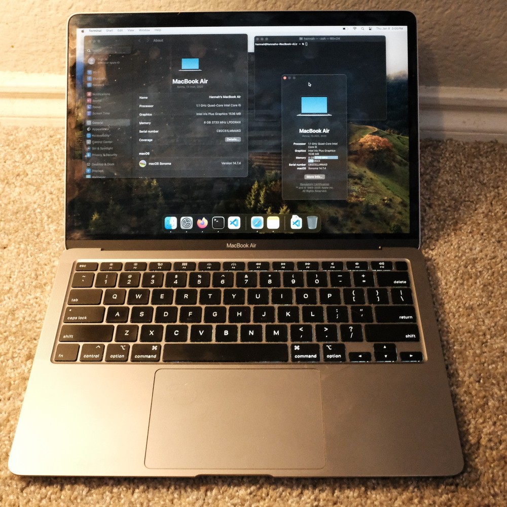 Selling a 13" 2020 Apple Macbook Air i5 with 8GB ram and a 512GB SSD. Does not come with an AC adapter. Currently has MacOS Sonoma installed on it. Holds charge just fine