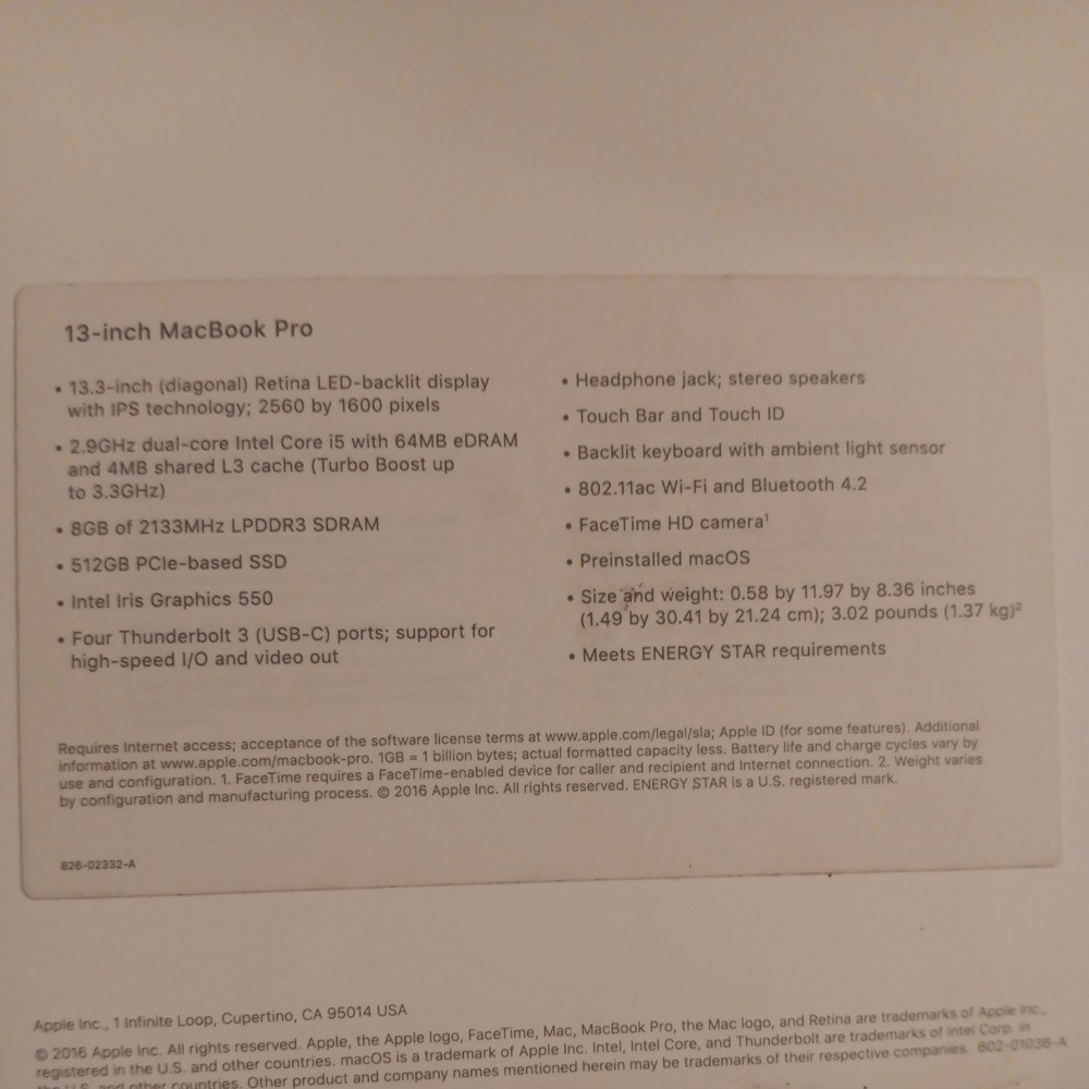 The Apple MacBook Pro 13.3" 512GB Laptop with Touchbar (October, 2016) is a high-performance device featuring an Intel Core i5 6th Gen processor, 8GB RAM, and a 512GB hard drive capacity. With a sleek silver design and a 13.3" screen size, this laptop is perfect for handling demanding tasks and running multiple applications smoothly. Its impressive features and reliable brand make it a top choice for users seeking a powerful and efficient computing experience. no charger or cord