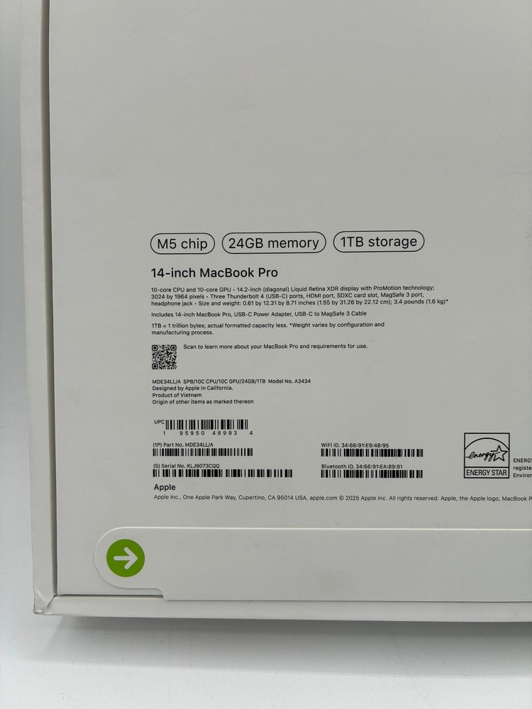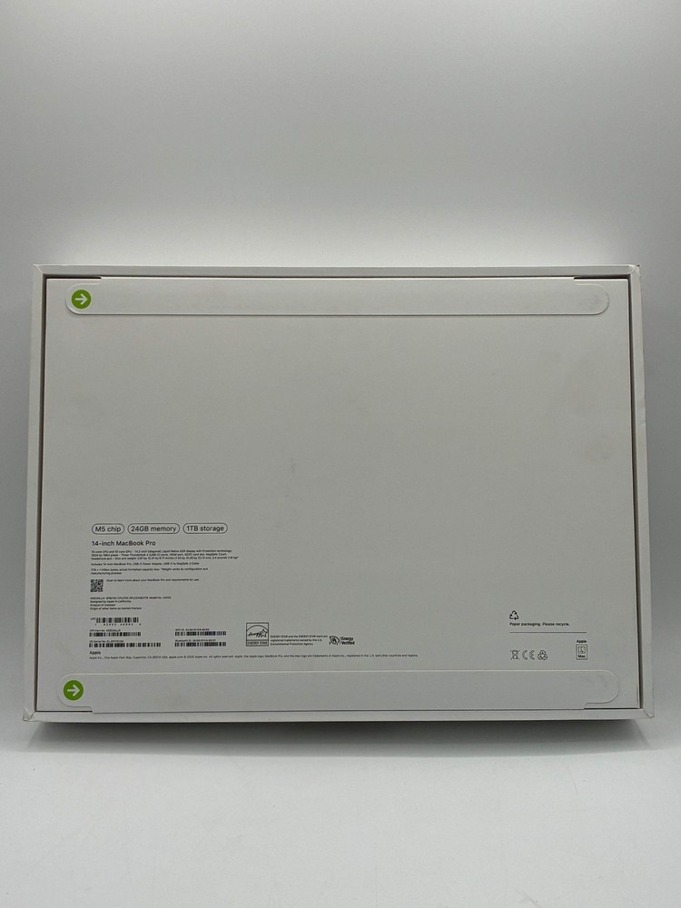 Apple MacBook Pro 14" M5 chip 24GB RAM 1TB SSD Space Black MDE14LL/A 2025 Model Item Specifications Condition New In Box Serial Number KLJ9073CQQ Included Accessories Charger Battery Life 0 Graphics Card None Hard Drive 1TB RAM 24GB Screen Size 14-inch Speed 3.6 Ghz Year 2025 Processor Apple M5 Cosmetic Description:The MacBook Pro is in pristine condition, sealed in its original packaging. It comes in a sleek black finish that emphasizes its modern design, ready to be unboxed. This Apple MacBook Pro 14" with the powerful M5 processor is designed for professionals and creatives alike, boasting a 14-inch display that provides stunning visuals. With a generous 1TB of hard drive space and 24GB of RAM, multitasking becomes effortless, allowing you to run multiple applications without a hitch. The impressive speed of 3.6 GHz ensures quick performance for any demanding tasks. Whether you're editing videos, designing graphics, or simply browsing the web, this laptop promises to deliver top-tier performance tailored to your needs. The included charger ensures you're always powered up and ready to go, making it a perfect companion for both work and play. Shipping & Returns:Free shipping and 30 day returns, seller pays for return label. Apple MacBook Pro 14" M5 chip 24GB RAM 1TB SSD Space Black MDE14LL/A 2025 Model Item Specifications Condition New In Box Serial Number KLJ9073CQQ Included Accessories Charger Battery Life 0 Graphics Card None Hard Drive 1TB RAM 24GB Screen Size 14-inch Speed 3.6 Ghz Year 2025 Processor Apple M5 Cosmetic Description: The MacBook Pro is in pristine condition, sealed in its original packaging. It comes in a sleek black finish that emphasizes its modern design, ready to be unboxed. This Apple MacBook Pro 14" with the powerful M5 processor is designed for professionals and creatives alike, boasting a 14-inch display that provides stunning visuals. With a generous 1TB of hard drive space and 24GB of RAM, multitasking becomes effortless, allowing you to run multiple applications without a hitch. The impressive speed of 3.6 GHz ensures quick performance for any demanding tasks. Whether you're editing videos, designing graphics, or simply browsing the web, this laptop promises to deliver top-tier performance tailored to your needs. The included charger ensures you're always powered up and ready to go, making it a perfect companion for both work and play. Shipping & Returns: Free shipping and 30 day returns, seller pays for return label. × × × × Buy now and save! Tell a friend Visit store Watch now Postage info Click the Postage tab above the listing description for more info Click the Postage tab above the listing description for more info! Additional delivery notes PICK UP OPTION Our items are available for pick-up. Pick up procedure is as follows: Purchase the item through eBay Email us to coordinate pickup PAYING VIA PAYPAL We accept PayPal on our all our items so you can shop with confidence. Simple choose the PayPal option when proceeding through the checkout. Additional Information No additional information at this time Ask seller a question You might also like FIFA Soccer 10 for PlayStation 3 - Complete with Box & Manual Playstation 3 Madden NFL 11 - Used With Box - Game Tested Working Batman: Arkham City (PS3) - Game of the Year Edition - Used with Box - Free Ship Xbox One Plants vs. Zombies: Garden Warfare 2 (Used, With Box) Contact To contact our Customer Service Team, simply click the button here and our Customer Service team will be happy to assist. Ask seller a question © SYG Astoria Postage Click the Postage tab above the listing description for more info Payment Accepted Payment Methods PayPal Returns Returns are accepted Items must be returned within 30 days of the auction ending Seller will pay for return shipping. eBay integration by
