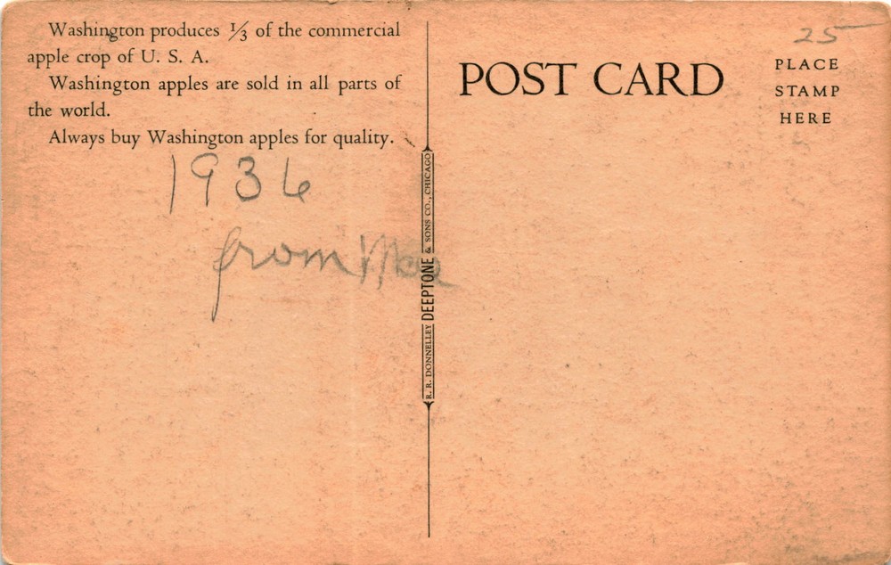MAKE AN OFFER. THE MORE YOU BUY THE BETTER DEAL I WILL ACCEPT This postcard features an image of an apple orchard in the Yakima Valley, Washington, from 1934. The text emphasizes Washington's significant role in apple production, stating that Washington produces three-quarters of the commercial apple crop in the United States. It also highlights the global reach of Washington apples, mentioning that they are sold worldwide and promoting them for their quality.