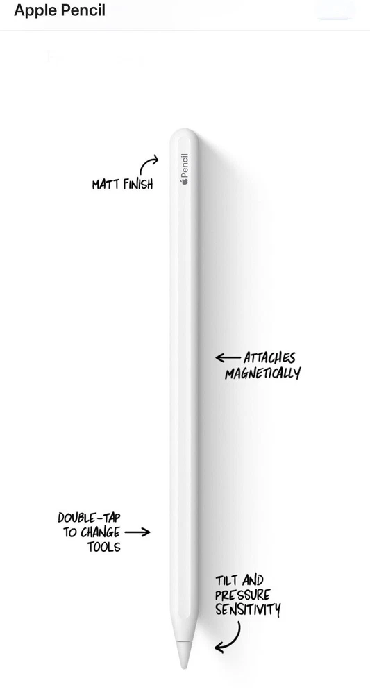 Apple Pencil (2nd Generation) - White. Excellent condition. Buy from a trusted 100% Feedback Seller No packaging - used. Overview: Apple Pencil (2nd generation) delivers pixel-perfect precision and industry-leading low latency, making it great for drawing, sketching, colouring, taking notes, marking up PDFs and more. And it’s as easy and natural to use as a pencil. Apple Pencil (2nd generation) also allows you to change tools without setting it down, thanks to its intuitive touch surface that supports double-tapping. Designed for iPad Pro, iPad Air and iPad mini, it features a flat edge that attaches magnetically for automatic charging and pairing. Compatibility: iPad Models iPad Pro 12.9-inch (6th generation) iPad Pro 12.9-inch (5th generation) iPad Pro 12.9-inch (4th generation) iPad Pro 12.9-inch (3rd generation) iPad Pro 11-inch (4th generation) iPad Pro 11-inch (3rd generation) iPad Pro 11-inch (2nd generation) iPad Pro 11-inch (1st generation) iPad Air (5th generation) iPad Air (4th generation) iPad mini (6th generation) Listing and template services provided by inkFrog