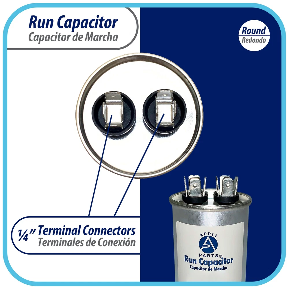 Appli Parts Run Capacitor for ac 40 Mfd uF (microfarads) 370 VAC or 450 VAC CBB65 Round Universal fit for hvac and other applications 4 in High 2 in Wide CON-40-450 Universal: Replaces any brand with the same capacitance capacity and voltage. Will work for 370V or 450V. 1/4 in Male Quick-connect Specs: Tolerance is +/- 5 % of Capacity, Working temperature environment from -40F (-40C) to +185F (85C). Dimensions 4 in H, 2 in W Protection: Protected for 10,000AFC which means this product will not burst if by any reason is short circuits Replaces: TRCF40 PRCF40A CAP-40-450-R Confirm that the dimensions and other attributes of the product closely match those of the original item being replaced Weight : 0.64 LBR Volume : 0.01175944 FTQ Model : CON-40-450 UPC-EAN : 814245022990 Air conditioning, refrigeration and electric motor Run Capacitor. This product replaces several models and brands not limited to: 2MEE2, 2MEH5, 25L501, 25L501BX, 40-4D, 97F9614, 97F9614BX, 97F9614BX-TR7, 97F9642, 97F9642BX, 97F9642BX-TR7, 800P406H44N36A4X, 12221, 12245, 12721, 12745, 14245, 37400R, 45400R, AP4328945, AP5667612, AP5668076, AP5970612, C340, C340R, C440, C440R, CPT00236, CPT00240, CPT0236, CPT0240, CPT236, CPT240, CPT-0236, CPT-0240, G31-795, G35-336, G35-389, G36-054, G36-072, G36-307, P291-4004R, PRC40A, PRCF40A, TRC40, TRCF40 40MFD, 40uF, 40 MFD, 40 uF, 40-450, 40/450, 40-440, 40/440, 40-450VAC, 40/450VAC, 40-440VAC, 40/440VAC, 40-370, 40/370, 40-370VAC, 40/370VAC Prestalia e-commerce solutions.