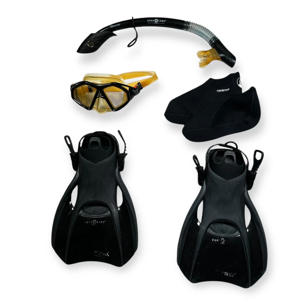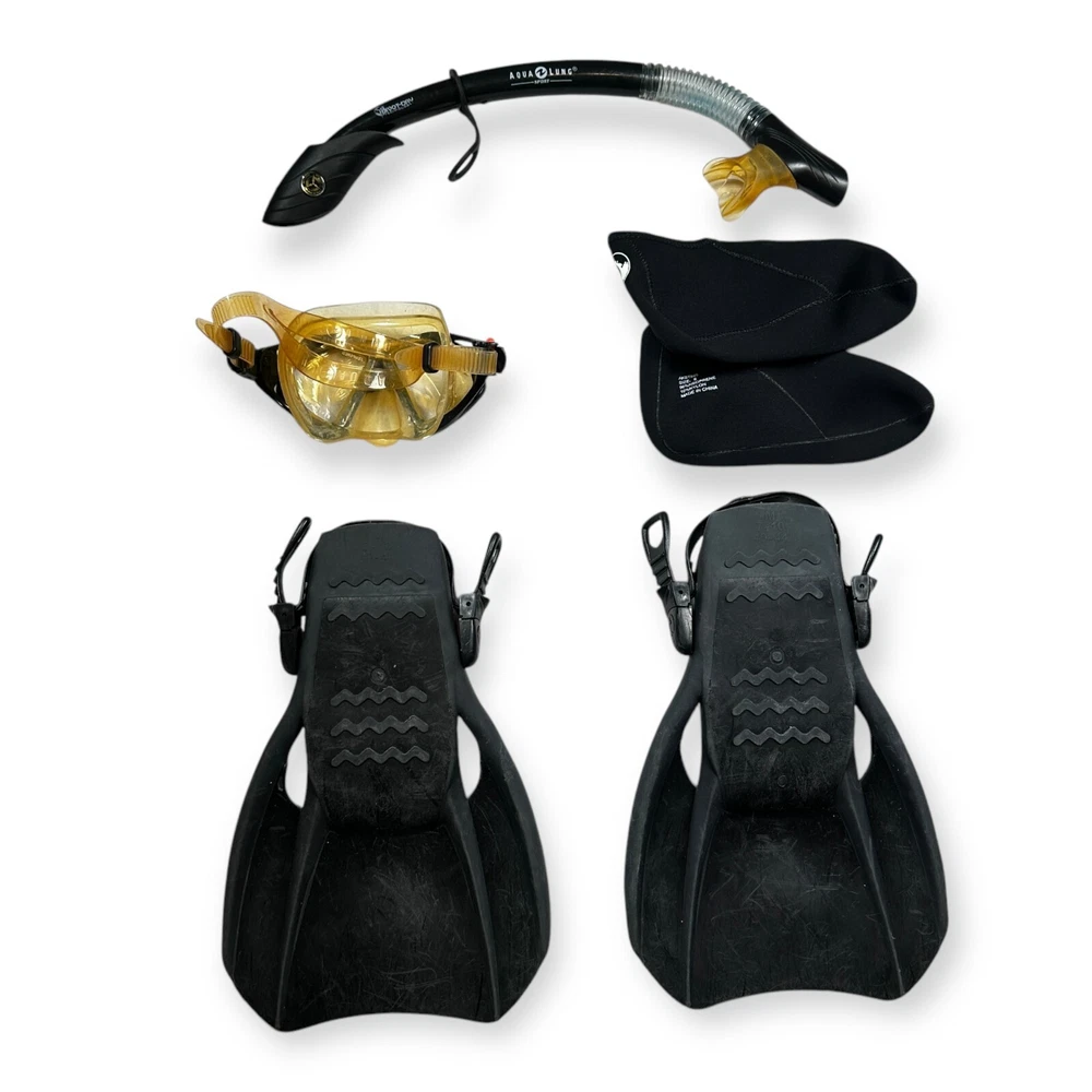 Preowned in functional condition! Some cosmetic defects from use. Includes Snorkel Mask Booties Flippers