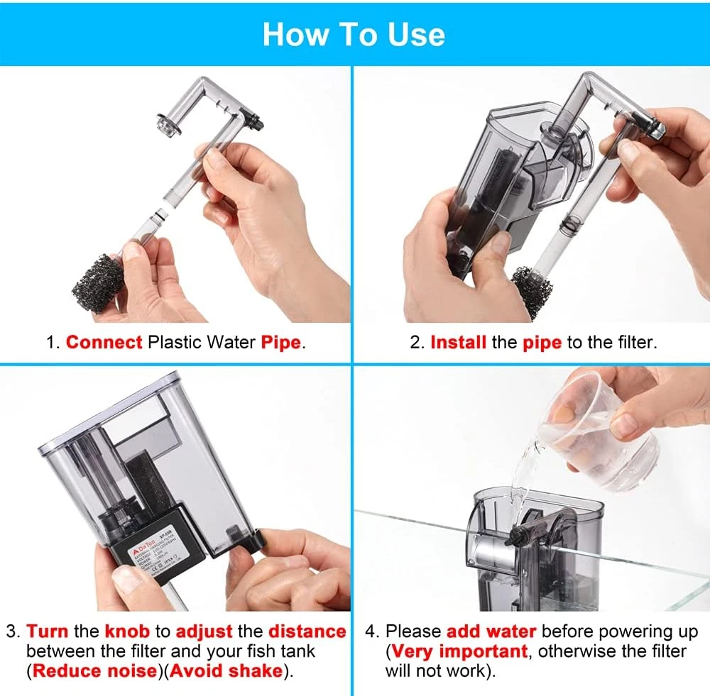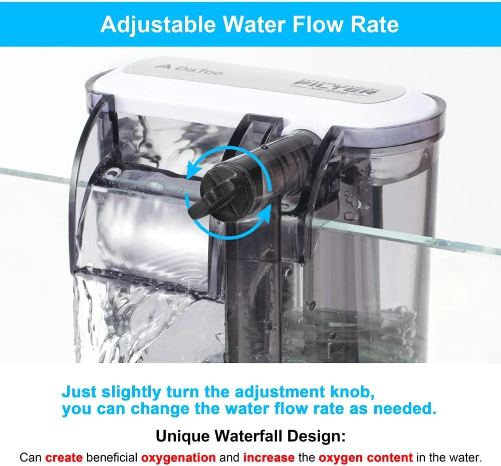 DaToo Aquarium Hang-On Filter: Owning a successful aquarium is the dream of every aquarium hobbyist. But what is the key to the success of the aquarium? The answer must be the perfect filter. DaToo Aquarium hang on filter has a powerful & whisper-quiet filter system, safe and durable, adjustable water flow rate, can easily create a clean, clear and stress-free water environment for your beloved fish. Select DaToo hang-on filter, let us immediately have a successful aquarium. Powerful & Whisper-Quiet Filter System: 2.5W water pump, powerful and energy saving, can easily move water through the filter cartridge at a rate of 42GAL/H (160L/H). Working sound ≤35db, giving you a whisper-quiet night. 100% research-grade activated carbon, can effectively remove odors, discoloration and impurities in water, and the filtering effect is 1.5 times that of other fish tank filters. Durable And Safe: Super-strength ABS shell, sturdy and durable, without fear of any external force damage and chemical corrosion, longer service life. DaToo adds an extra bio-foam at the inlet of the filter, which not only enhances the filtering effect but also prevents small fish from being sucked, giving your lovely fish a safer environment. Adjustable Water Flow Rate: Sometimes our aquarium inhabitants need a more gentle water flow, DaToo hang-on aquarium filter can help you achieve it easily. Just slightly turn the adjustment knob, you can change the water flow rate as needed. The unique waterfall flow design can create beneficial oxygenation and increase the oxygen content in the water, which makes our aquarium inhabitants healthier and more energetic. FIT & ONE YEAR WARRANTY: This is an ultra-thin design filter, perfect for 3~10 gallon tanks. One Year Warranty, buy DaToo products with confidence. JUST DO IT, Let’t Go!! The Best Aquarium Hang On Filter For Your Needs Specification: Voltage: 110~ 120V/60Hz Power: 2.5W Size: 3.2*1.1*7.3Inch Cable Length: Flow: 42Gal/H (160L/H) Application: 3~10 gallon tank Features: - Powerful & Whisper-quiet Filter System - 100% Research-Grade Activated Carbon - Safe And Durable - Energy Saving - Adjustable Water Flow Rate - Longer Service Life - One Year Warranty NOTICE: 1. To reduce noise and avoid shake, please turn the knob at the bottom of the filter to adjust the distance between the filter and your fish tank. 2. Before turning on the power, you need to add water to the filter, otherwise the filter will not work. Why Do I Select DaToo Aquarium Hang-On Filter? 1. Powerful & Whisper-quiet Filter System: 2.5W powerful and energy-saving water pump, working sound ≤35db, can easily move water through the filter cartridge at a rate of 42Gal/H. 2. 100% Research-grade Activated Carbon, can effectively remove odors, discoloration and impurities in water, and the filtering effect is 1.5 times that of other filters. 3. Durable: High-strength ABS shell, without fear of any external force damage and chemical corrosion, longer service life. 4. Safe: An extra bio-foam at the inlet of the filter, which not only enhances the filtering effect but also prevents small fish from being sucked, giving your lovely fish a safer environment. 5. Adjustable Water Flow Rate: Just slightly turn the adjustment knob, you can change the water flow rate as needed. 6. Beneficial Oxygenation: Unique waterfall flow design, can create beneficial oxygenation and increase the oxygen content, which makes our aquarium inhabitants healthier and more energetic. 7. One Year Warranty, buy DaToo products with confidence. Select DaToo Products= Own A Private Aquarium Housekeeper. JUST DO IT, Let’t Go!!