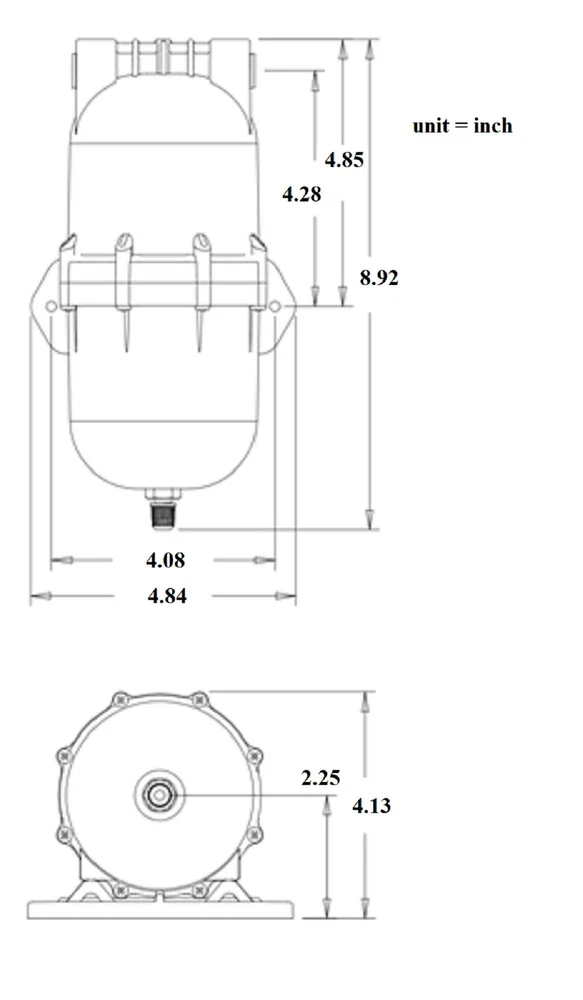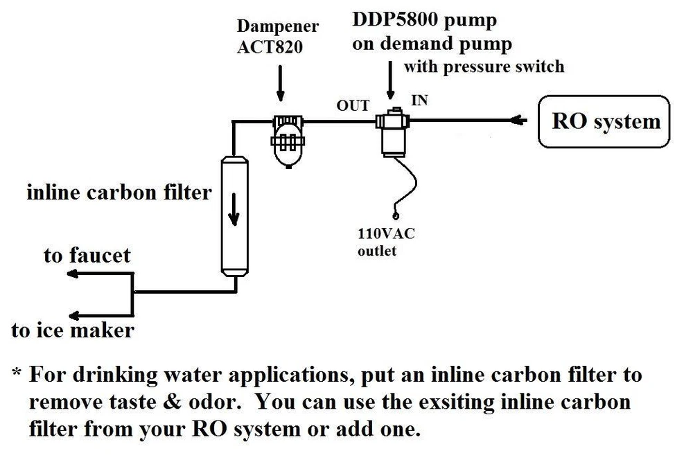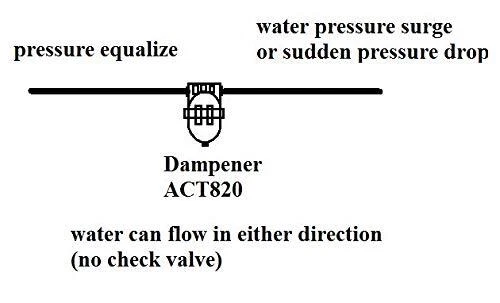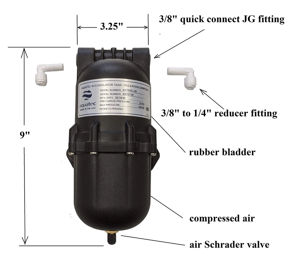 Applications: This Dampener tank should be used with any Aquatec 5800 series demand delivery pumps. 5801, 5802, 5803 Ideal for applications where consistent pressure is required when use in conjunction with booster pump and demand pump. Ice maker pumps, misting pumps, line pressure pumps, etc. Ideal for applications that use pressure switch, level switch, float valve, flow meter Ideal for sensitive applications where water or liquid pressure spikes should be minimized. For food processing equipment, dental chair, humidifiers, misting sprayers, instruments, machines, etc. Aquatec Pulsation Dampener accumulator pressure tank for demand delivery pumps and misting aeroponics booster pump. Dampens pressure switch cycling pulsating issues, limit water hammer. Ideal for ice maker pump, commercial coffee maker, vending machines, float valves, level switches, flow meter, sensitive instrument, food processing equipment, where consistent water pressure is required. Specification Dimension: Length 8.92” Height 4.13” NSF food grade materials Mounting bracket installed (hard rubber material) Max Pressure: 125 psi Pre-charge air pressure: 20 psi Inlet/outlet: Non-directional, no check valve inside, 3/8” JG quick connect, can be converted to other sizes using adapter fitting. Features: Compact design, NSF list food grade material for potable water. Dampens pump switch pressure switch cycling and pulsating. Pump turns on, off, on, off. Limits harmful pressure spikes and water hammer in pipes Provides consistent water pressure. Minimizes hydraulic noise Easy installation and maintain Mounts in any position with included bracket 3/8” JG quick connect fitting for 3/8” OD tubing. Includes two 3/8” to 1/4” reducer fitting for 1/4" OD tubing Compact design, NSF list food grade material for potable water. Dampens pump switch pressure switch cycling and pulsating. Pump turns on, off, on, off. Limits harmful pressure spikes and water hammer in pipes Provides consistent water pressure. Minimizes hydraulic noise 3/8” JG quick connect fitting for 3/8” OD tubing. Includes two 3/8” to 1/4” reducer fitting for 1/4" OD tubing