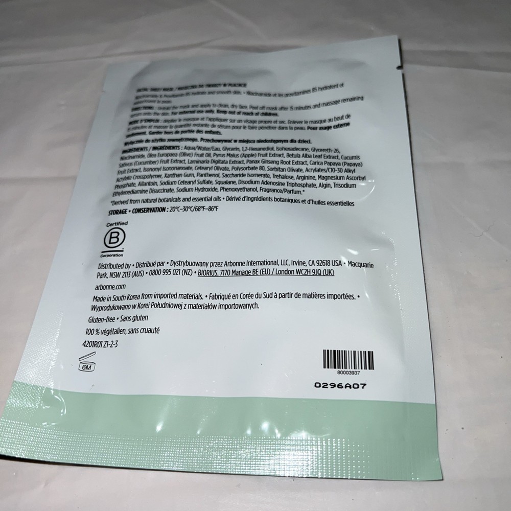 Arbonne Radiance Sheet Mask With Niacinamide Face Mask Hydrate Brighten Tone.