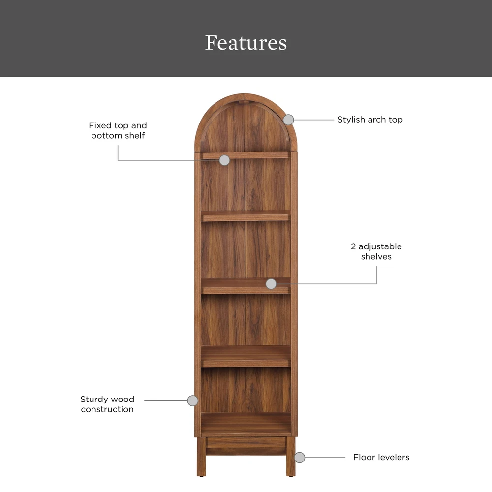 Arched Narrow Bookcase 66.5"H Five Shelves Walnut Finish Juliet Collection Introducing the Juliet Narrow Arch Bookcase, a perfect blend of form, function, and flair for your home. This bookcase is a statement of elegance and versatility, designed to enhance any interior décor. With its rounded arch top, the Juliet Narrow Arch Bookcase captivates with architectural grace and a modern twist. A perfect match for your personal style, whether you're aiming for a bright and airy vibe or a sleek, sophisticated look. The Juliet stands out with its five spacious shelves, each adjustable to accommodate your collection of books, cherished collectibles or decorative pieces. This flexibility makes it an ideal solution for those who love to refresh their spaces or display an ever-changing array of items. The shelves are built to be sturdy, ensuring that your treasures are displayed securely and stylishly. Crafted with durability in mind, the Juliet Narrow Arch Bookcase promises long-lasting quality. Whether it finds a place in your living room, study, or hallway, this bookcase is designed to elevate your space and showcase your style with sophistication. Make the Juliet part of your home and enjoy the perfect combination of beauty and practicality it brings to every corner. It's more than a bookcase – it's a centerpiece that reflects your taste and complements your lifestyle. Spacious adult standard cabinet for storage and display 2 adjustable shelves and 2 fixed shelves for storage and display Anti-tipping hardware included Finish: Walnut Assembly required Product Dimensions: 18 in W x 15.75 in D x 66.25 in H (45.8 cm x 40 cm x 168.3 cm) Shipping/Fulfillment We offer FREE shipping to most States except for the following: California, Connecticut, District of Columbia, Massachusetts, Louisiana, Maryland, Mississippi, Tennessee, Washington, New Mexico, Illinois We use a selection of shipping services such as but not limited to: UPS, FedEx, USPS, DGM SmartMail Expedited, etc. We only ship to the lower 48 states, no APO/FPO addresses, or PO Boxes allowed. Local pickups and combined shipping options are not provided at this time. ORDER FULLFILLMENT Most items are forwarded to our supplier for processing, which will then be fulfilled through a distributor that is closest to your location. Th ese distributors may be names you recognize or sourced from smaller local operations. Return You can return a product for up to 30 days from the date you purchased it. Any product you return must be in the same condition you received it and in the original packaging. Payment We accept payment by any of the following methods: PayPal, GPay, Venmo, Visa, Mastercard, American Express, and Discover Feedback Customer satisfaction is very important to us. If you have any problem with your order, please contact us and we will do our best to make you satisfied. Contact Us If you have any queries, please contact us via eBay. We usually respond within 24 hours on weekdays. Please visit our eBay store to check out other items for sale! Thank you for shopping at our store.