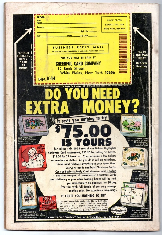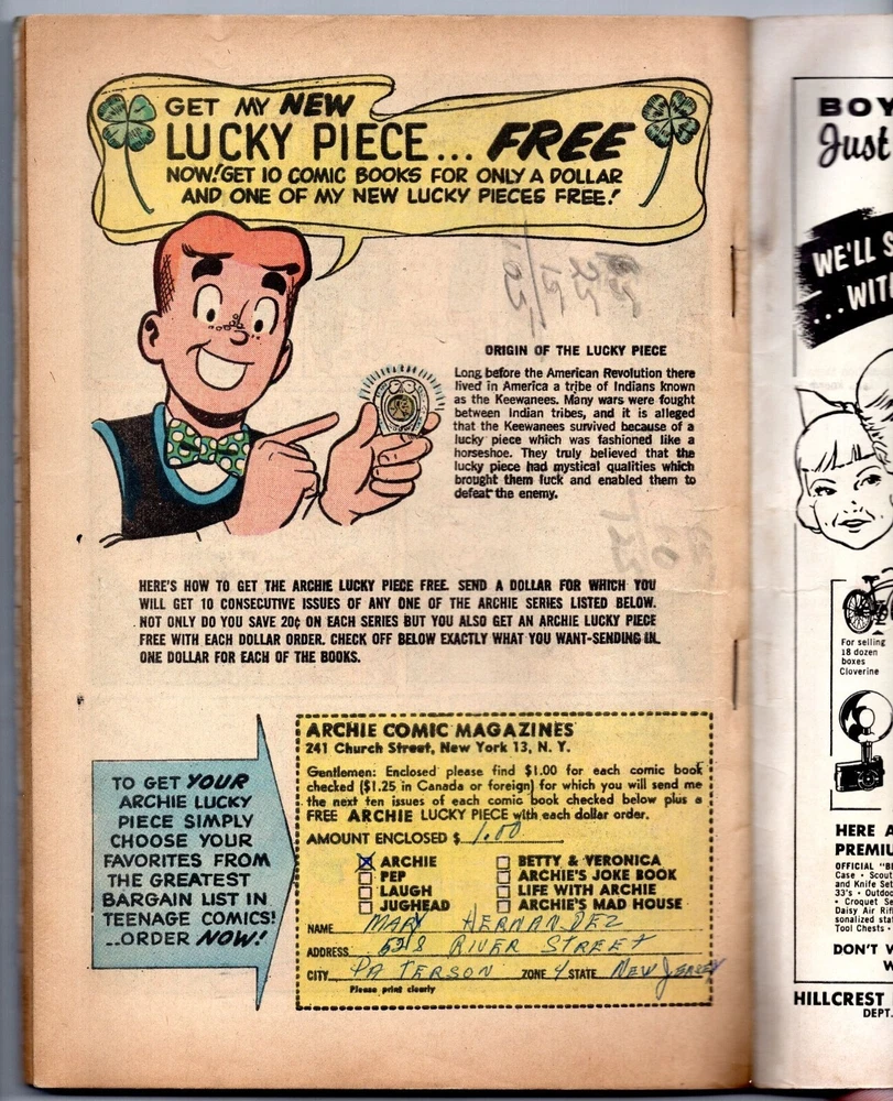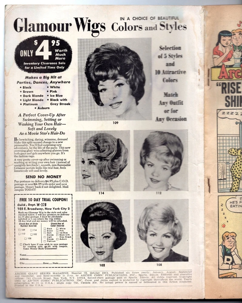 "Around the World with Archie," 25¢ cover, stories include "Rise and Shine," "Please Be Seated," "Mummy Knows Best," "Water Boy," "U.N. Antics," "By Hook or Cook," "And So To Bed," "Father Knows Least," "Washington Bound," "All Around the Town," "Flyin' High," and "All's Well That End!" • Archie Giant Series #29 • October, 1964 issue • Bagged and boarded, of course. Condition: Low grade. Mild wear on cover edges and pages. No missing pages, no cut-outs. Some tracing of the word "Archie" on the cover. Light pen mark at the top of an interior page. Writing on last page (some pencil math and some pen used to fill out a coupon.Spine solid. Pages cream-colored. Colors sharp. Free shipping. Professional packaging always, since 2003.