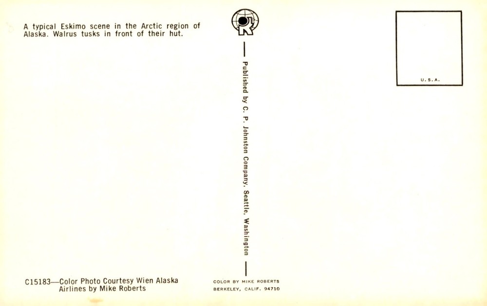 This postcard depicts a typical Eskimo scene in the Arctic region of Alaska, with walrus tusks in front of their hut. Published by C. P. Johnston Company in Seattle, Washington.