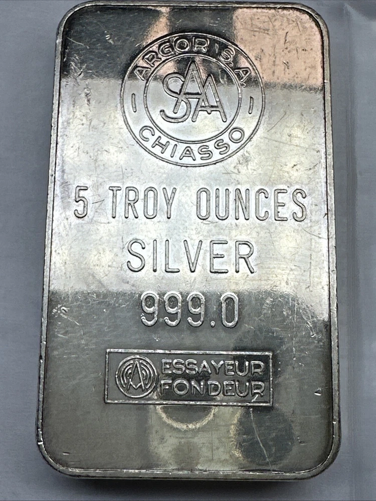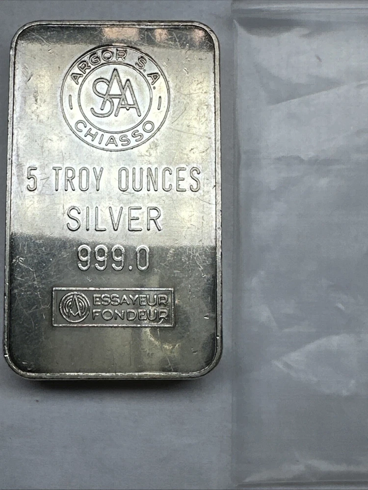 This is a vintage Argor Chiasso 5 oz silver bar made of 0.999 fine silver. It features the "Essayer Fondeur" mark, indicating the bar's quality and authenticity. Produced in Switzerland by Argor S.A. Chiasso, this bar contains a total of 5 oz of precious metal content.