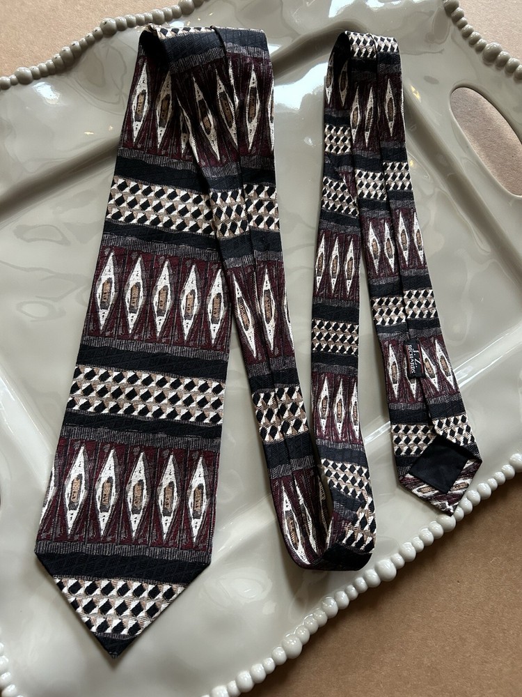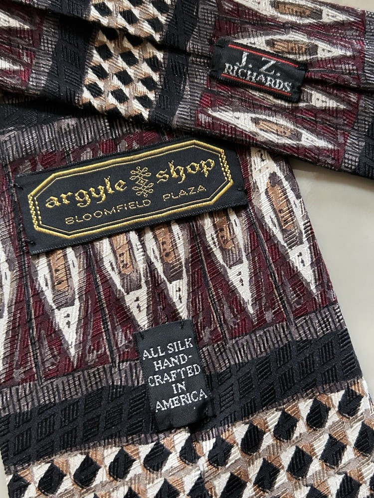 Elevate your sartorial choices with the Argyle Shop's premium necktie, a testament to timeless style and impeccable craftsmanship. The tie features a bold, black and white burgundy geometric pattern, offering a sharp contrast that's sure to make a statement. Crafted from the finest silk, this classic-width HANDMADE tie is designed to provide a perfect knot and a sleek drape, complementing any gentleman's ensemble. Whether for business or a special occasion, this Argyle Shop tie adds a touch of sophistication to your outfit. 4 X 59