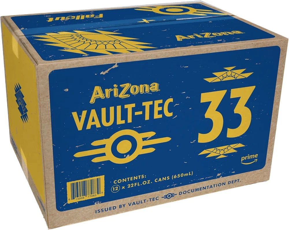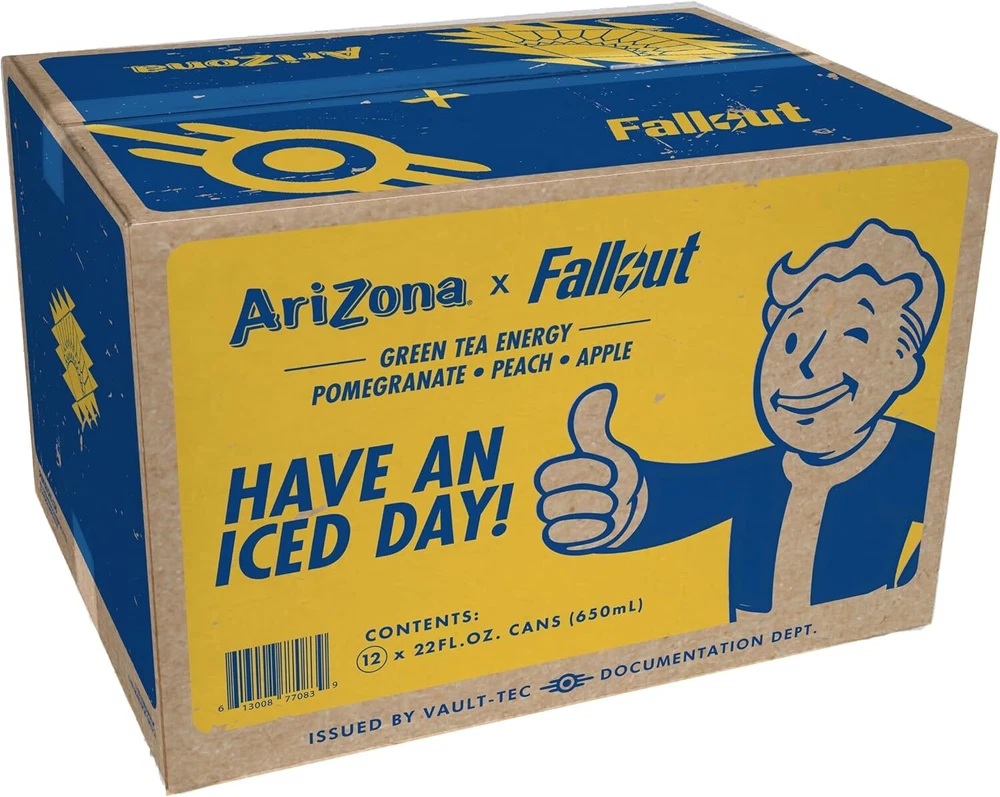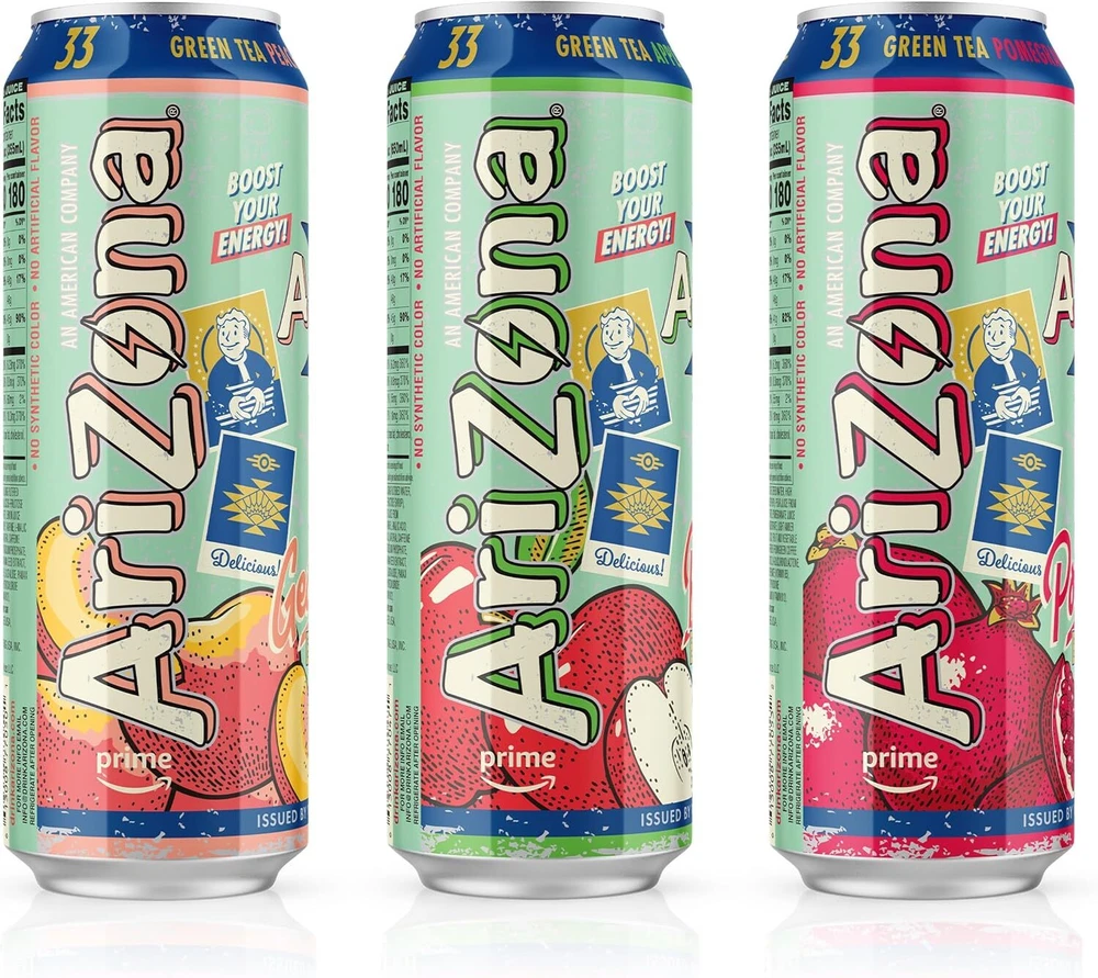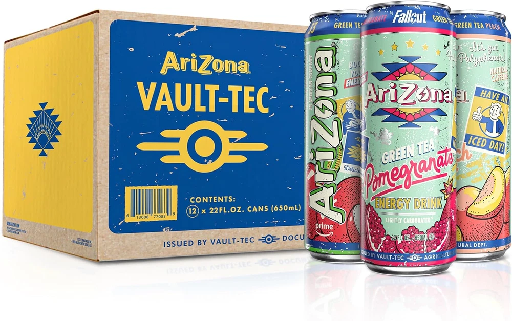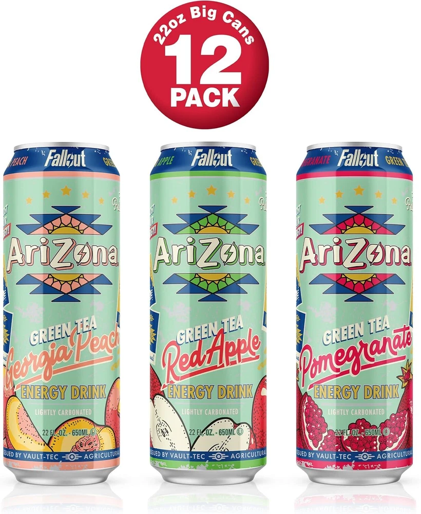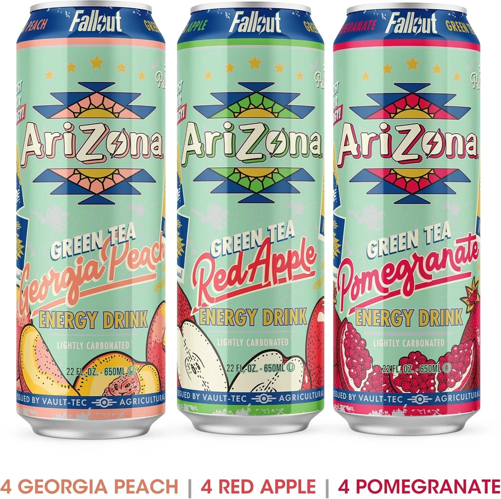 AriZona x Fallout Green Tea Energy Drink, 12pk 22 fl oz, Variety Pack 3 Flavors Official merchandise from the Original series Fallout 100 Calories per serving - Made with Real Juice! Each Can contains Natural Caffeine - 234mg per Can Includes twelve of 22 fl oz cans of AriZona x Fallout Green Tea Energy Drink Variety Pack - 3 different flavors, 4 cans per flavor Lightly Carbonated Energy Drink with Vitamin B6, B12, Potassium, and Polyphenols! 9.7 inches x 12.0 inches x 8.9 inches. Weight: 19.25 lb Item model number 1001256 Number of Items 1 Country of Origin USA Flavor Name Variety Pack Package Information Can Flavor Variety Pack Item Form Liquid Package Dimensions 12 x 9.7 x 8.9 inches; 19.25 Pounds