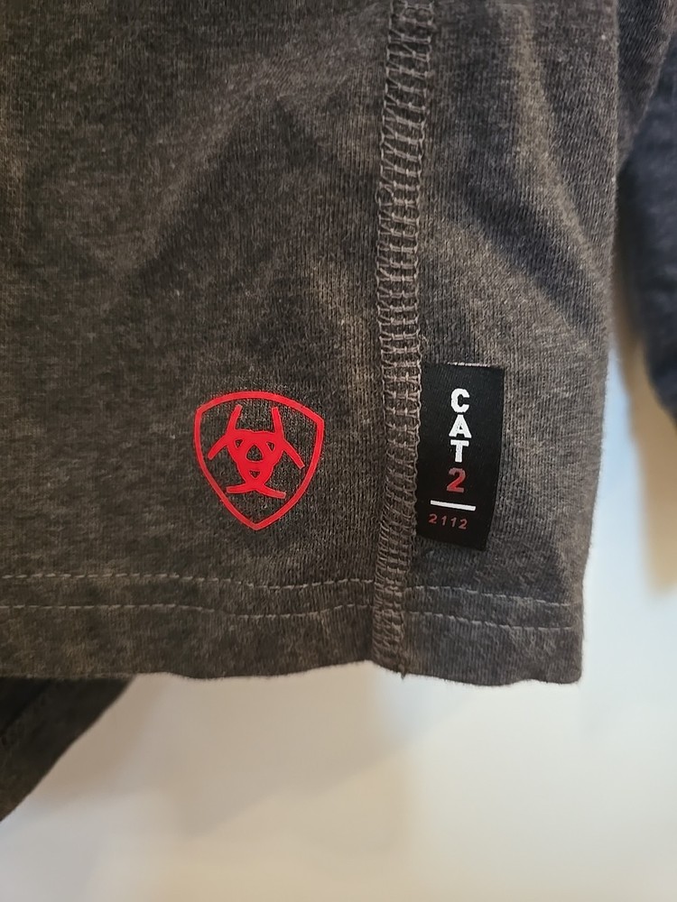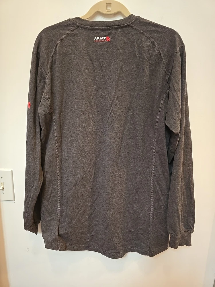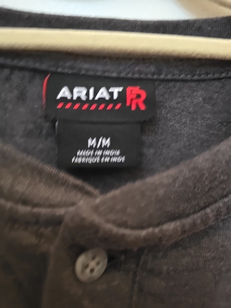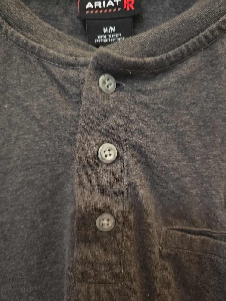 The Ariat FR Henley Shirt is a men's medium gray shirt made from fire-resistant cotton fabric with a Henley neckline and long sleeves. It features a relaxed fit, solid pattern, and is machine washable. The shirt is part of the Ariat Pro Series and is designed for all seasons, making it suitable for various occasions. With its classic 90s style, the shirt also includes accents like buttons and a logo, as well as convenient features like pockets and heavyweight construction. ** Elliot logo