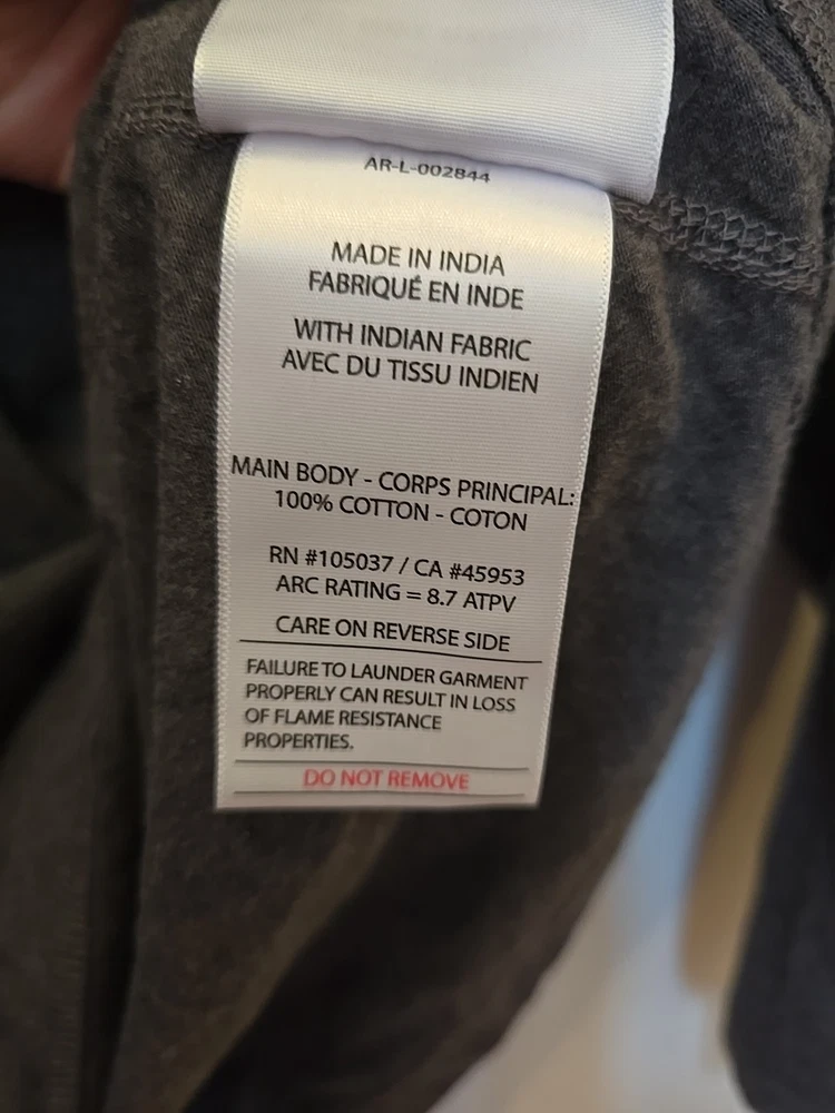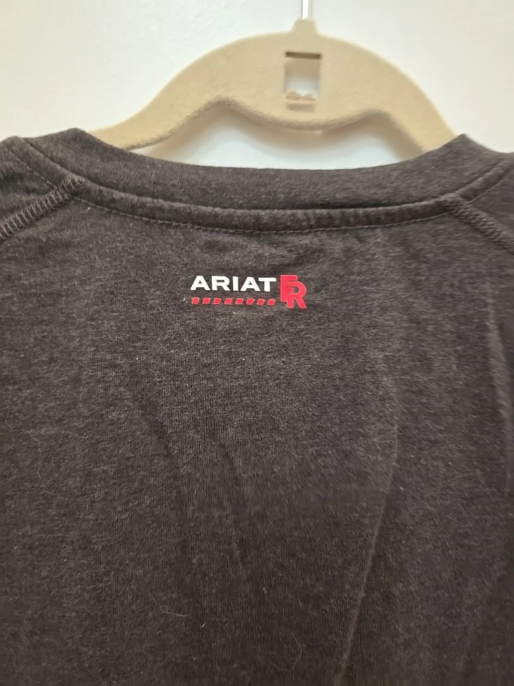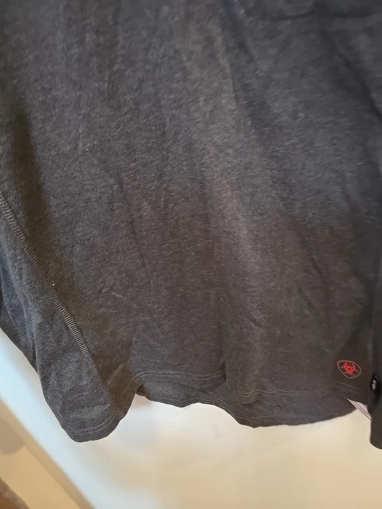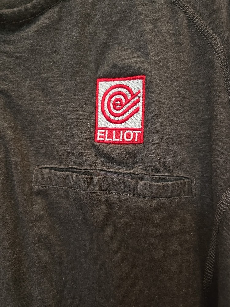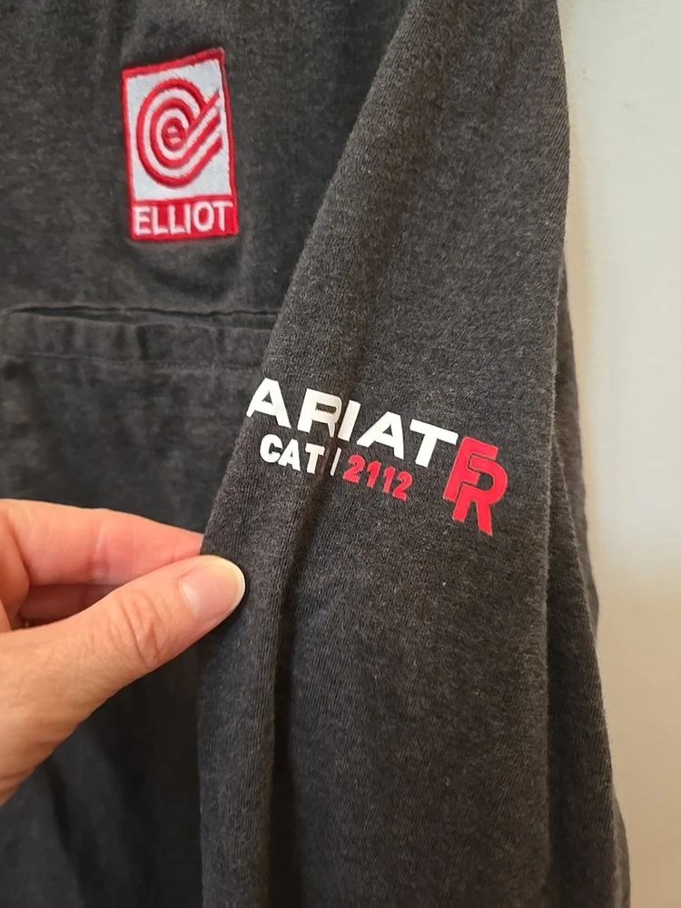 The Ariat FR Henley Shirt is a men's medium gray shirt made from fire-resistant cotton fabric with a Henley neckline and long sleeves. It features a relaxed fit, solid pattern, and is machine washable. The shirt is part of the Ariat Pro Series and is designed for all seasons, making it suitable for various occasions. With its classic 90s style, the shirt also includes accents like buttons and a logo, as well as convenient features like pockets and heavyweight construction. ** Elliot logo