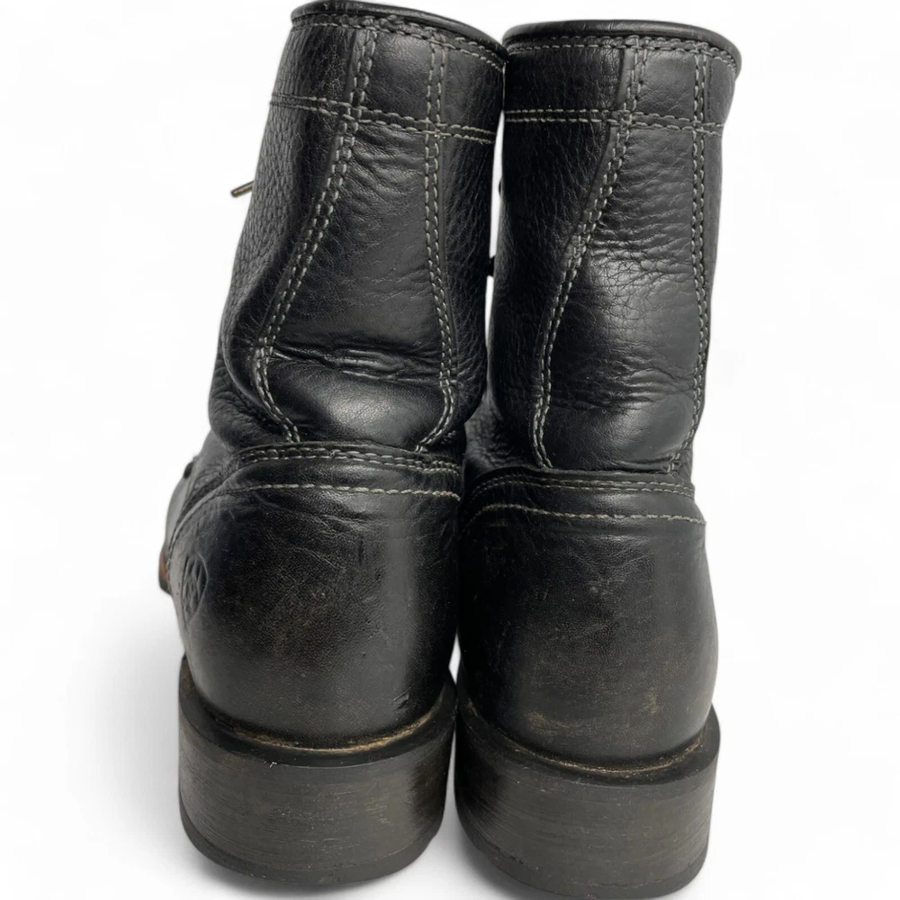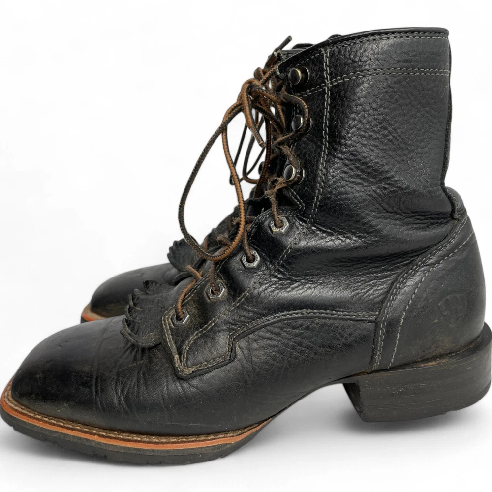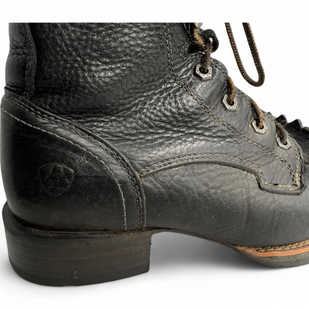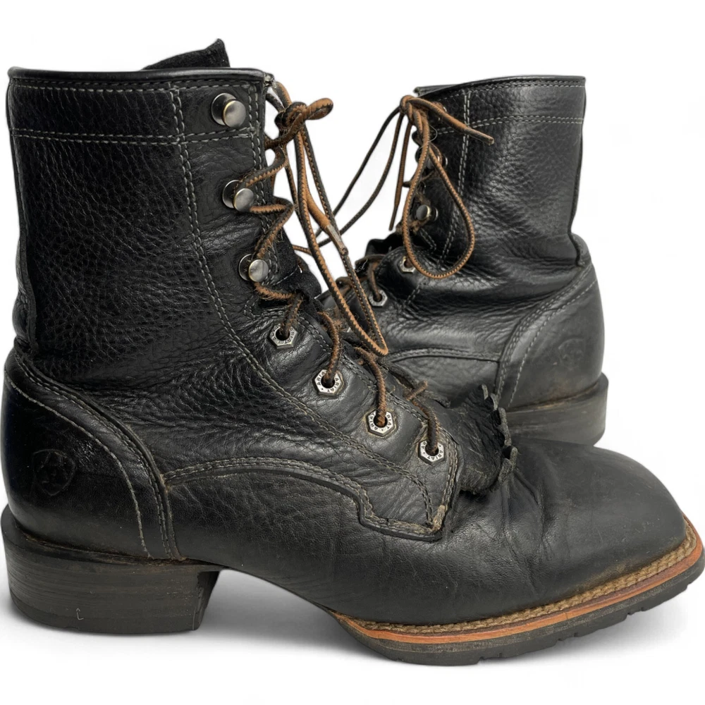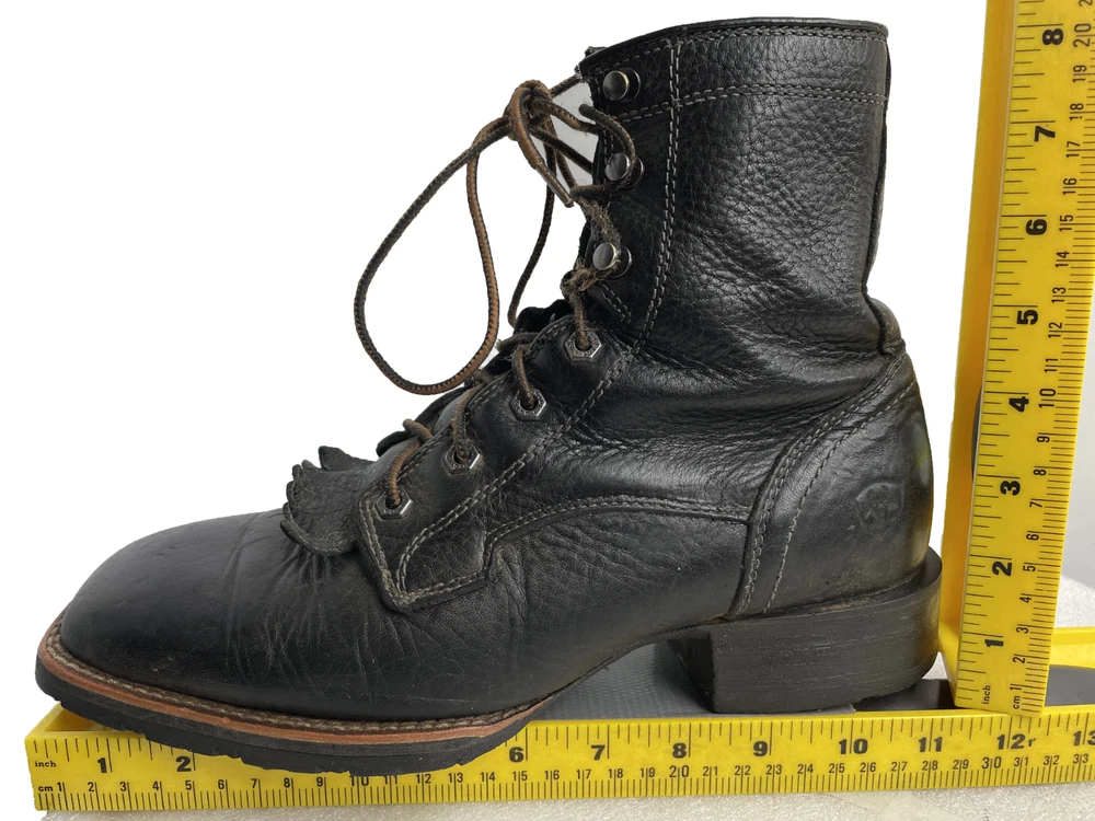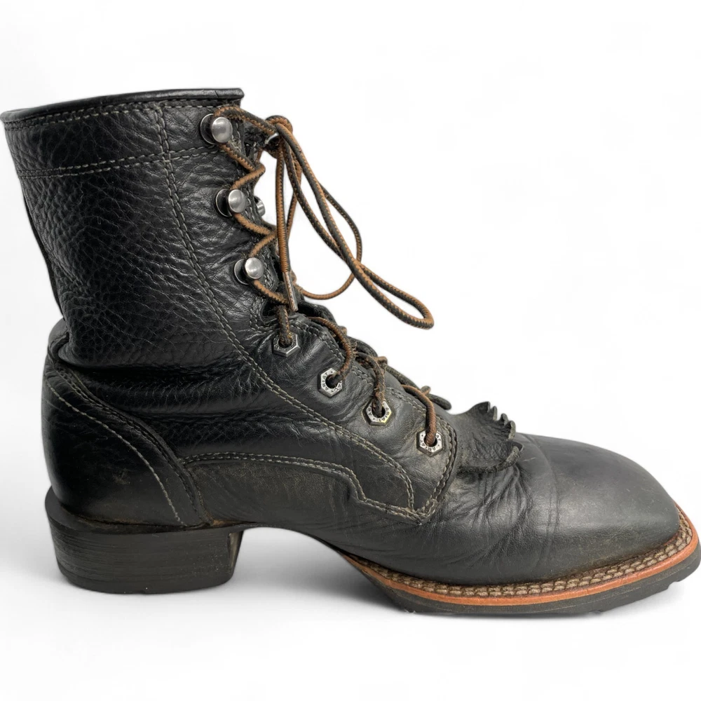 Style: Work Color: Black Pattern: Solid US Shoe Size: 8 Department: Men Brand: Ariat Closure: Lace Up Model: Ariat 10012777 Features: Comfort Product Line: Ariat Hybrid Lacer Accents: Embroidered Toe Shape: Square Toe Upper Material: Leather Shoe Width: D Type: Boot Theme: Biker, Cowboy, Western, Work