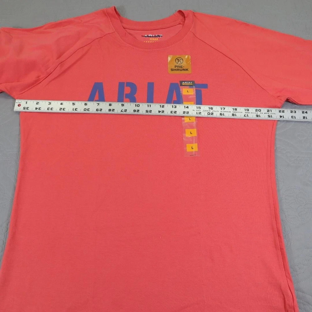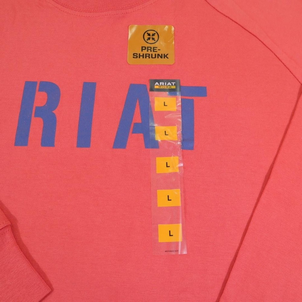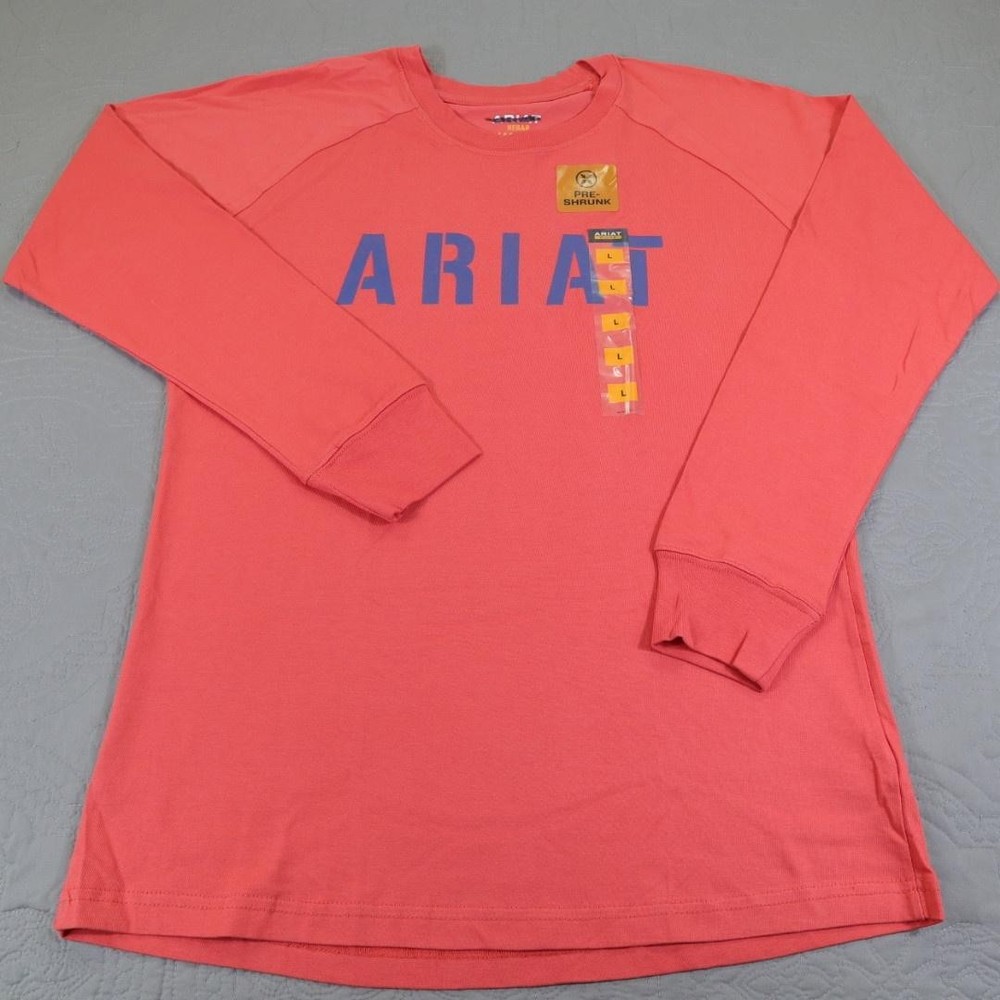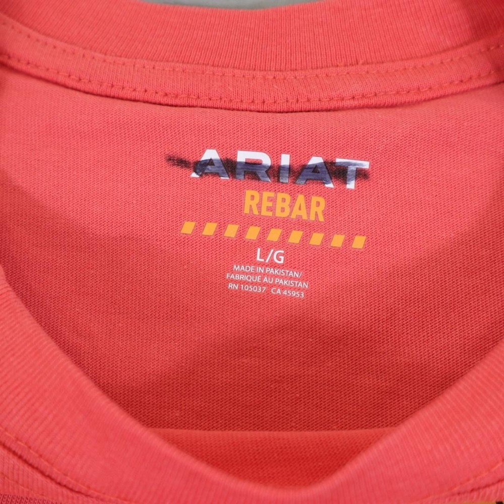 Brand: Ariat Line: Ariat Rebar workwear collection long sleeve graphic shirt. Color: Coral / salmon with blue ARIAT logo across the chest. What it is: Mens long sleeve crewneck shirt/tee with raglan-style sleeves. Size on tag: Large (L/G). Material: 100% cotton main body (per care tag). Country of manufacture: Made in Pakistan. RN 105037; CA 45953. Details: Crew neckline, ribbed cuffs, straight hem, large front logo print, inner neck printed branding, and front hang tag noting "PRE-SHRUNK" plus size sticker strip.