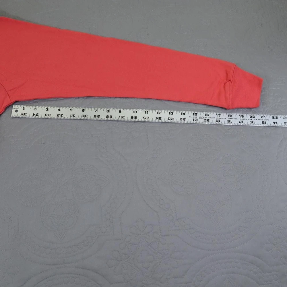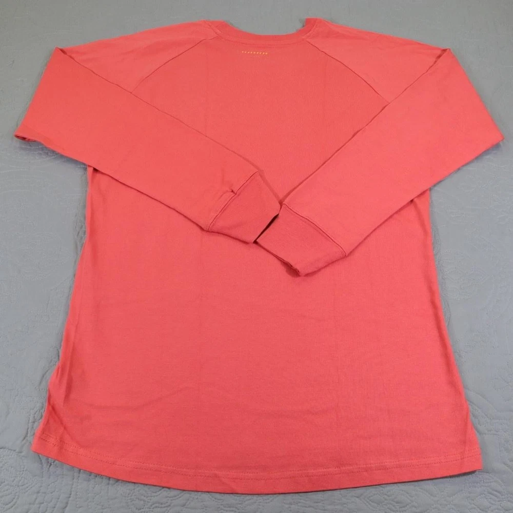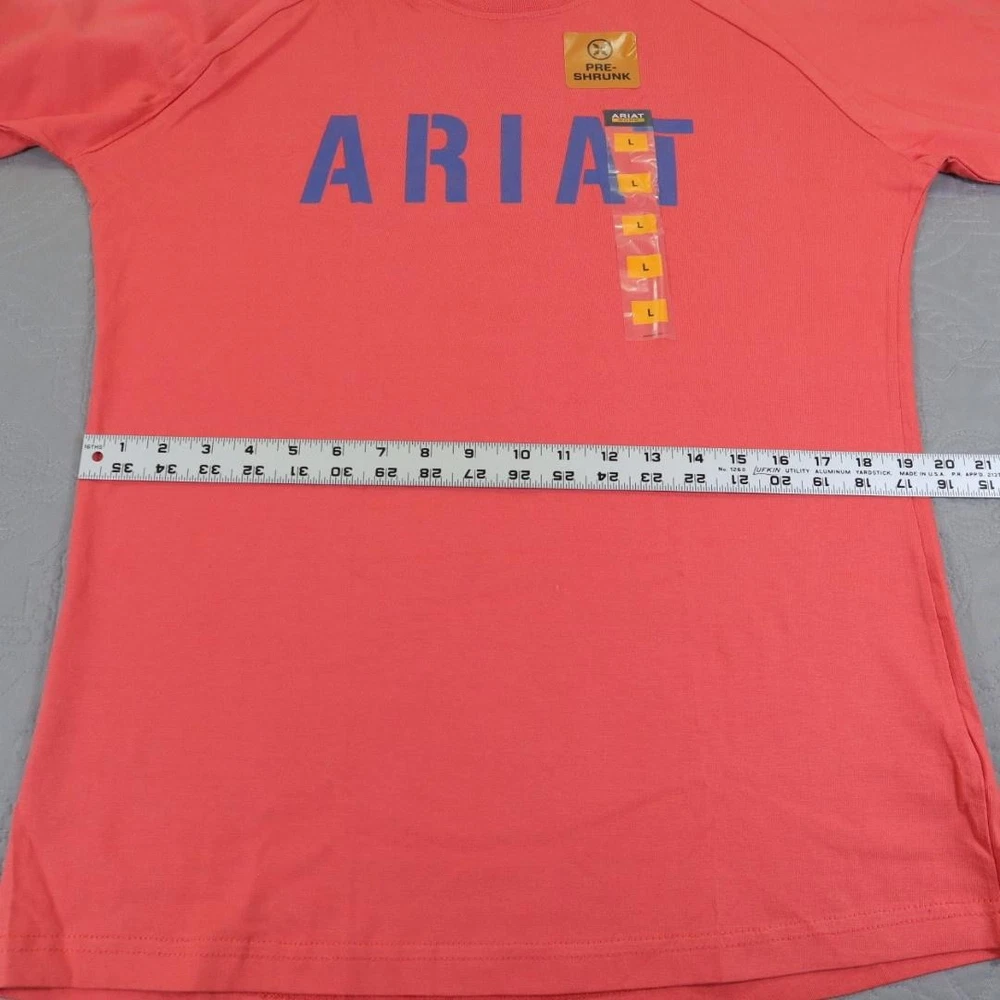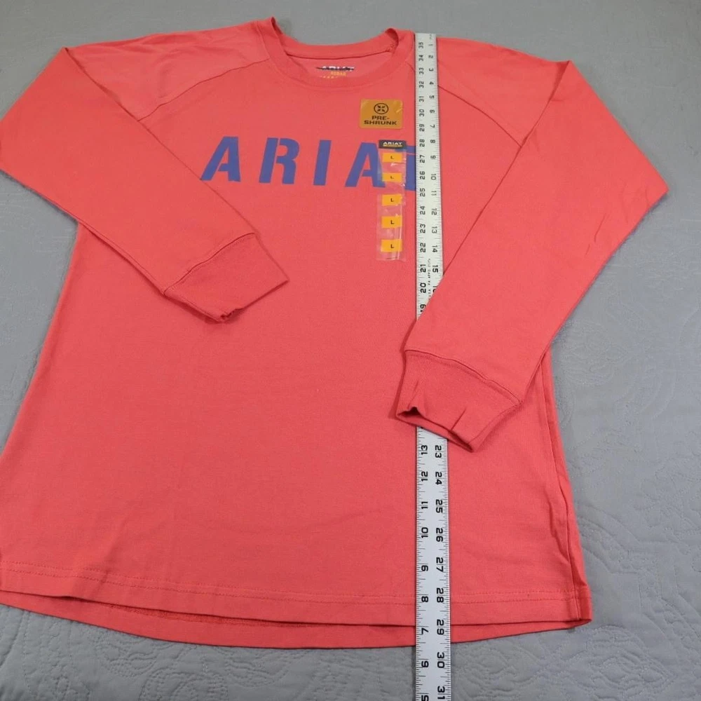 Brand: Ariat Line: Ariat Rebar workwear collection long sleeve graphic shirt. Color: Coral / salmon with blue ARIAT logo across the chest. What it is: Mens long sleeve crewneck shirt/tee with raglan-style sleeves. Size on tag: Large (L/G). Material: 100% cotton main body (per care tag). Country of manufacture: Made in Pakistan. RN 105037; CA 45953. Details: Crew neckline, ribbed cuffs, straight hem, large front logo print, inner neck printed branding, and front hang tag noting "PRE-SHRUNK" plus size sticker strip.