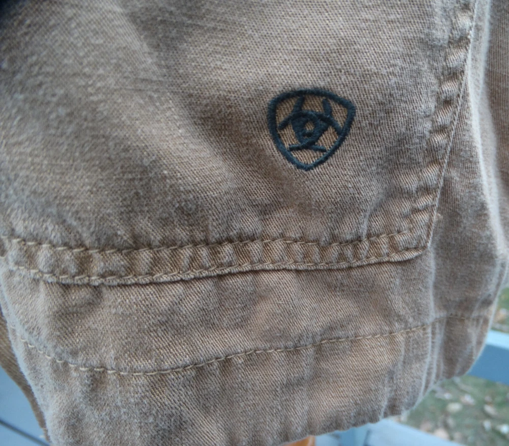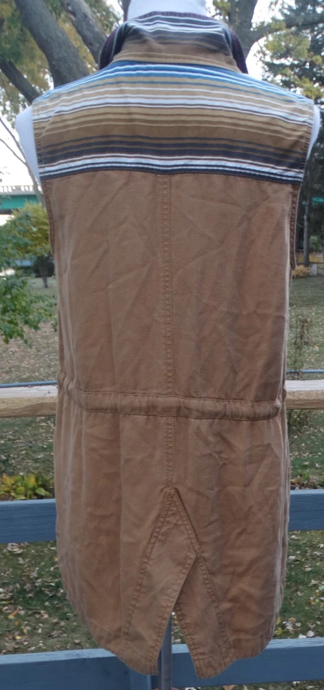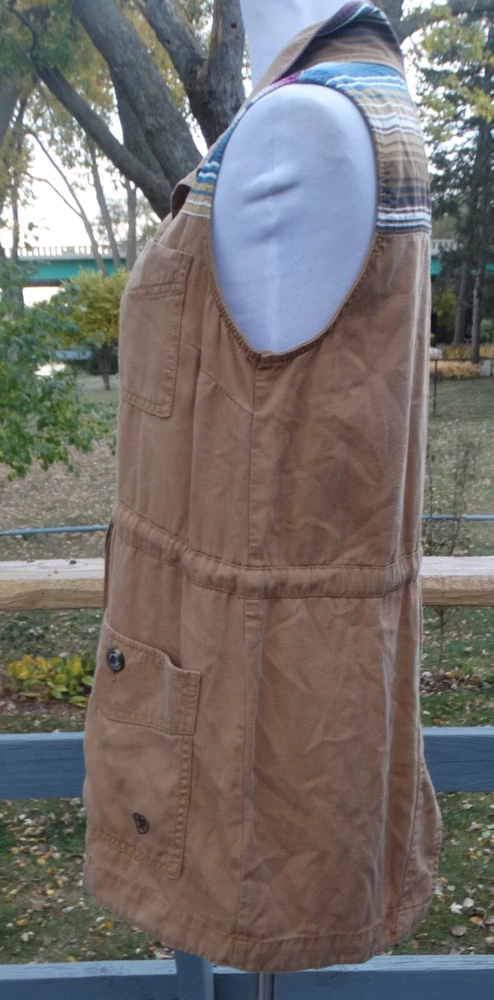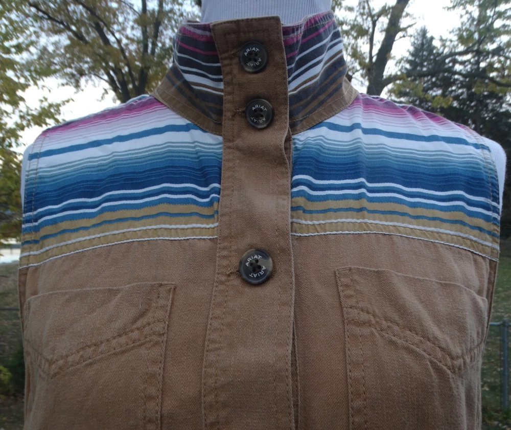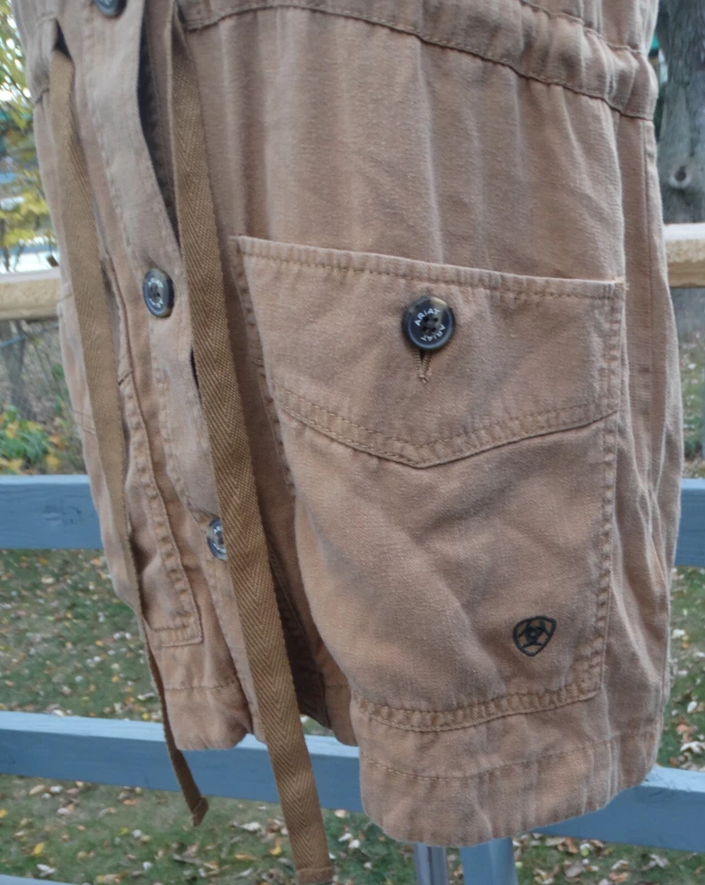 Ariat First Rodeo Update Vest Color - Weekend Warrior Dijon size Medium, relaxed fit armpits 20.5" wide, hips 21" wide, shoulder to hem - 28" Utility style vest with chest and hand patch pockets Contrast serape yoke overlay Drawcord waist Split back hem detail Button front 100% Tencel Lyocel Gently worn condition, no flaws smoke free home, I give FREE shipping and accept returns ( clothes have tendency not to fit) BUT if returned I WILL DEDUCT shipping cost (usually $4-8 depending on weight)