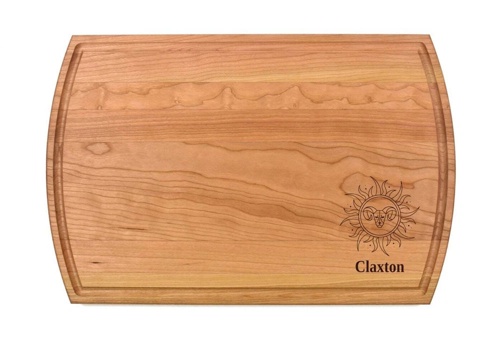 Design: Personalized Aries Cutting Board or Charcuterie Serving Tray All items ship via USPS - please make sure your address is correct :-) Whether used as a charcuterie serving tray for snacks or cutting board, our bamboo, walnut and cherry custom boards are the perfect addition for the home and make the perfect gift for your loved one celebrating a birthday, anniversary, new home, wedding, etc! *** FEATURES *** • SIZES: We have multiple styles and sizes available. To see our current sizes available, click the drop-down menu. The photo slide contains a photo showing each side by side. Please note, the board with the juice groove only has the groove on the front side of the board. • THICKNESS: Bamboo Boards - Approximately 1/2" Thick; Walnut & Cherry Boards - Approximately 3/4” Thick • UNIQUE: Every board is unique with the grain and coloring varying throughout - no board is the same! • CARE INSTRUCTIONS: Hand wash only with warm water. Do not soak. Please apply mineral oil throughout the board’s life. • PERSONALIZATION/CUSTIMIZATION: Do you want the text placed differently on the board? Please don’t hesitate to contact us. All personalization notes can be entered in the personalization box when checking out. • SHIPPING: All cutting boards ship within 2 to 5 business days. • WHOLESALE ORDERS: Please don’t hesitate to contact us for information about wholesale orders. Processing times for larger orders may change. • NOTE: Colors can vary a bit on different monitors and screens. Any props included in photos are not included. Please be sure to double-check your address to make sure it is accurate for USPS delivery. If a package is returned to us due to an invalid address, the buyer is responsible for all additional shipping charges. We appreciate you supporting small business – best wishes! For items ordered with simple edits, we do not send proofs since the layout doesn't change from the example(s). However, in the event there are requests that change the layout from the example(s), we do send proofs for approval before making the product. If you'd like a proof before we make the product, please note so in the personalization box.