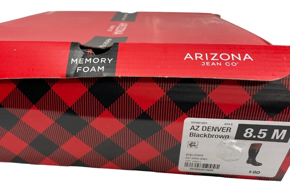 Department: Women Upper Material: Faux Leather Character: Boots Type: Boot Pattern: Solid Model: Denver Theme: American, Equestrian, Modern Style: Riding Boot US Shoe Size: 8.5 Shoe Width: M Shoe Shaft Style: Knee High Heel Height: Mid (2-2.9 in) Brand: Arizona Jean Co Heel Style: Block Accents: Buckle Features: Comfort, Lightweight, Memory Foam Closure: Zip Color: Black brown Occasion: Business, Casual, Party/Cocktail, Travel, Workwear Toe Shape: Round Toe