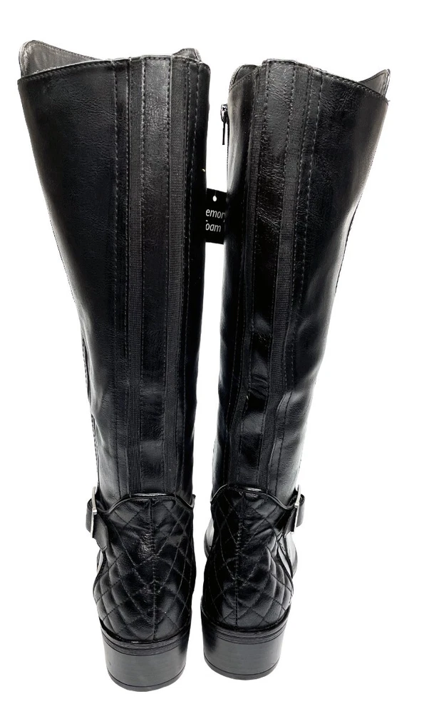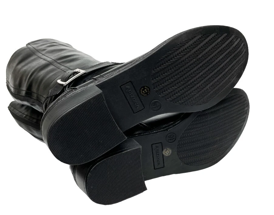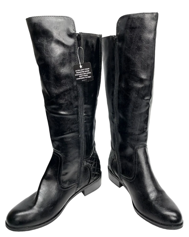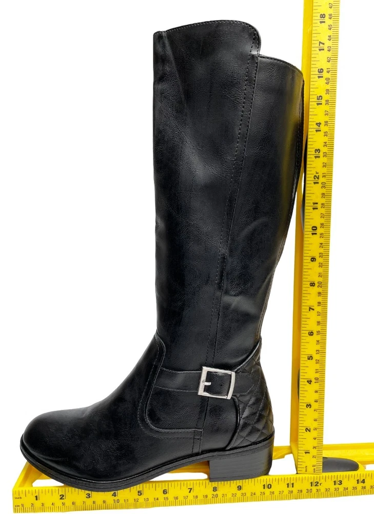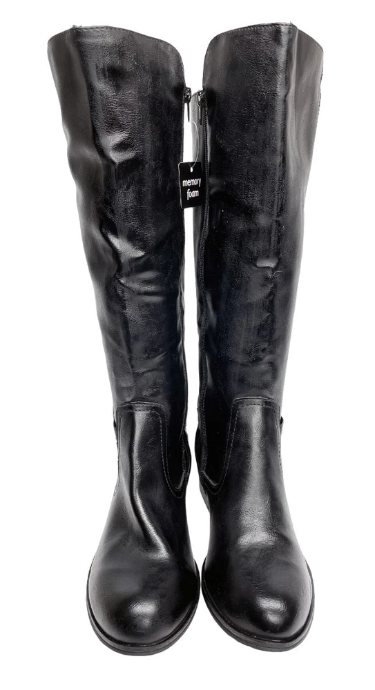 Upper Material: Faux Leather Type: Boot Pattern: Solid Character: Boots Features: Comfort, Lightweight, Memory Foam Model: Denver Color: Black Closure: Zip Heel Style: Block Calf Width: Wide Style: Riding Boot Brand: Arizona Jean Co Theme: American, Equestrian, Modern Shoe Shaft Style: Knee High Department: Women Heel Height: Low (1-1.9 in) Accents: Buckle Occasion: Business, Casual, Party/Cocktail, Travel, Workwear US Shoe Size: 7 Toe Shape: Round Toe Shoe Width: M