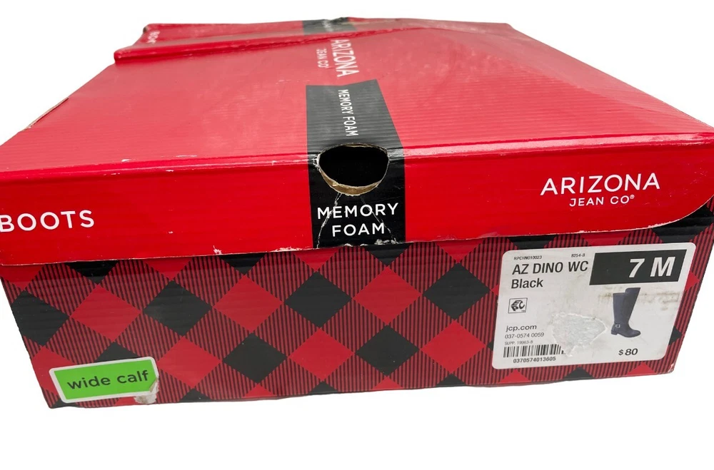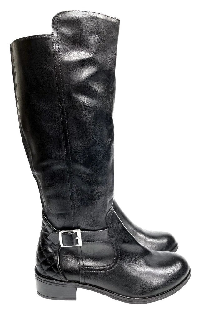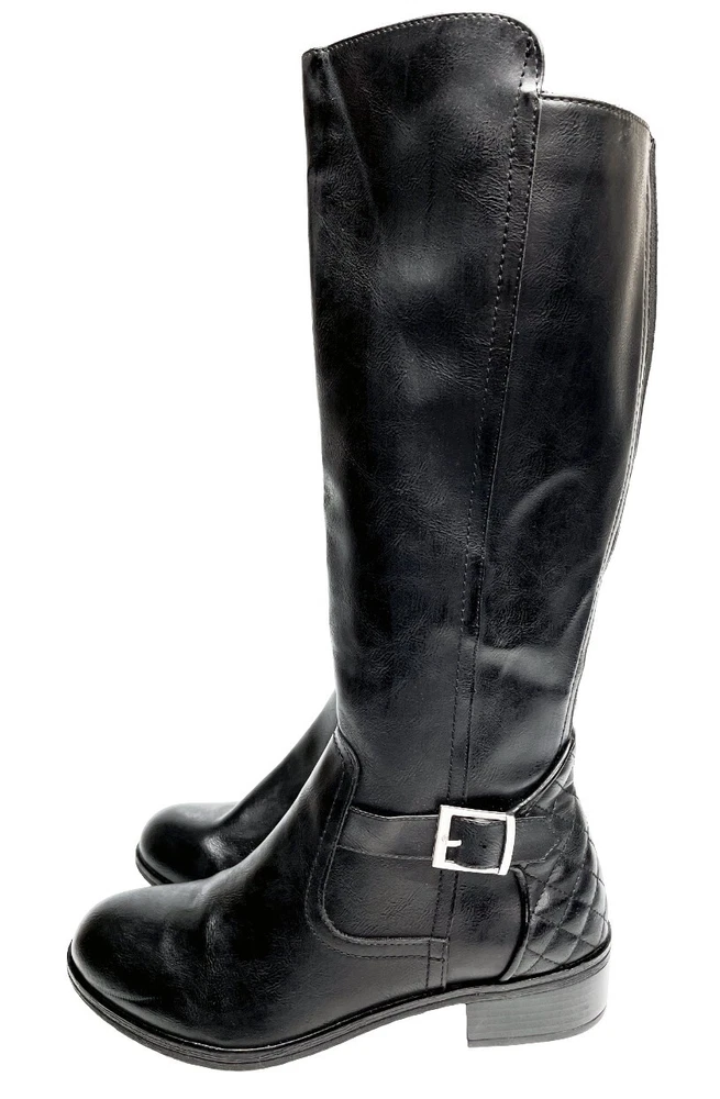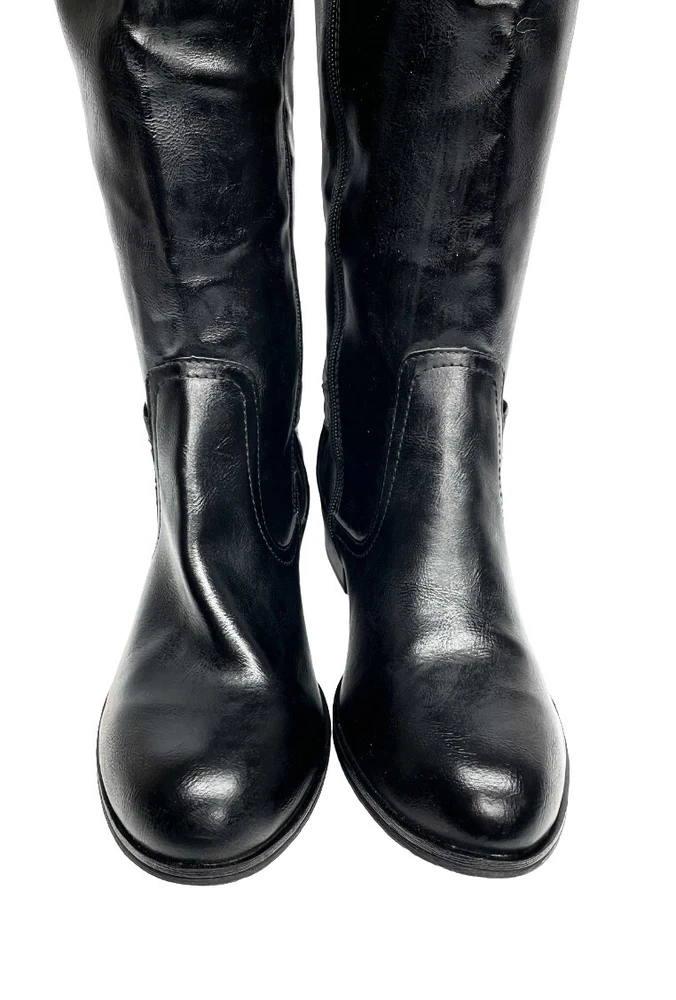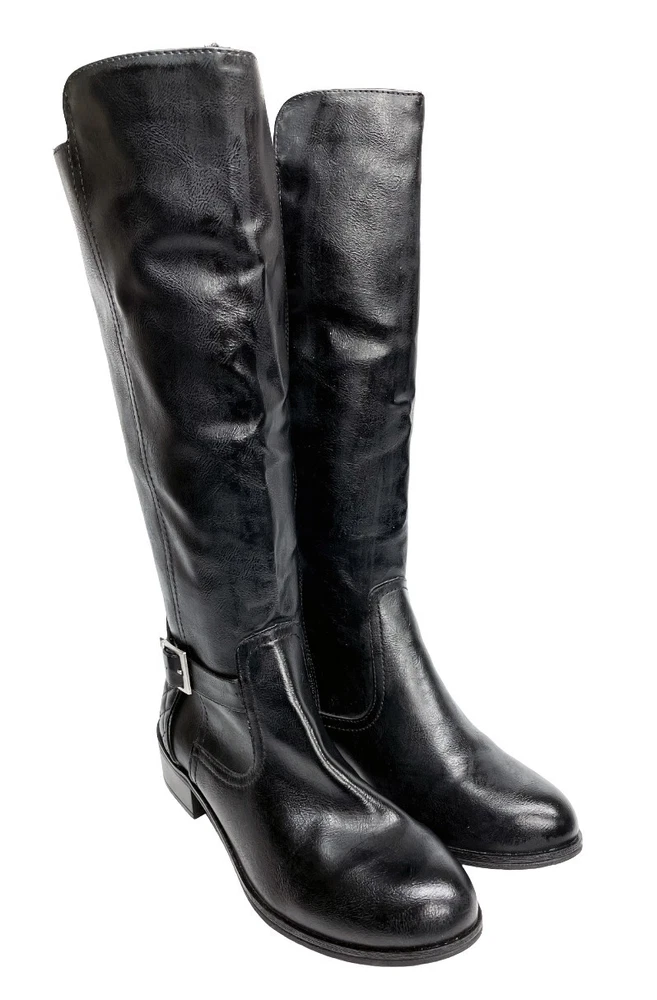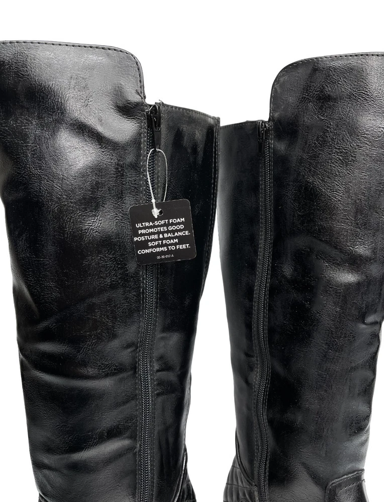 Upper Material: Faux Leather Type: Boot Pattern: Solid Character: Boots Features: Comfort, Lightweight, Memory Foam Model: Denver Color: Black Closure: Zip Heel Style: Block Calf Width: Wide Style: Riding Boot Brand: Arizona Jean Co Theme: American, Equestrian, Modern Shoe Shaft Style: Knee High Department: Women Heel Height: Low (1-1.9 in) Accents: Buckle Occasion: Business, Casual, Party/Cocktail, Travel, Workwear US Shoe Size: 7 Toe Shape: Round Toe Shoe Width: M