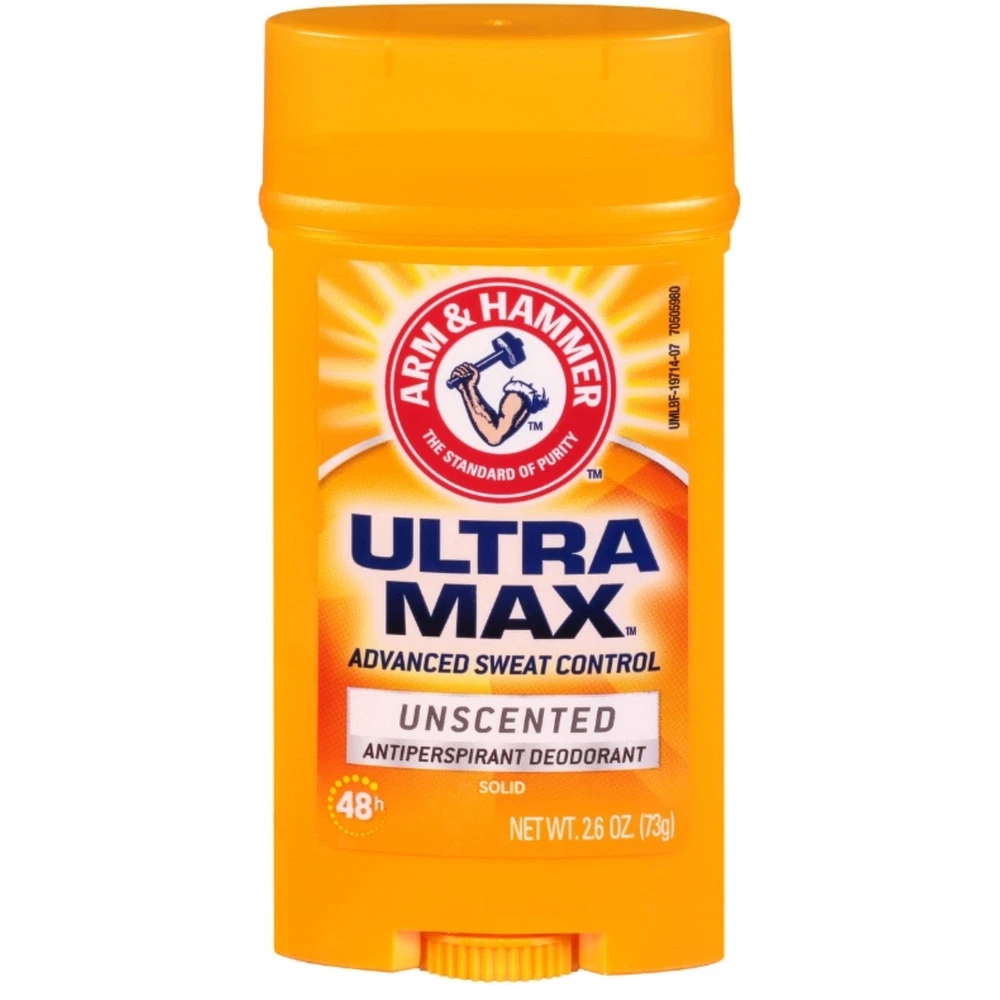 Product Description Arm & Hammer Ultra-max Antiperspirant & Deodorant, Invisible Solid, Unscented, 2.6 Ounce (Pack Of 2) ARM & HAMMER ULTRA MAX deodorant decreases underarm wetness and reduces underarm sweating due to stress. With ULTRA MAX, the natural power of baking soda helps fights odors so you can feel and smell your best and confidently go about your day. Sweat and odor can be a problem for men and women, but with ARM & HAMMER ULTRA MAX you can stay ULTRA fresh! 2.6 oz solid deodorant stick provides Unscented protection. ANTIPERSPIRANT DEODORANT: Solid deodorant stick decreases underarm perspiration POWER OF BAKING SODA: Made from ARM & HAMMER Baking Soda, a natural deodorizer, to help you feel and smell your best ODOR CONTROL: Baking Soda helps to absorb and fight odor, so you don’t have to WORKS AS HARD AS YOU DO: Reduces underarm sweat due to stress ARM & HAMMER ULTRA MAX: Protection you can count on! Combatting Underarm Wetness and Sweating: The deodorant is formulated to combat underarm wetness and excessive sweating, particularly stemming from stress-induced conditions. Utilizes Baking Soda's Potency: Harnesses the innate potency of baking soda, a natural ingredient known for its odor-neutralizing and antibacterial properties. Refreshing and Confident Aura: Aims to provide a refreshing and confident aura throughout the day by targeting and diminishing odor effectively. Shield Against Body Odor: Offers a shield against unwanted body odor, empowering individuals to move through their daily routines with assurance and comfort. Dry and Fresh Sensation: The innovative blend in Ultra Max is stated to help maintain a dry and fresh sensation, contributing to an enhanced sense of well-being. Reliability and Science-Backed Efficiency: Emphasizes reliability by combining personal care with science-backed efficiency to help users face each day with confidence and poise. Ingredients Active Ingredients: Aluminum Zirconium Tetrachlorohydrex Gly (19%) Inactive Ingredients: Cyclopentasiloxane; PPG-14 Butyl Ether; Stearyl Alcohol; Ethylhexyl Isononanoate; Hydrogenated Castor Oil; Talc; Petrolatum; Ethylene Brassylate; Sodium Bicarbonate (Baking Soda); PEG-25 Propylene Glycol Stearate; Silica; Corn Starch Modified; Polysaccharides; Maltodextrin