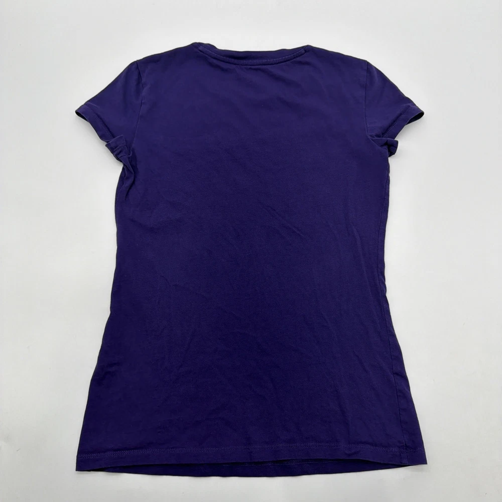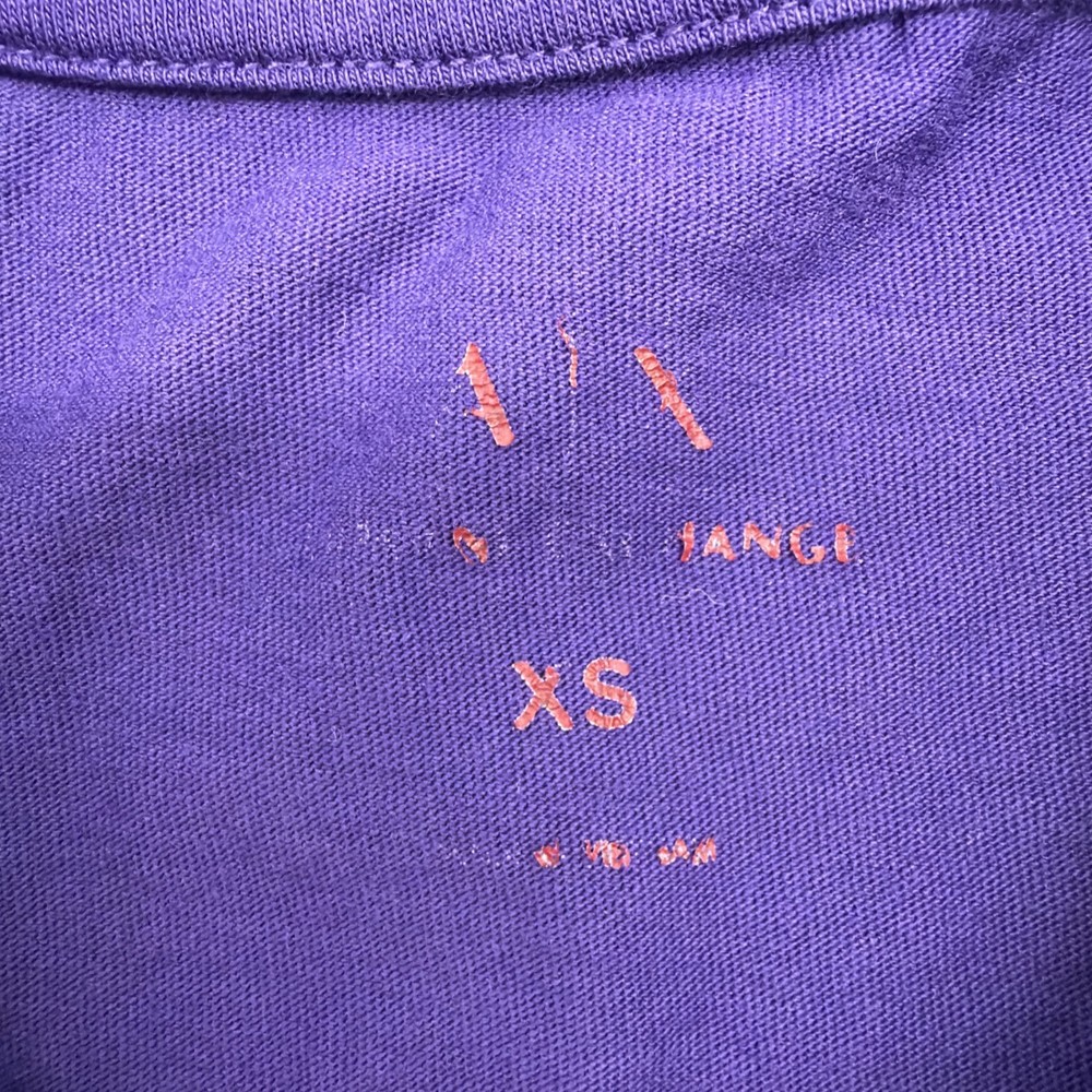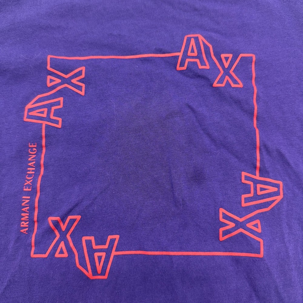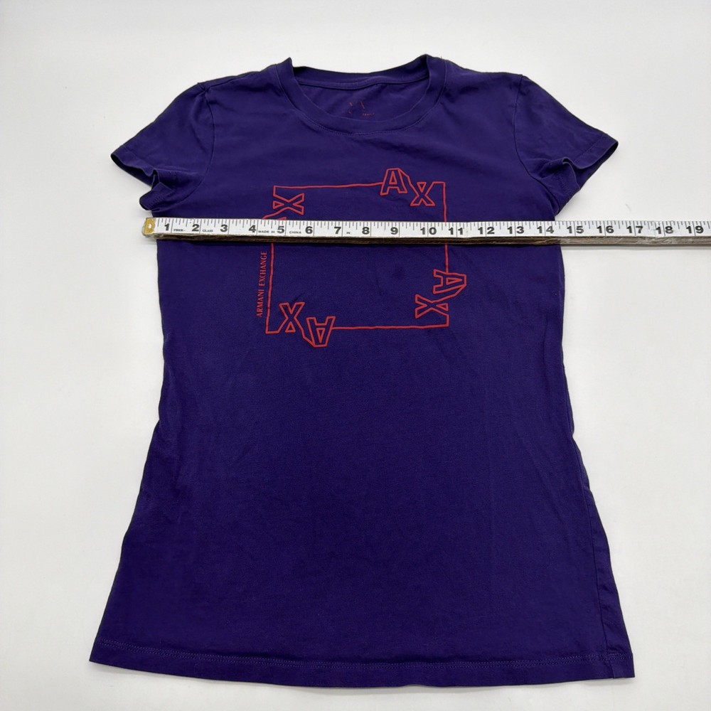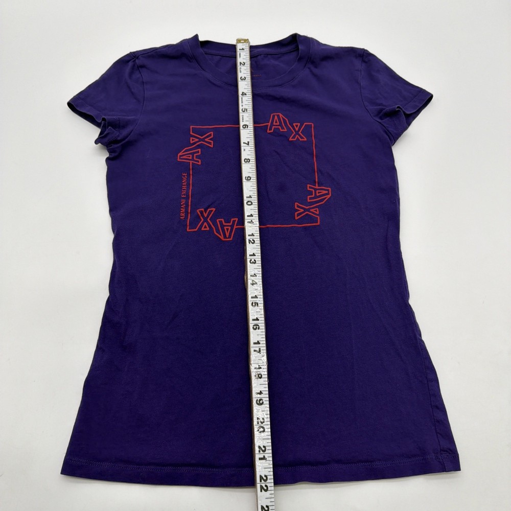 The Armani Exchange Slim T-shirt for women in XS size features a purple graphic print logo, making it a stylish and trendy addition to any wardrobe. Made of comfortable cotton material, this short sleeve t-shirt with a crew neck offers a slim fit for a flattering look. With its designer brand, colorful theme, and classic style, this t-shirt is perfect for fall and spring seasons. Perfect for adding a touch of luxury and fashion to any outfit. Check pictures for flaws and measurements