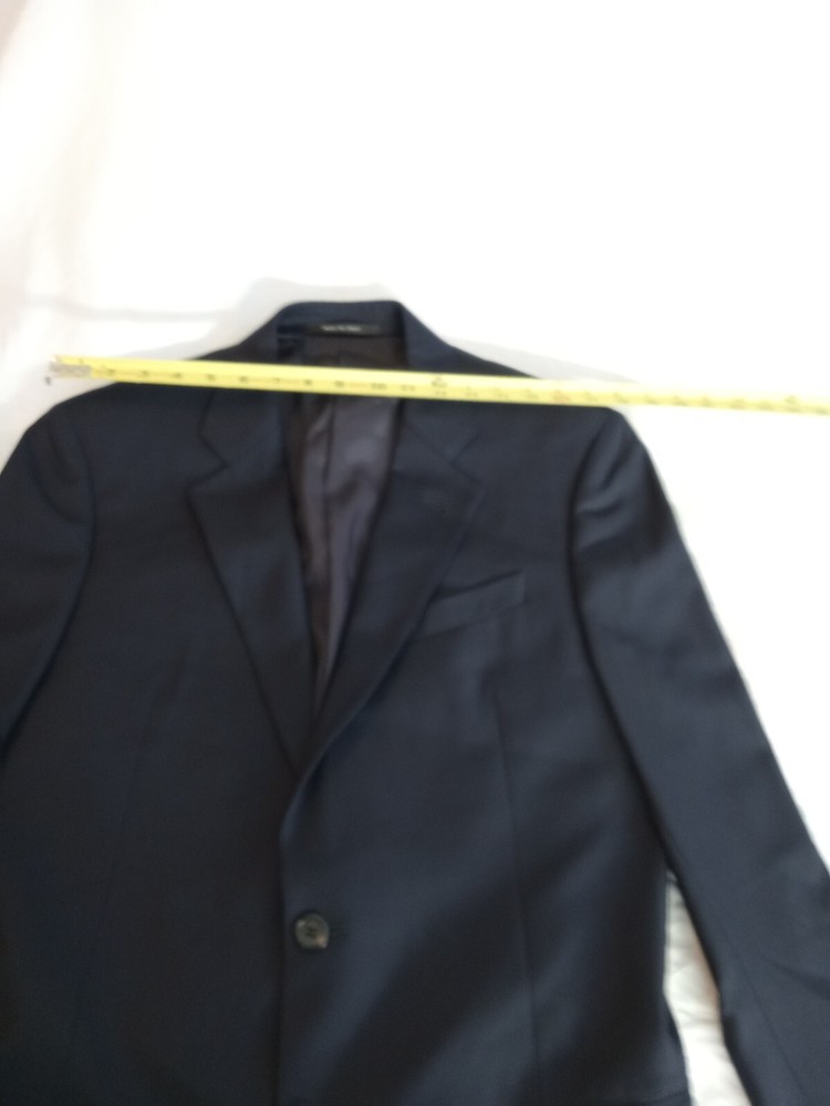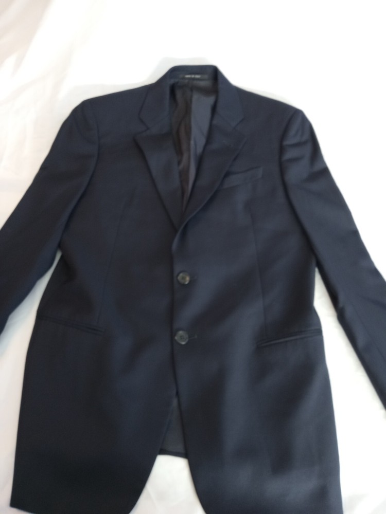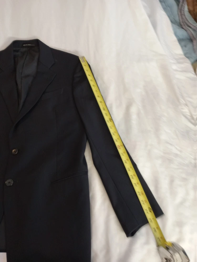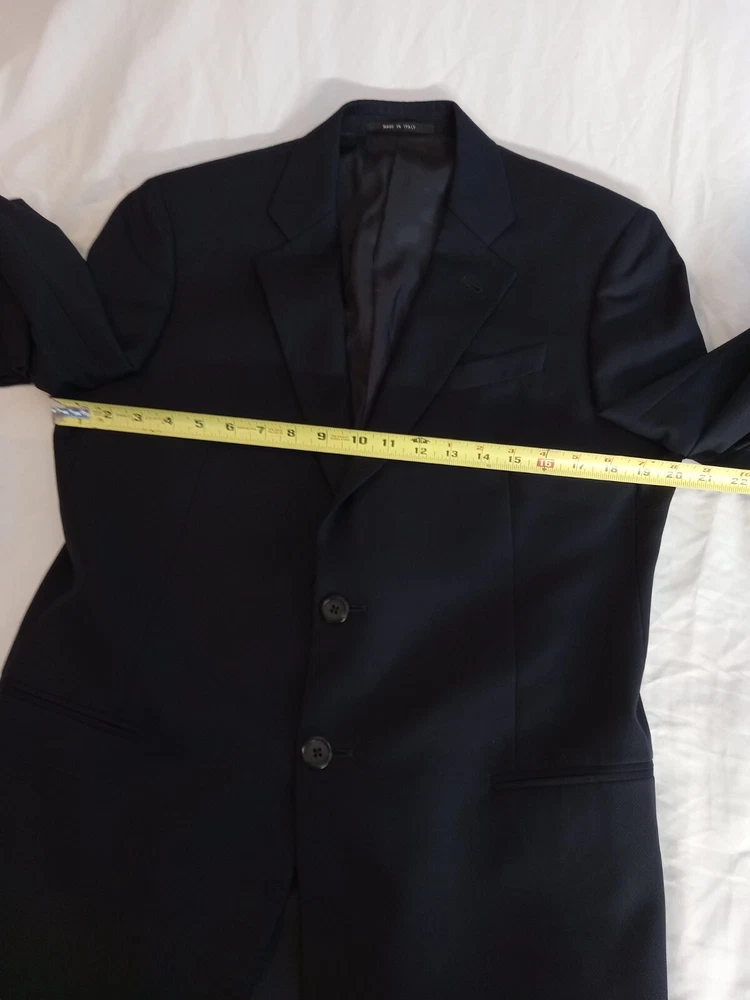 This is a men's Armani suit coat sports blazer in navy blue, tailored by Nordstrom and made in Italy. The blazer features a stylish and sophisticated sports blazer style. With the Armani brand name attached, you can expect high-quality craftsmanship and attention to detail in this tailored piece. Perfect for formal occasions or adding a touch of elegance to a more casual outfit, this blazer is a versatile and timeless addition to any man's wardrobe. There is no label referencing size, but from the measurements it would seem to be a size 40. So, please note the following measurements. To aid in buying clothing online, take a jacket that fits you well, lay it on your bed, smoothing out the wrinkles and taking four (4) measurements. The first would be from shoulder seam to shoulder seam. The second would be from armpit to armpit. The third would be from the center of the back collar seam to the hem and the fourth would be from the shoulder seam to the sleeve cuff. The following measurements are from this jacket: 1.) From shoulder seam to shoulder seam: 18 inches 2.) From armpit to armpit: 20 inches 3.) From center of back collar seam to the hem: 30 inches 4.) From shoulder seam to sleeve cuff: 25 inches
