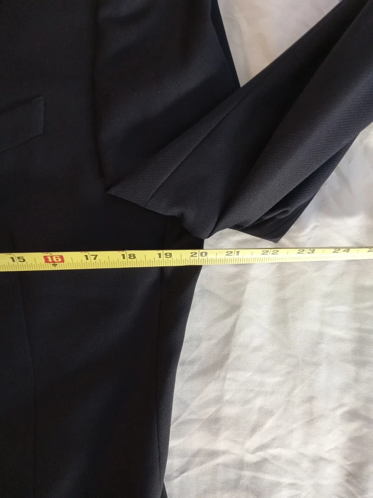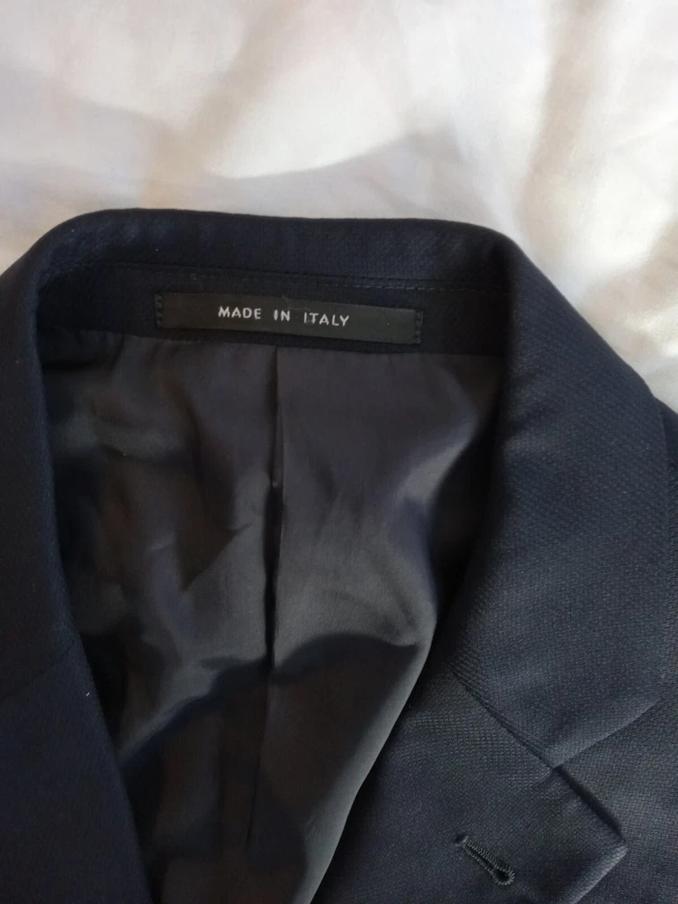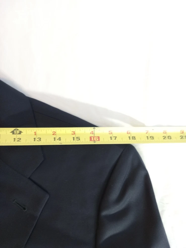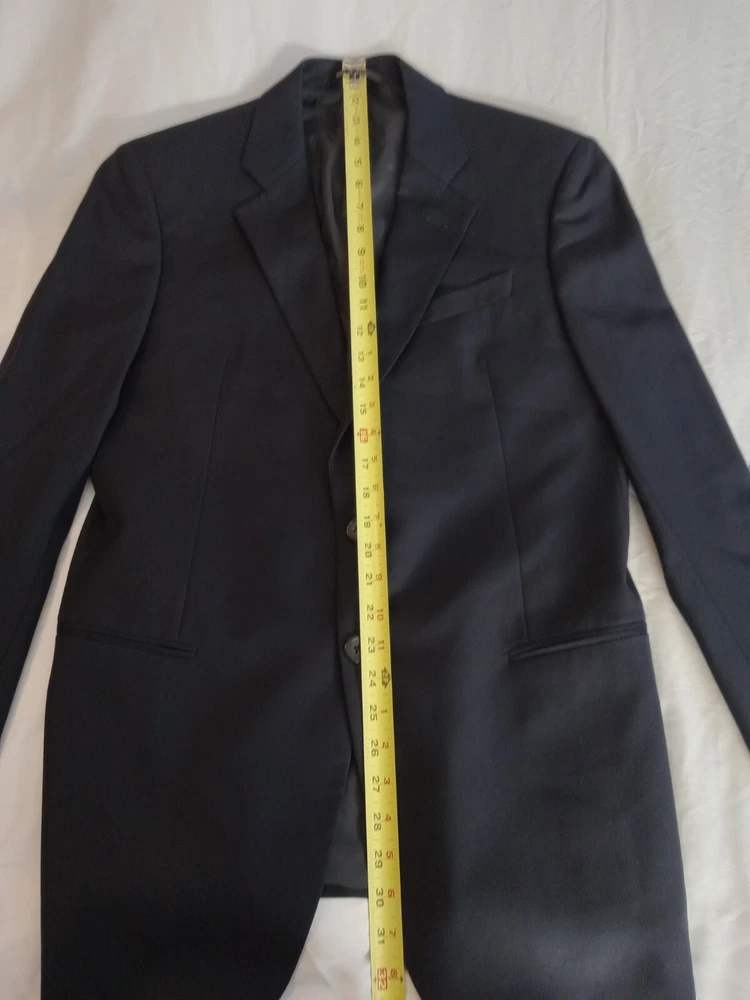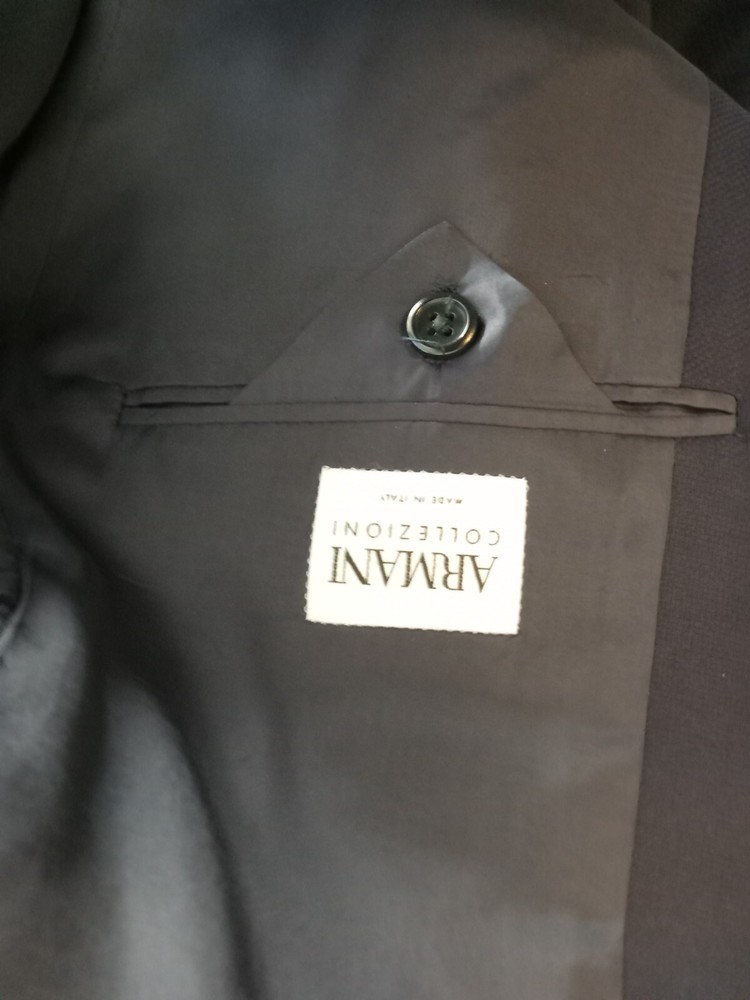This is a men's Armani suit coat sports blazer in navy blue, tailored by Nordstrom and made in Italy. The blazer features a stylish and sophisticated sports blazer style. With the Armani brand name attached, you can expect high-quality craftsmanship and attention to detail in this tailored piece. Perfect for formal occasions or adding a touch of elegance to a more casual outfit, this blazer is a versatile and timeless addition to any man's wardrobe. There is no label referencing size, but from the measurements it would seem to be a size 40. So, please note the following measurements. To aid in buying clothing online, take a jacket that fits you well, lay it on your bed, smoothing out the wrinkles and taking four (4) measurements. The first would be from shoulder seam to shoulder seam. The second would be from armpit to armpit. The third would be from the center of the back collar seam to the hem and the fourth would be from the shoulder seam to the sleeve cuff. The following measurements are from this jacket: 1.) From shoulder seam to shoulder seam: 18 inches 2.) From armpit to armpit: 20 inches 3.) From center of back collar seam to the hem: 30 inches 4.) From shoulder seam to sleeve cuff: 25 inches